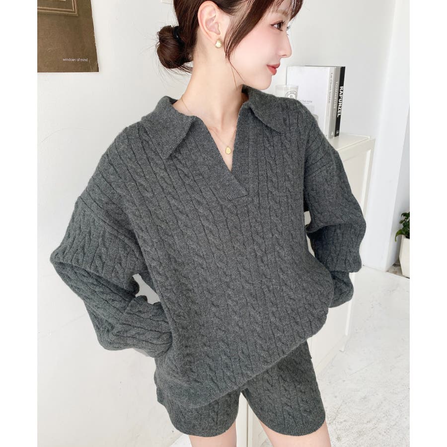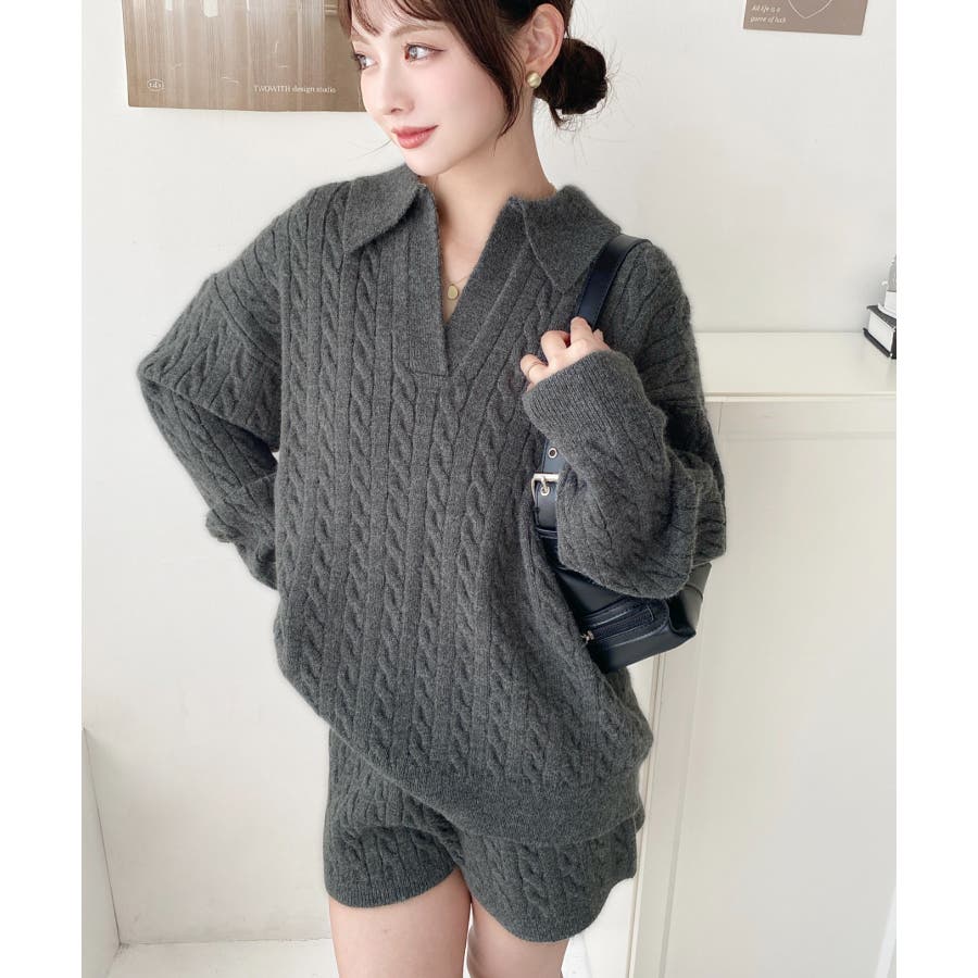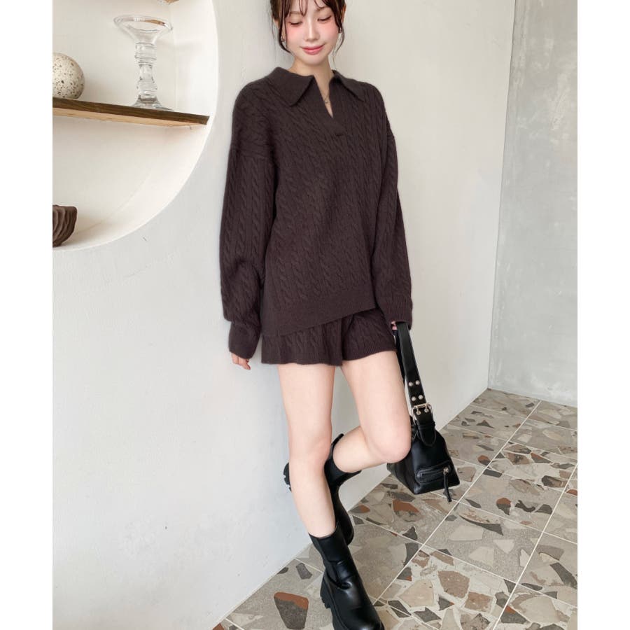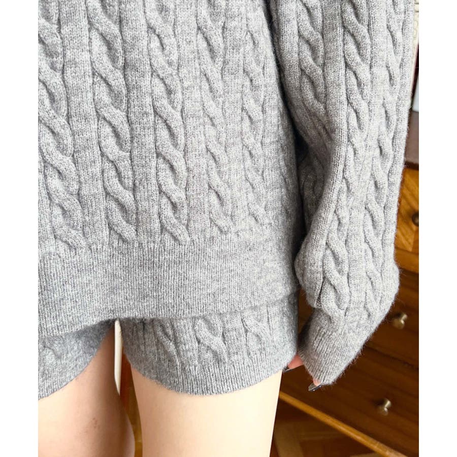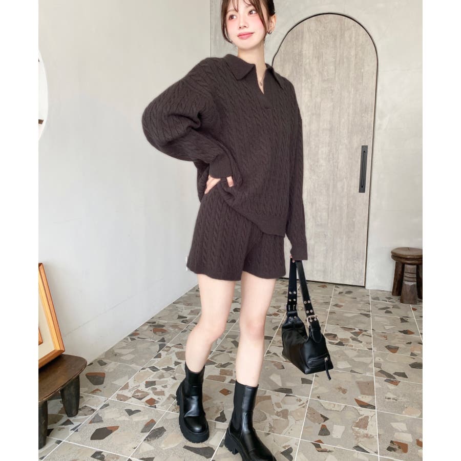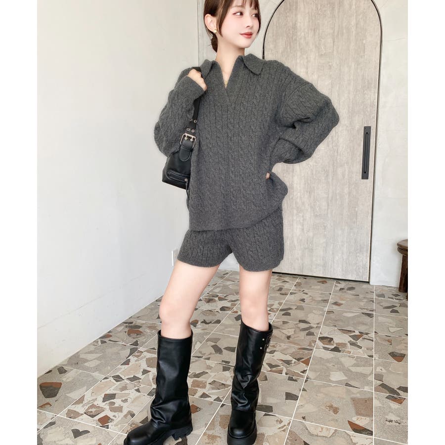 《セットアップ》ケーブル編みポロ&ショートパンツセットアップニット