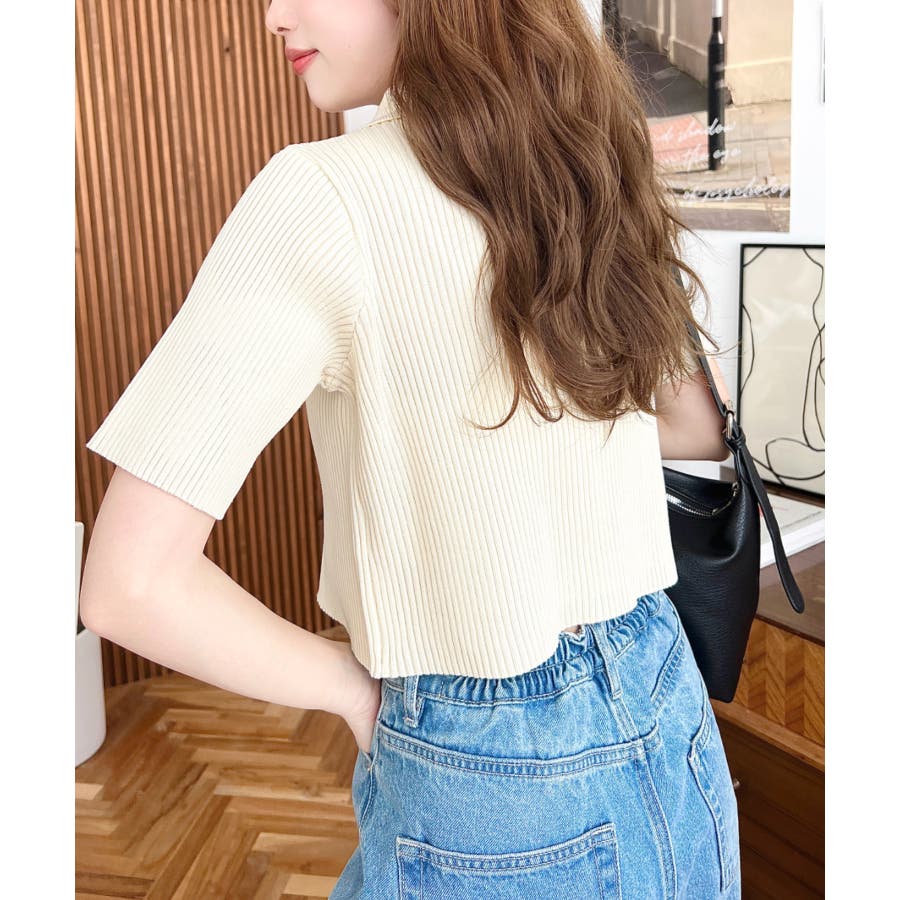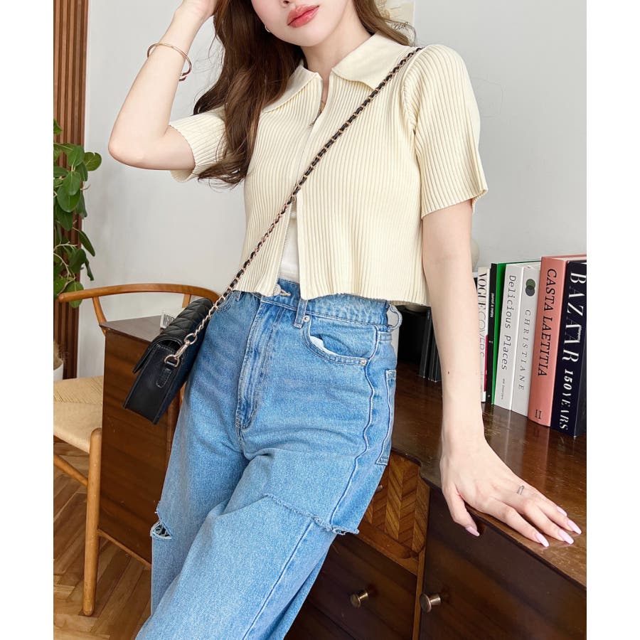 ・襟付きのきちんと感を組み合わせたトレンド感溢れる半袖ニットカーディガン。