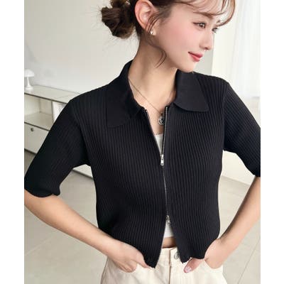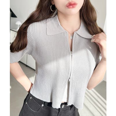 Wジップ衿付き半袖ニットカーディガン