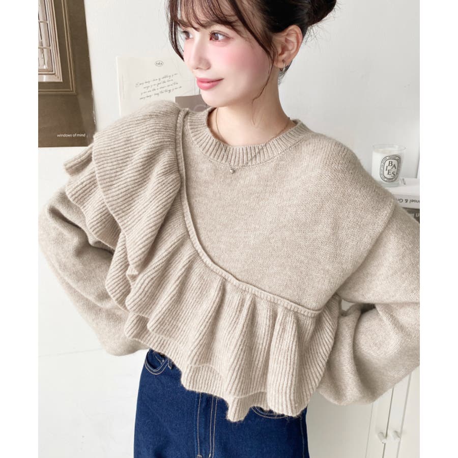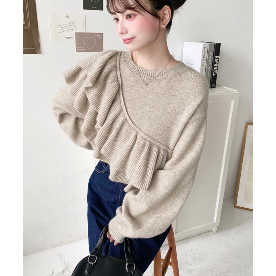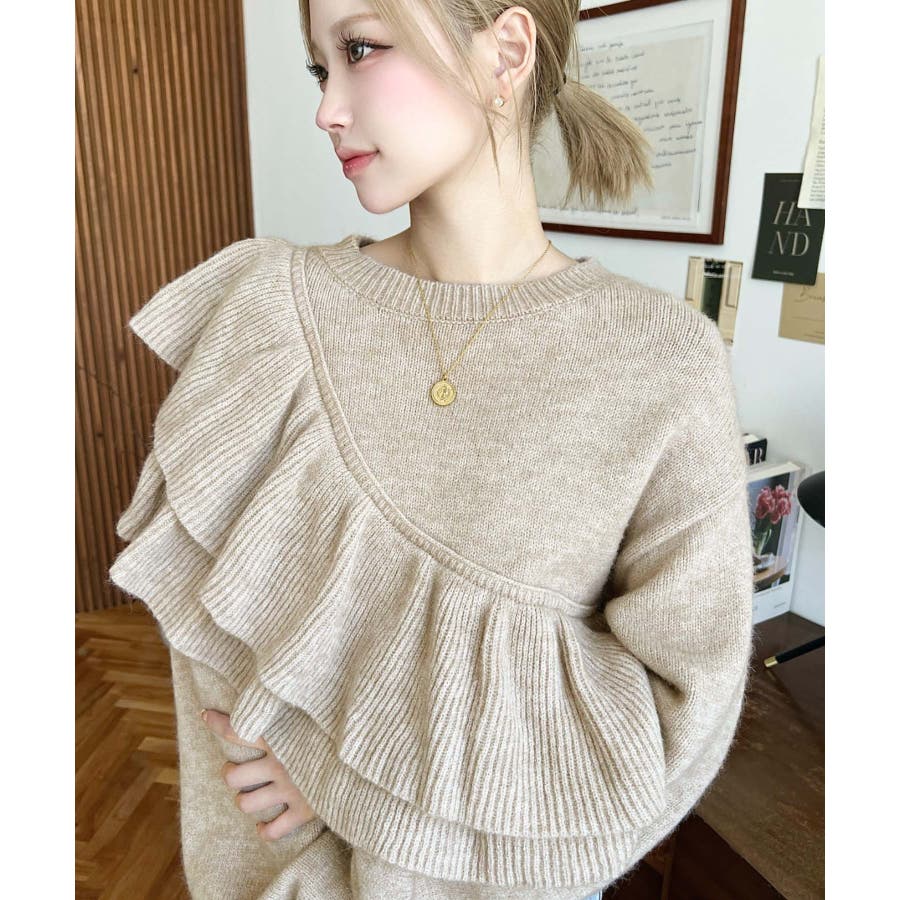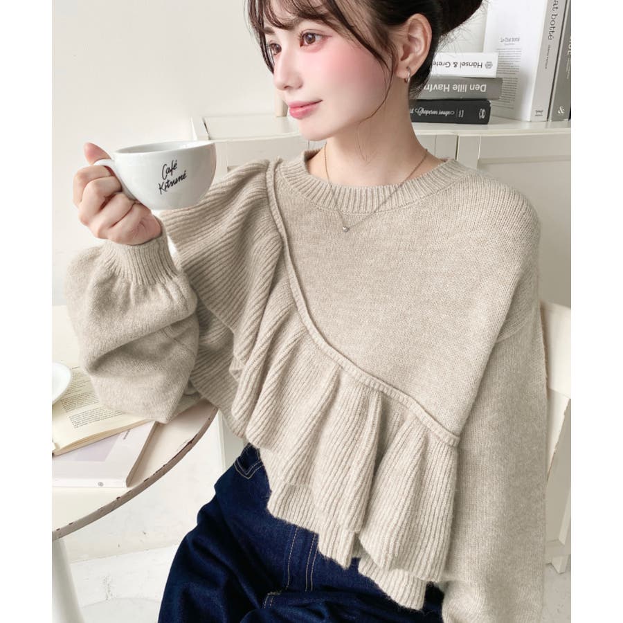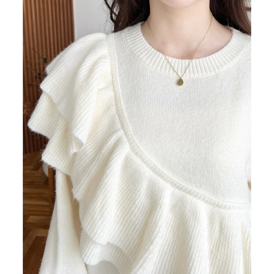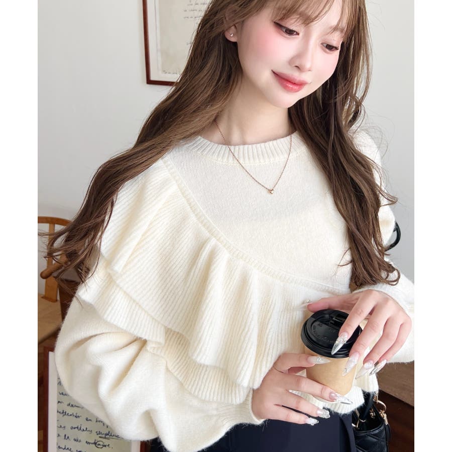 大きめのアシメフリルが顔まわりを華やかに見せてくれ、コーデの主役になるフェミニンさがお気に入りのニットです♪