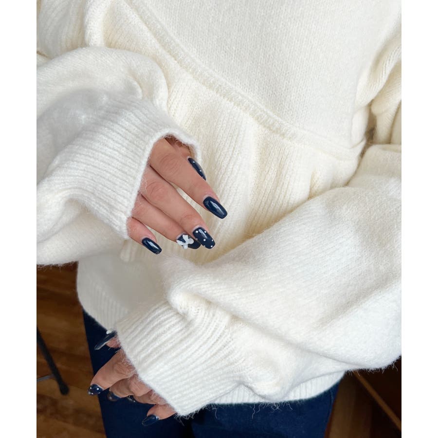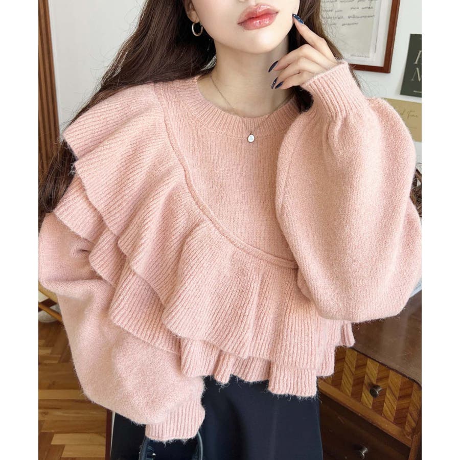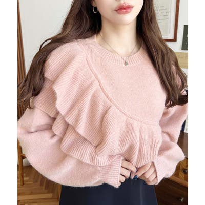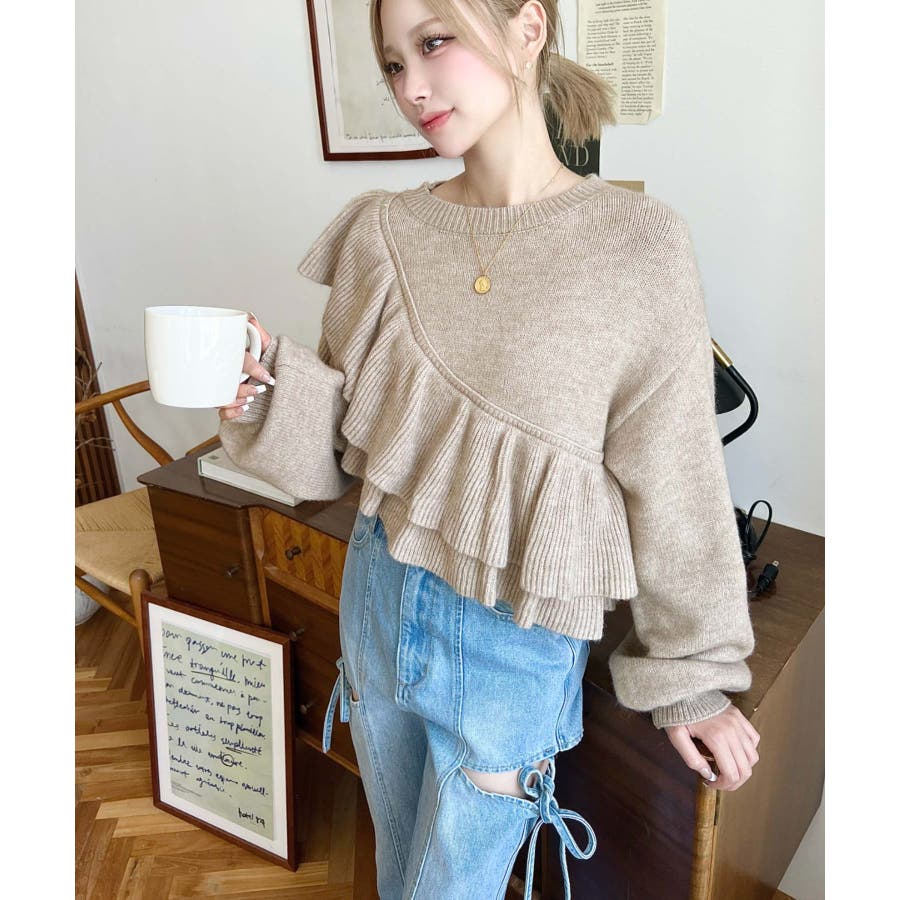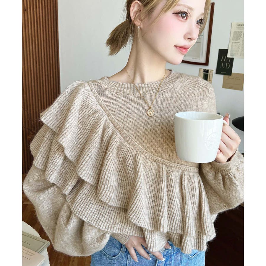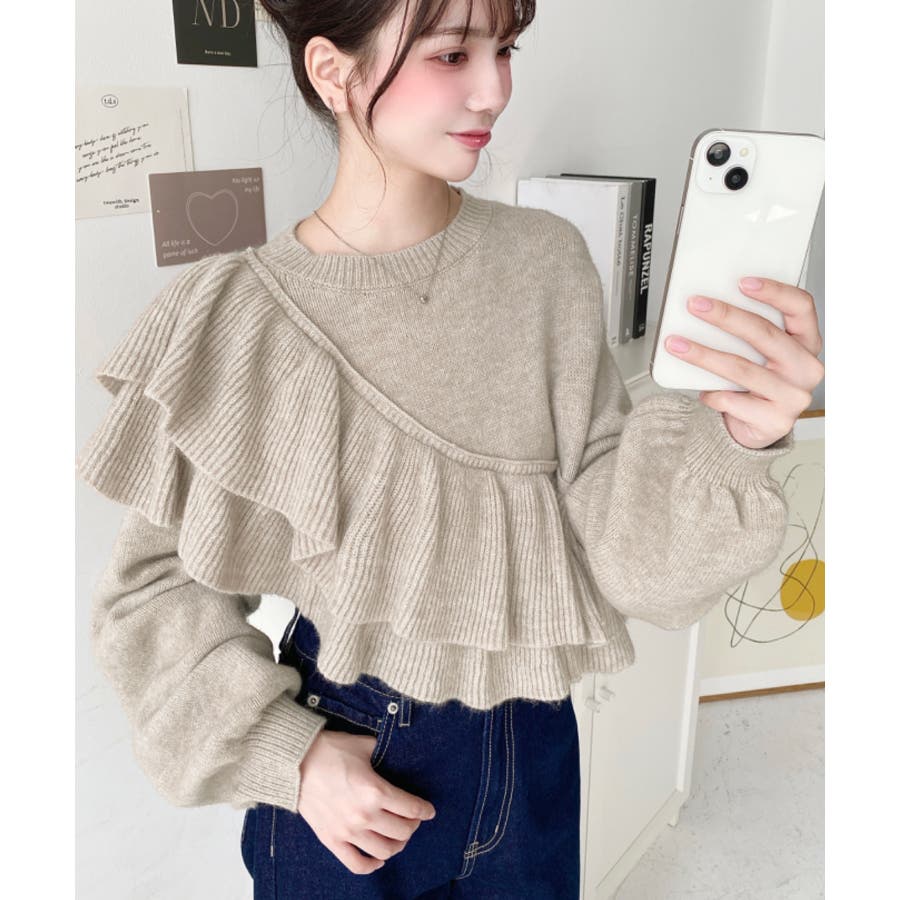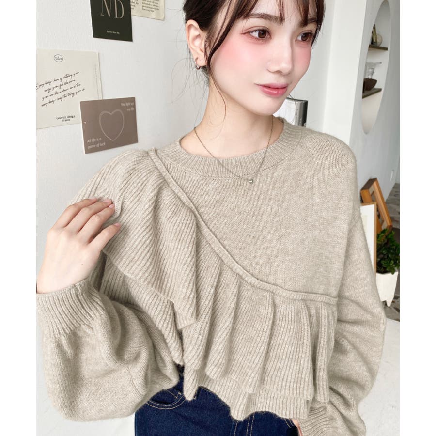 大きめのアシメフリルが顔まわりを華やかに見せてくれ、コーデの主役になるフェミニンさがお気に入りのニットです♪