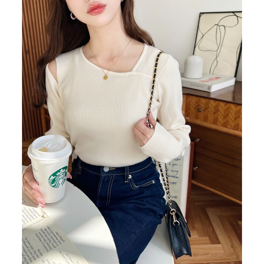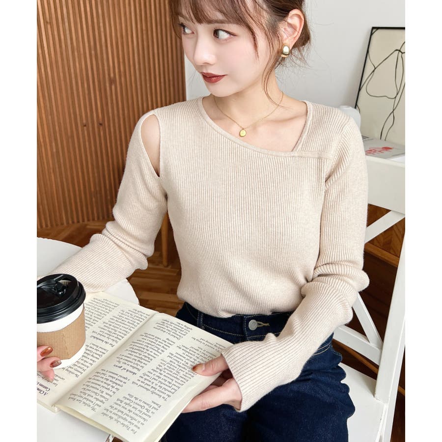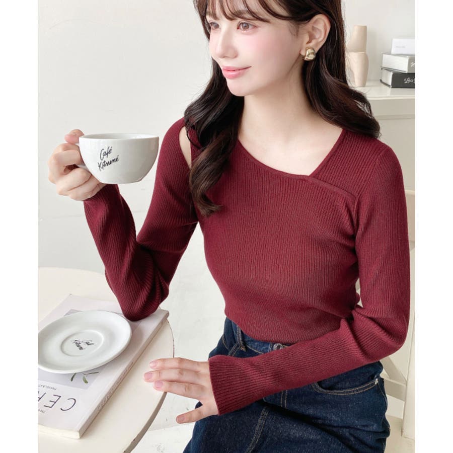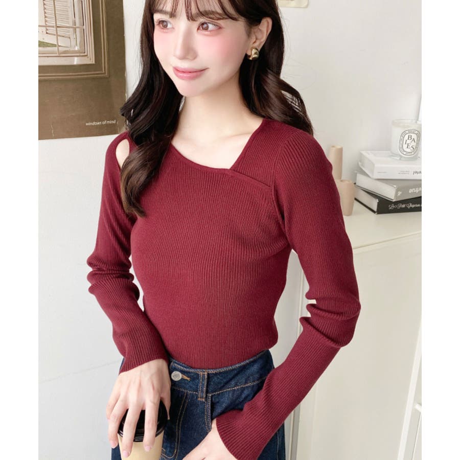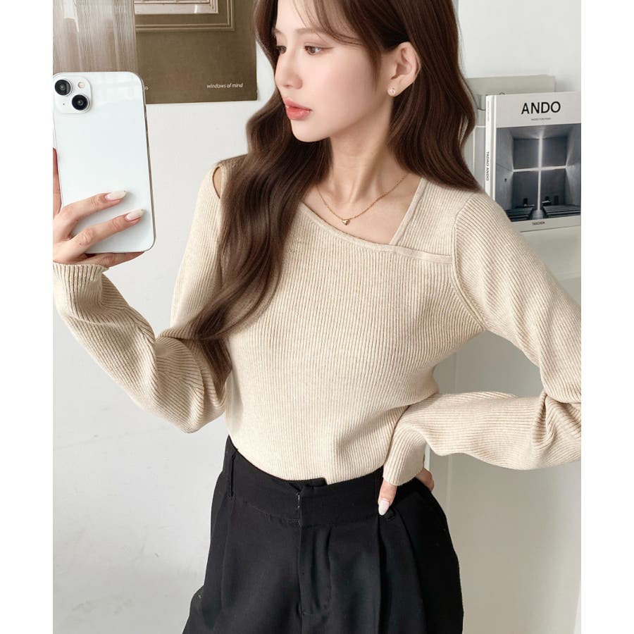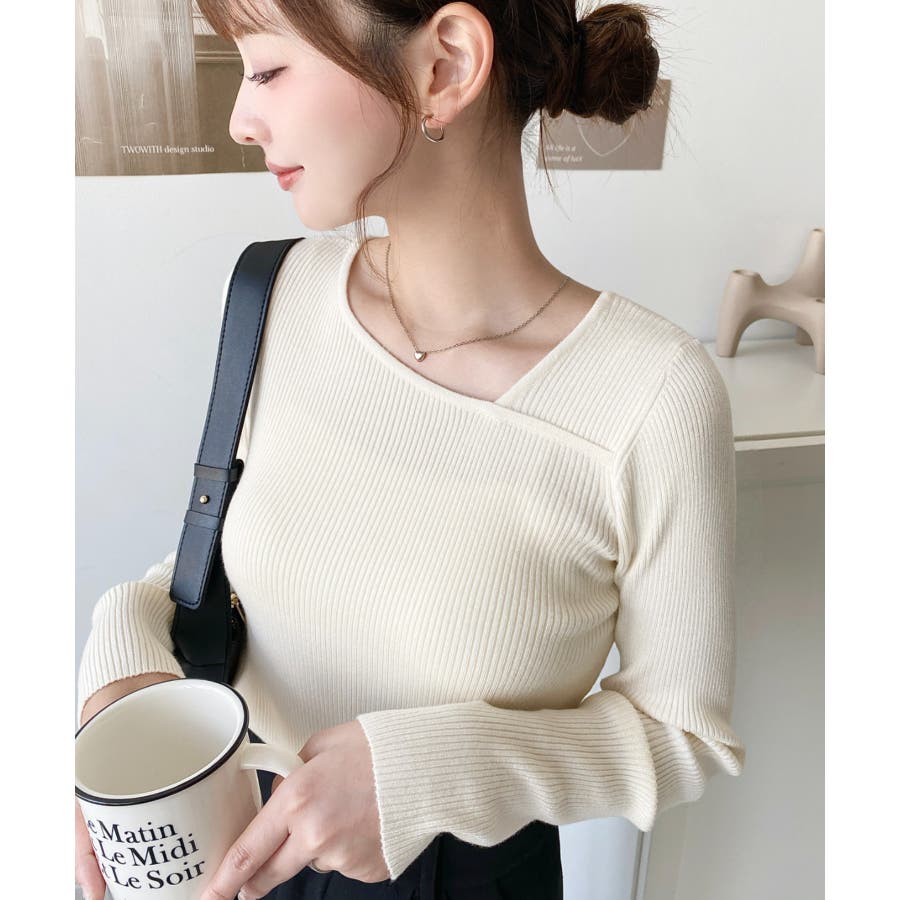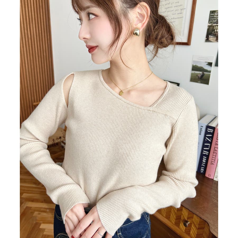 ・アシンメトリーな首元のデザインでヘルシーな程よい肌見せがポイントのニットトップス!