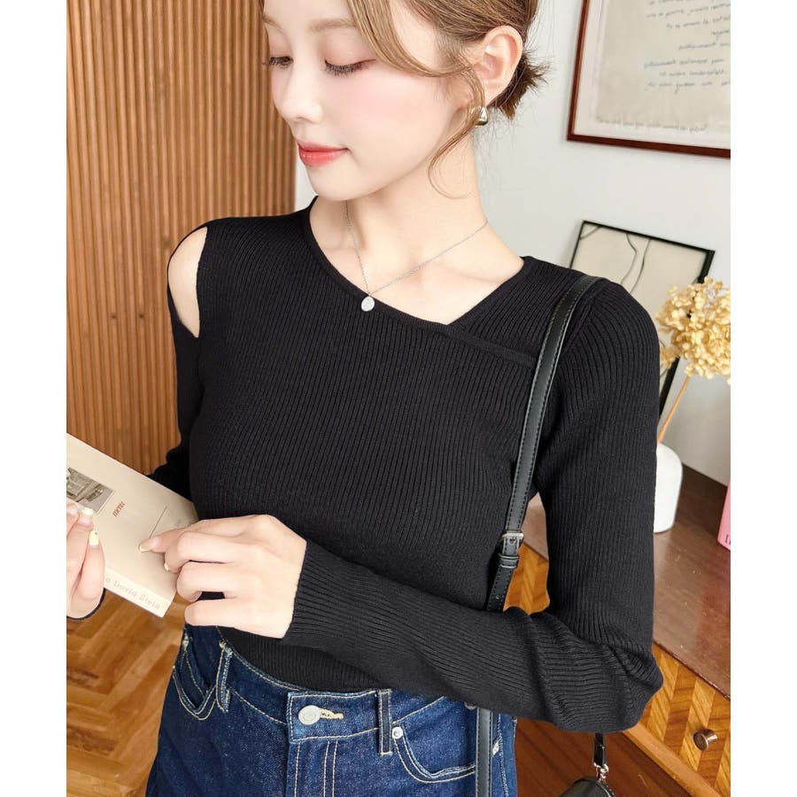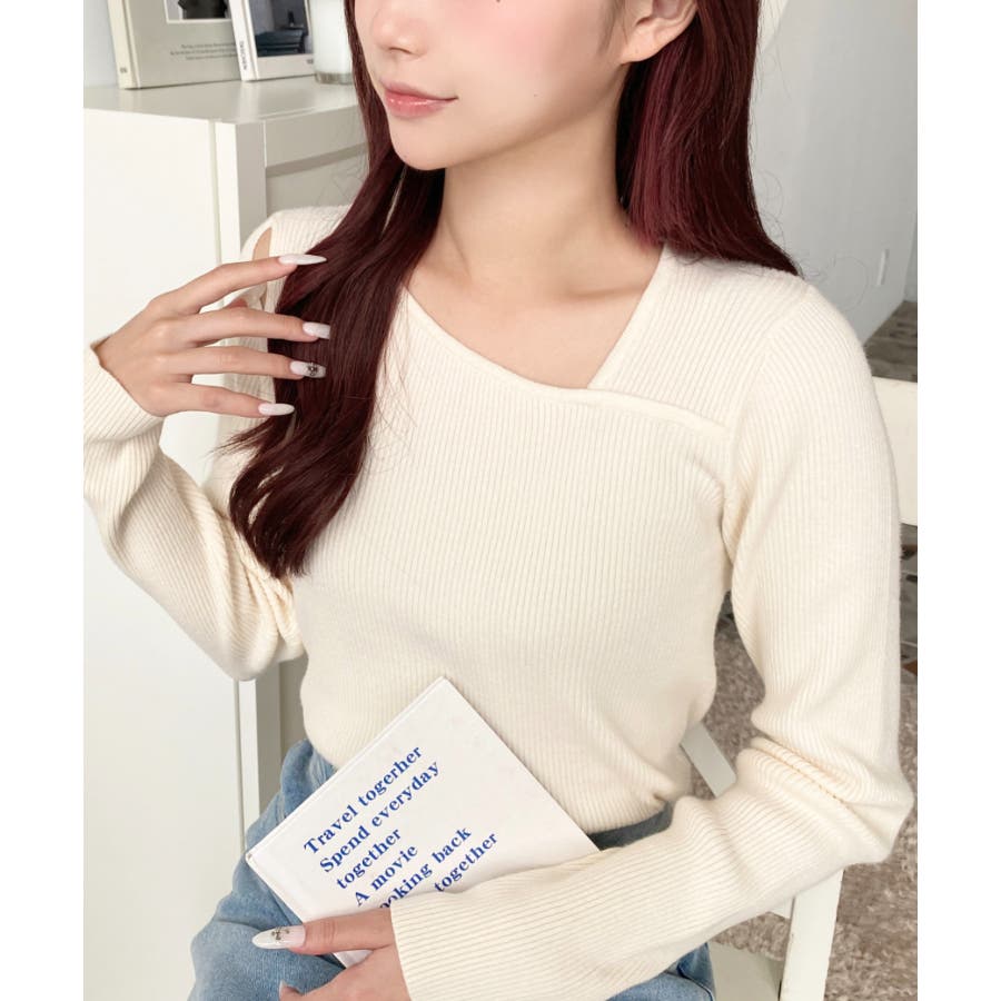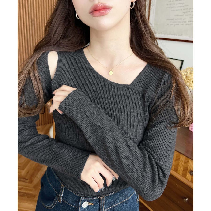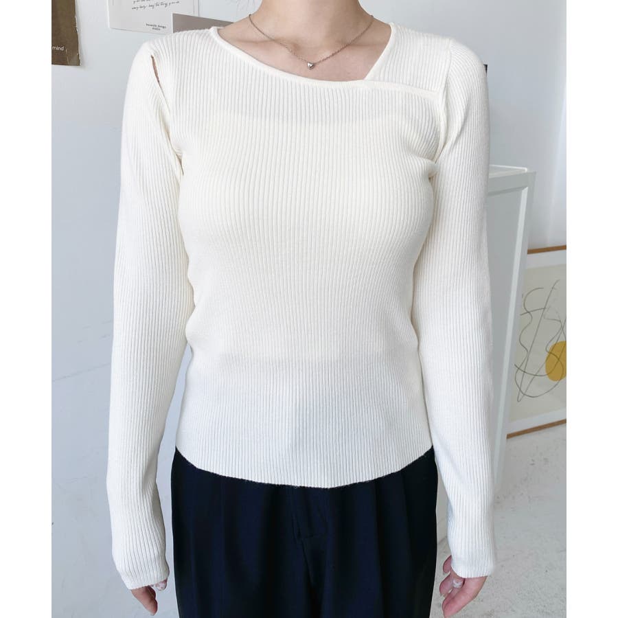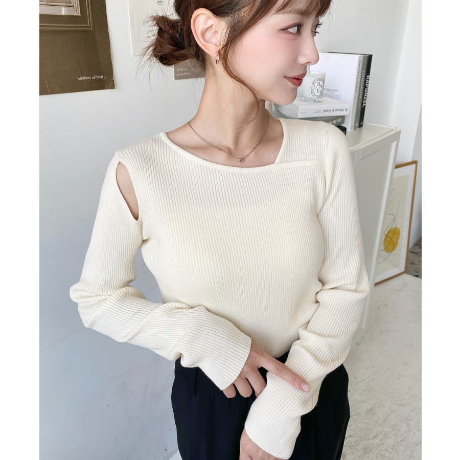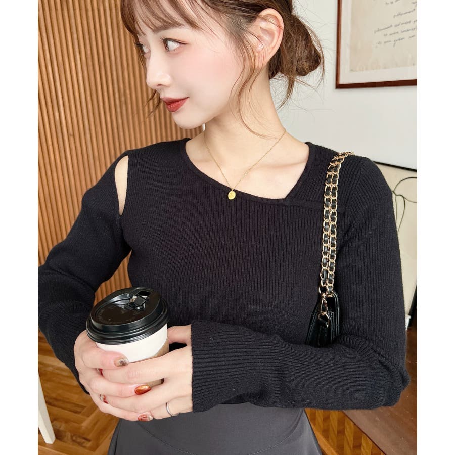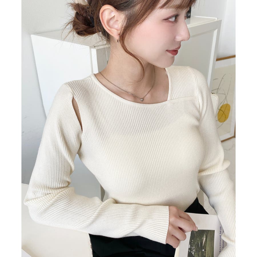 ・アシンメトリーな首元のデザインでヘルシーな程よい肌見せがポイントのニットトップス!