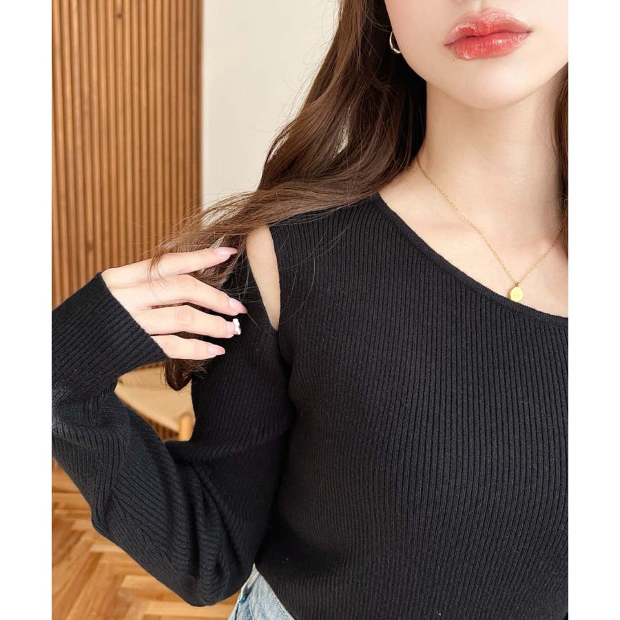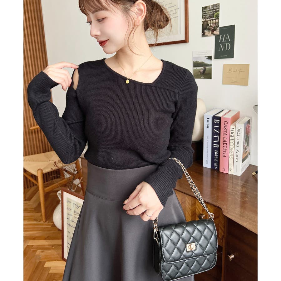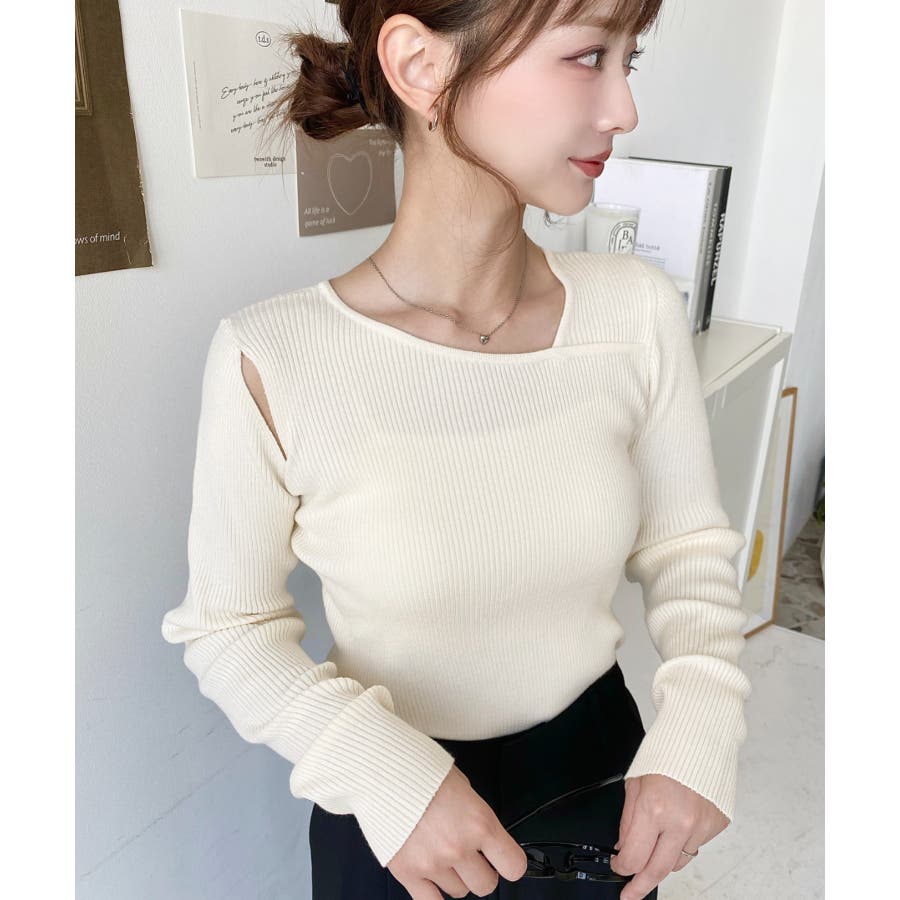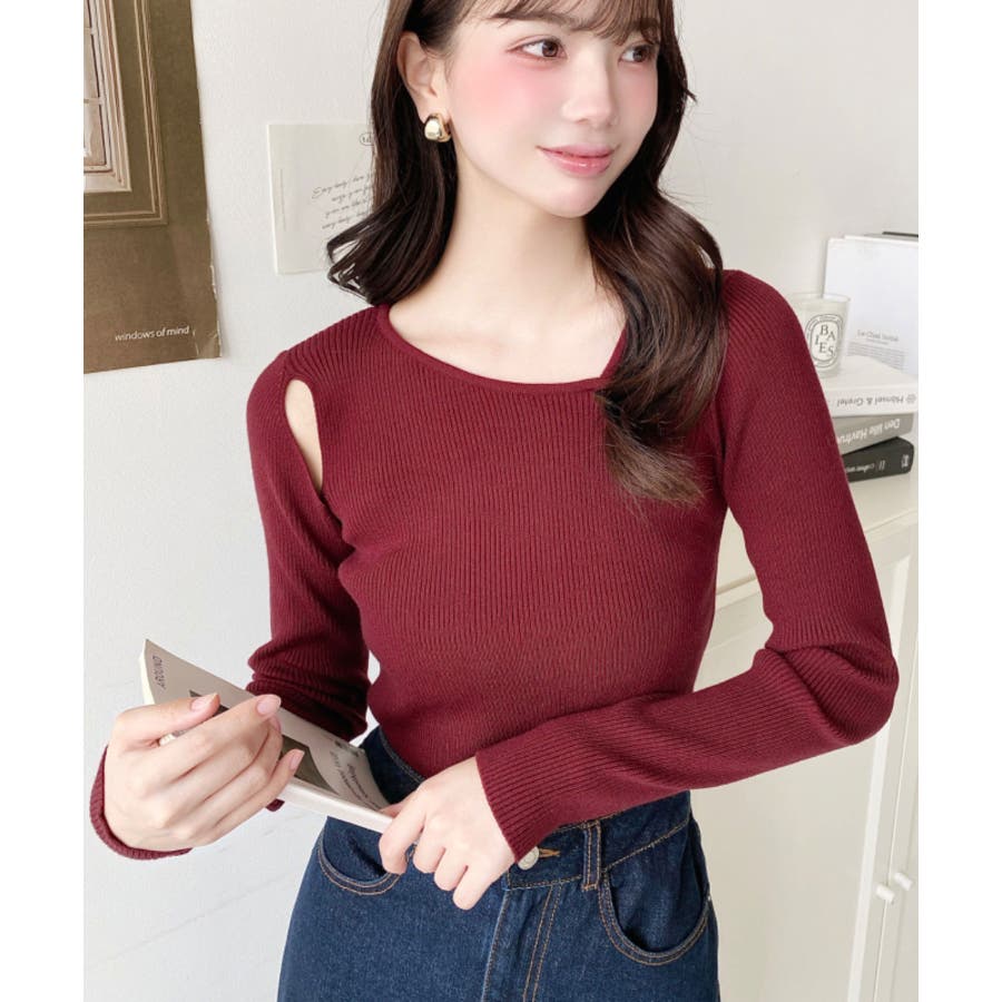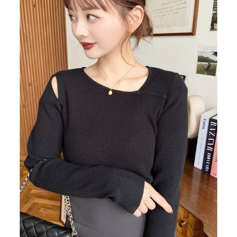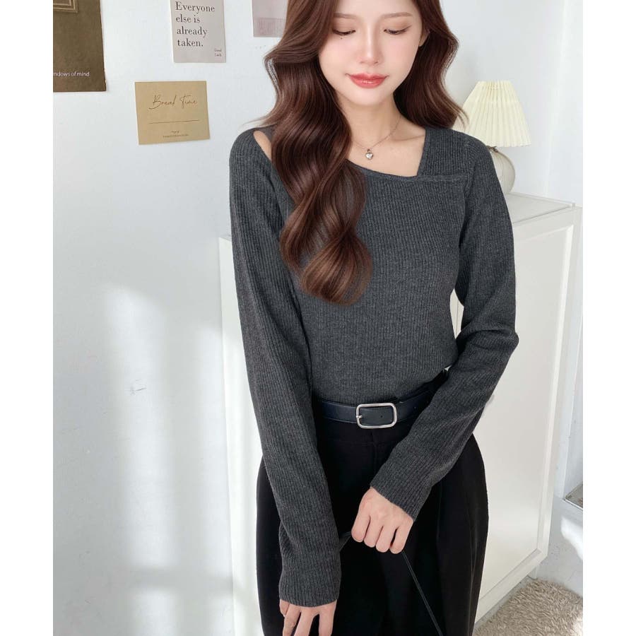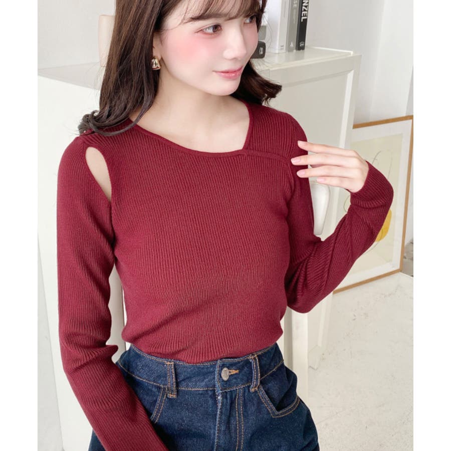 ・アシンメトリーな首元のデザインでヘルシーな程よい肌見せがポイントのニットトップス!