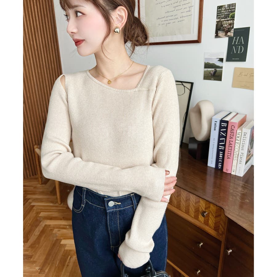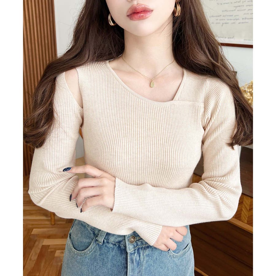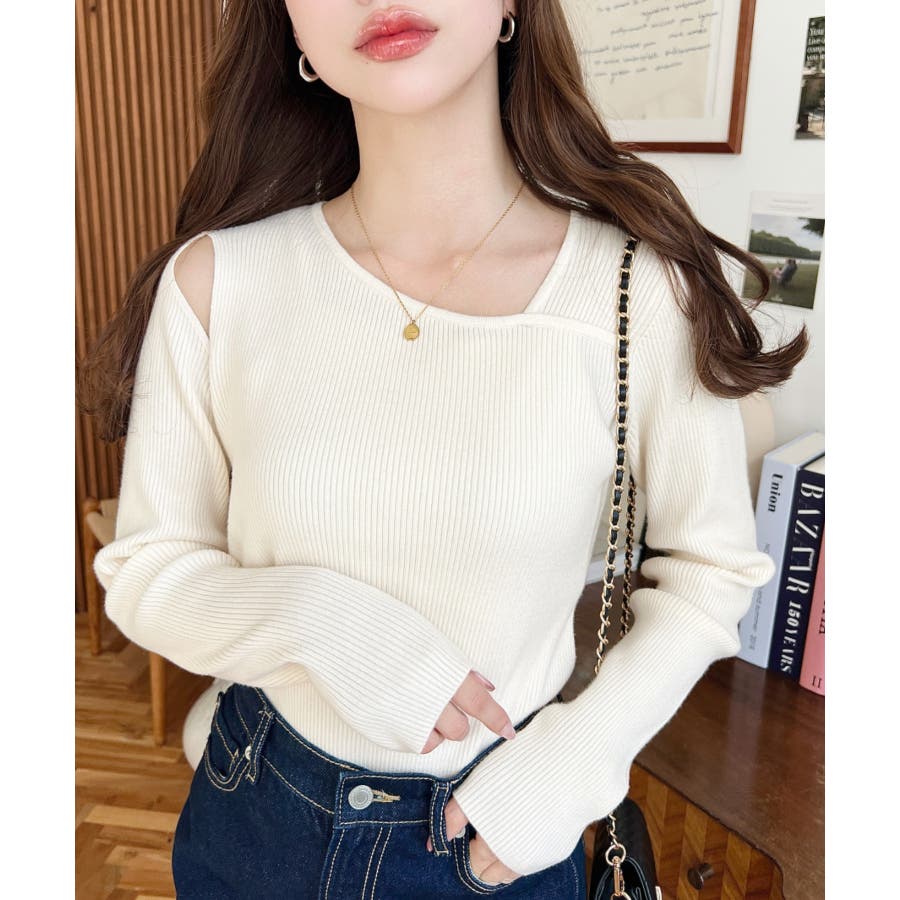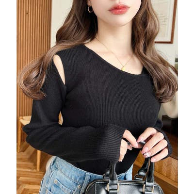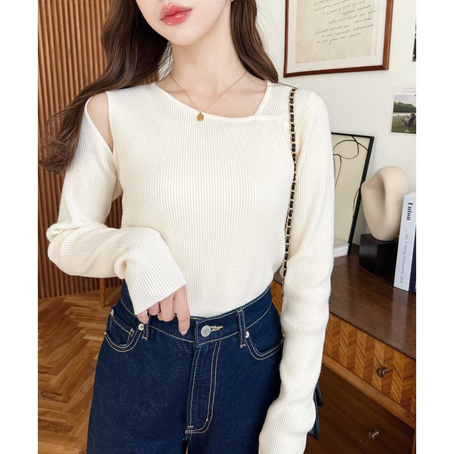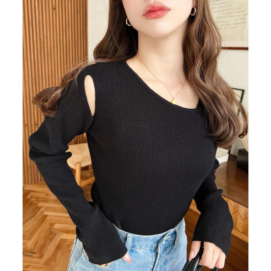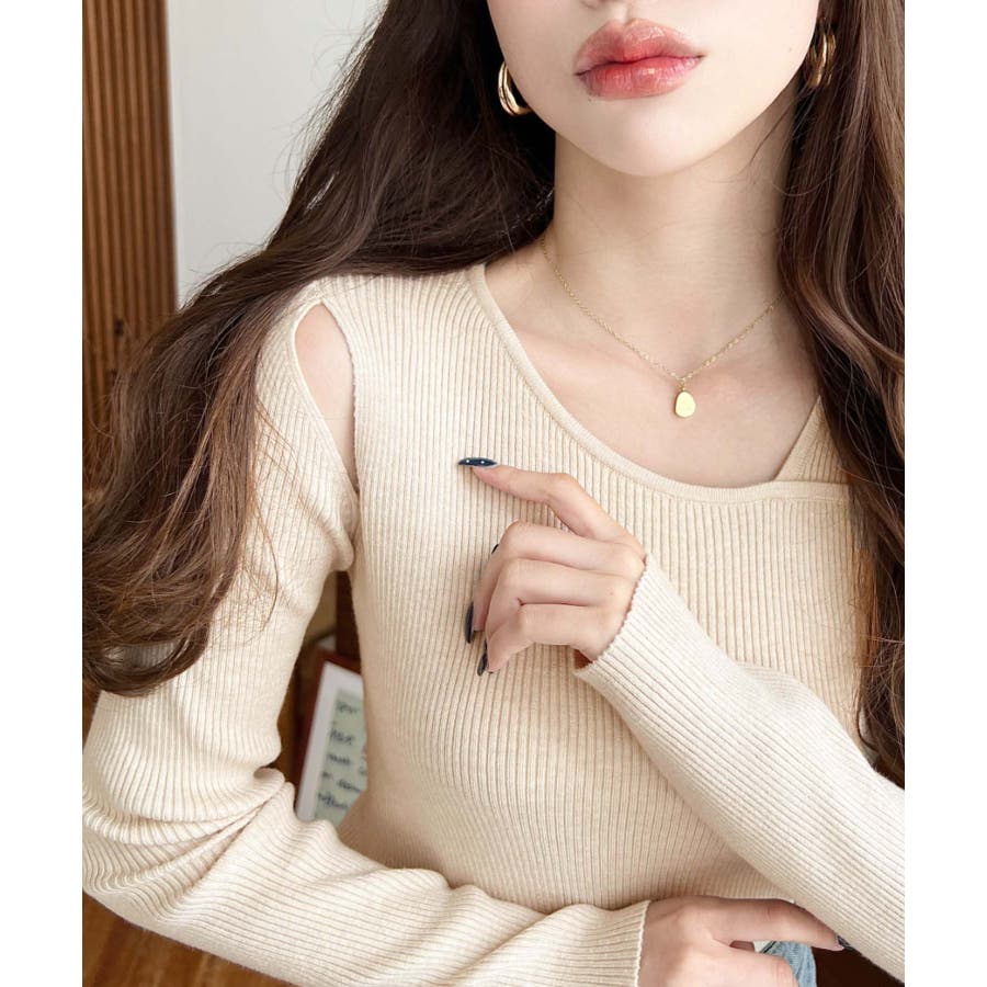 ・アシンメトリーな首元のデザインでヘルシーな程よい肌見せがポイントのニットトップス!