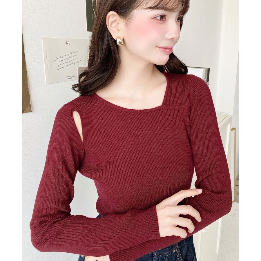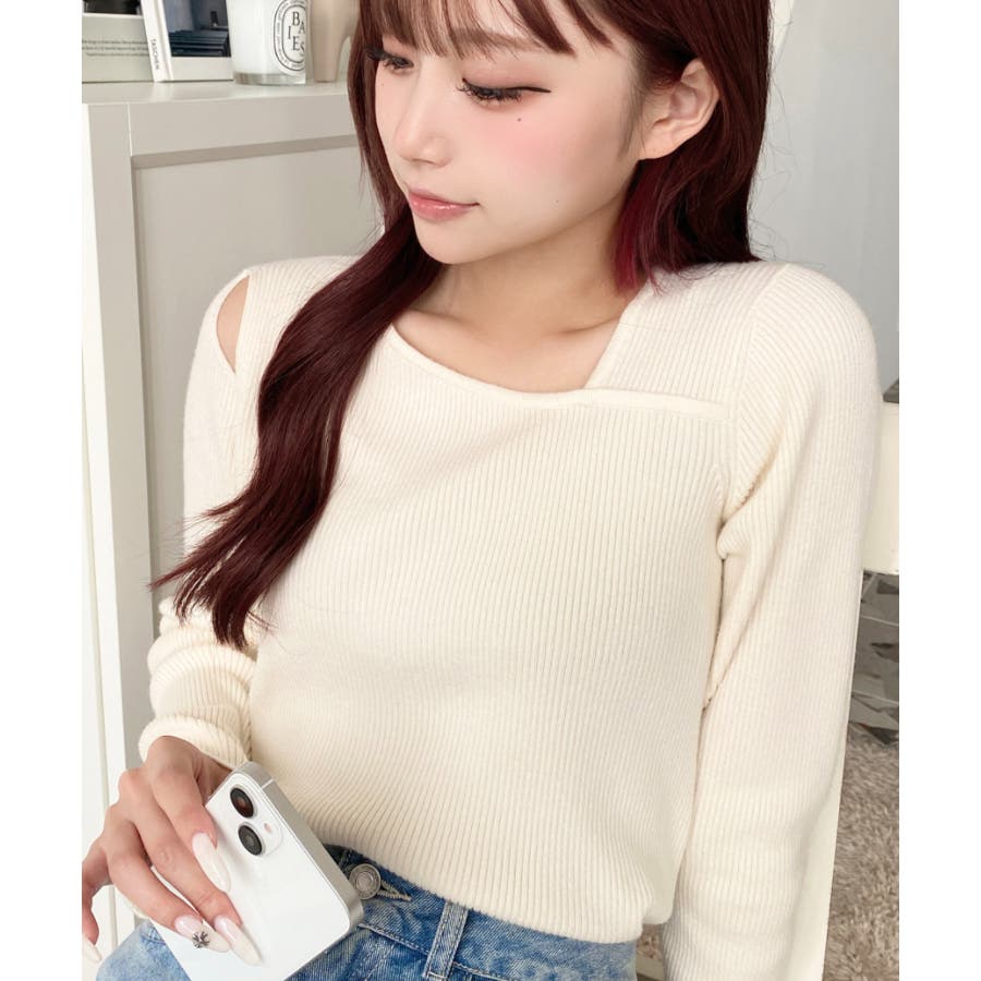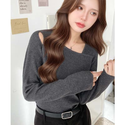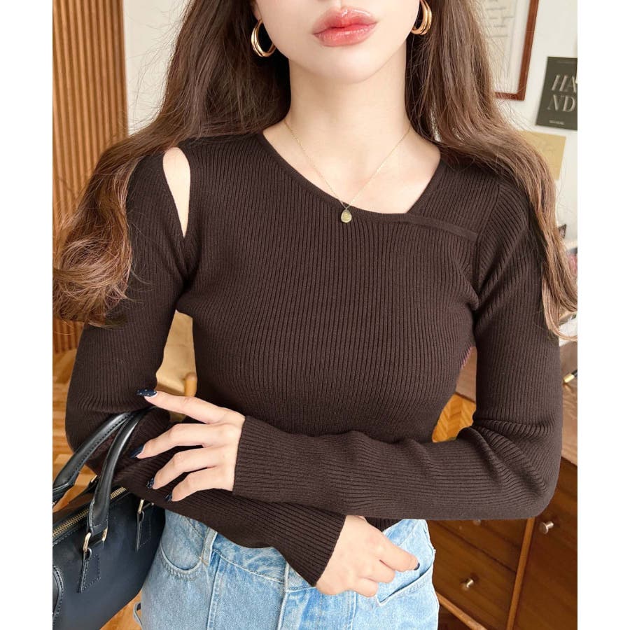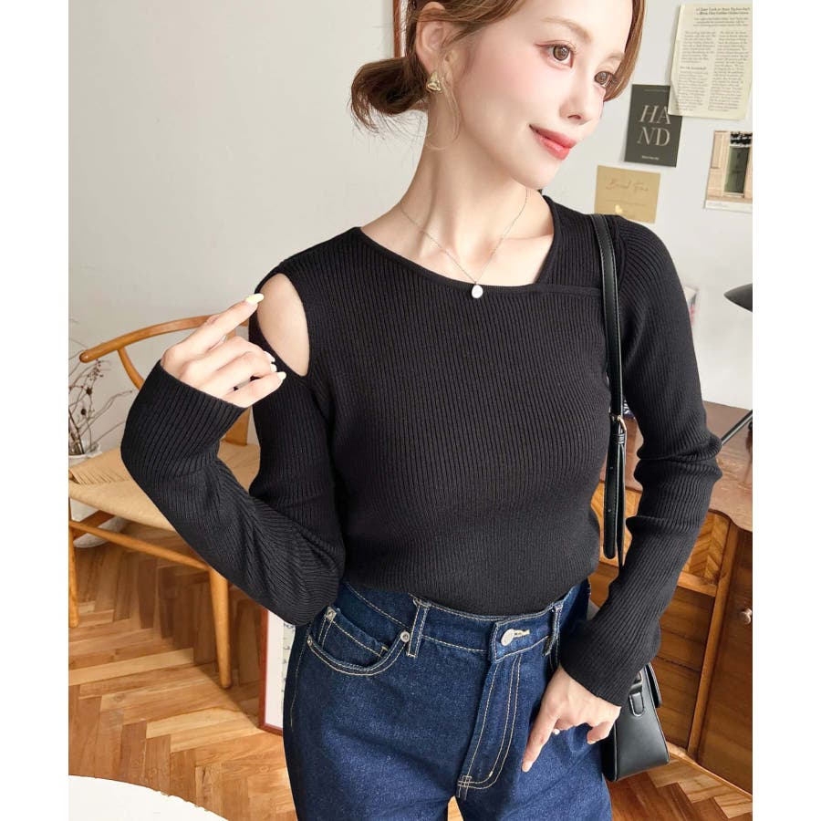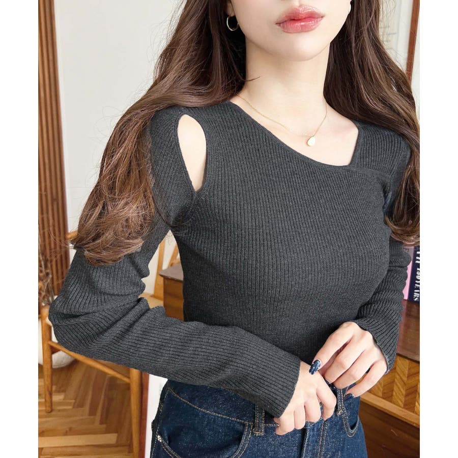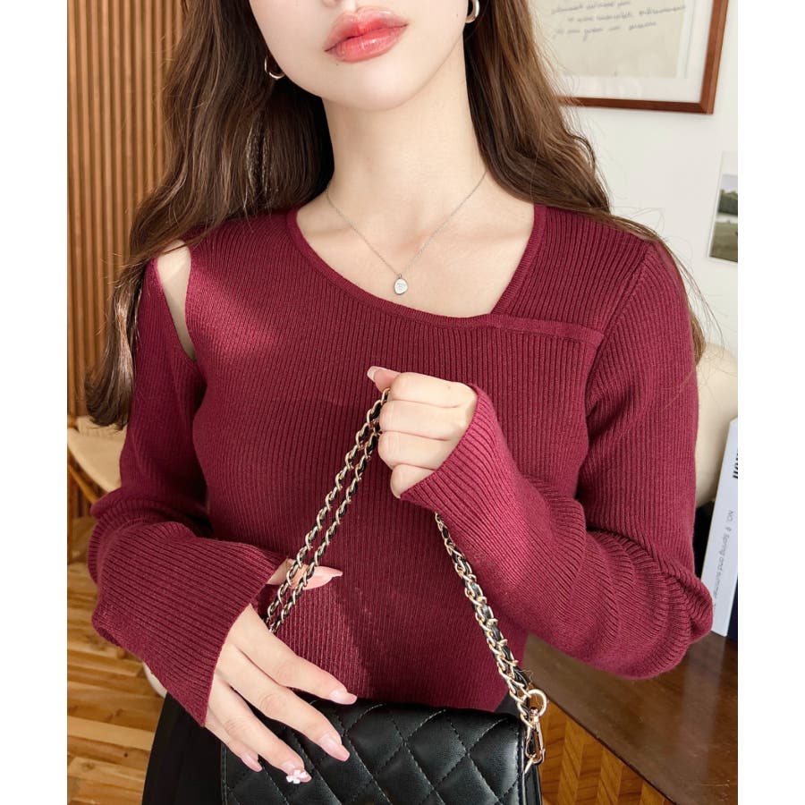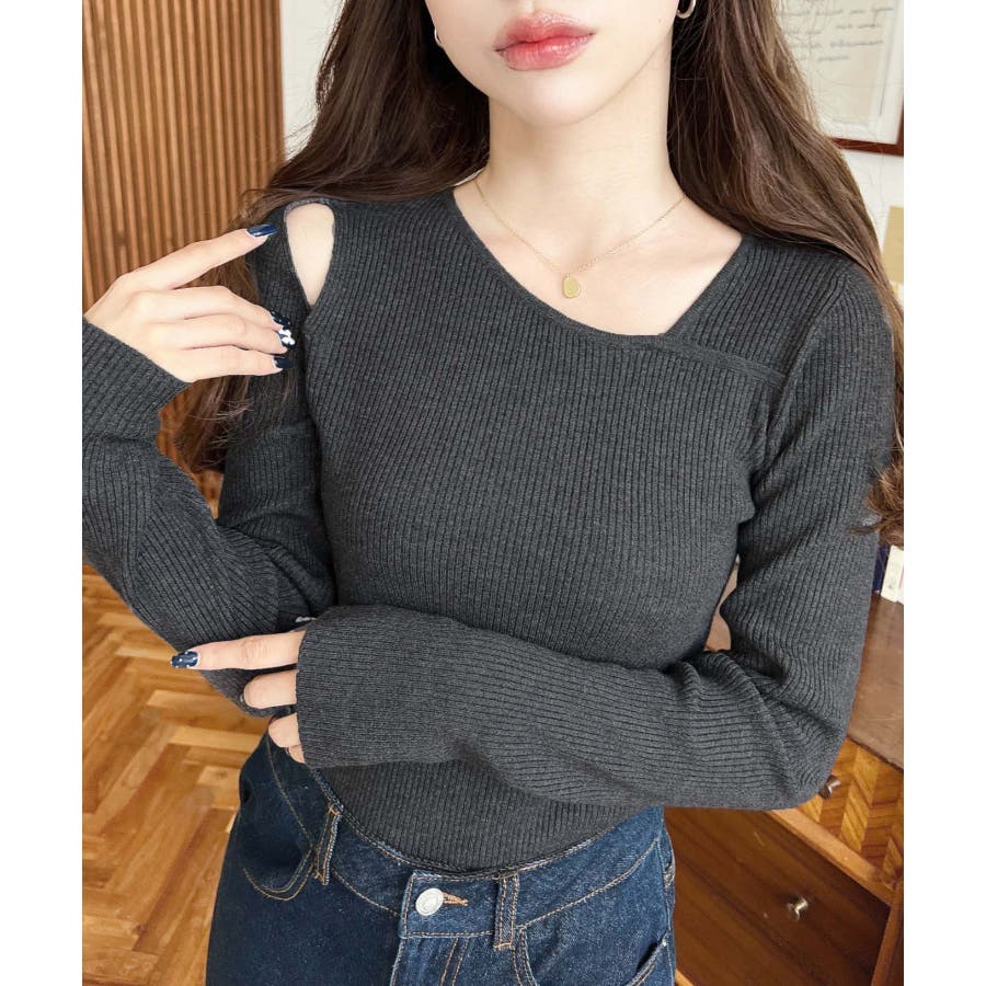 ・アシンメトリーな首元のデザインでヘルシーな程よい肌見せがポイントのニットトップス!