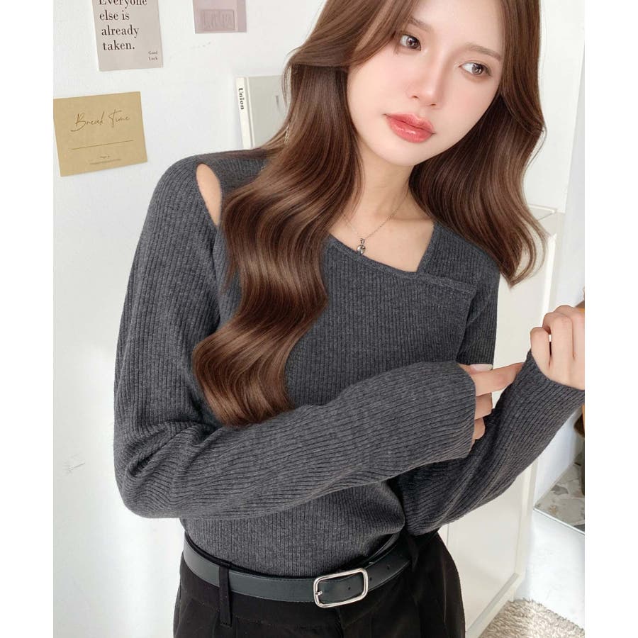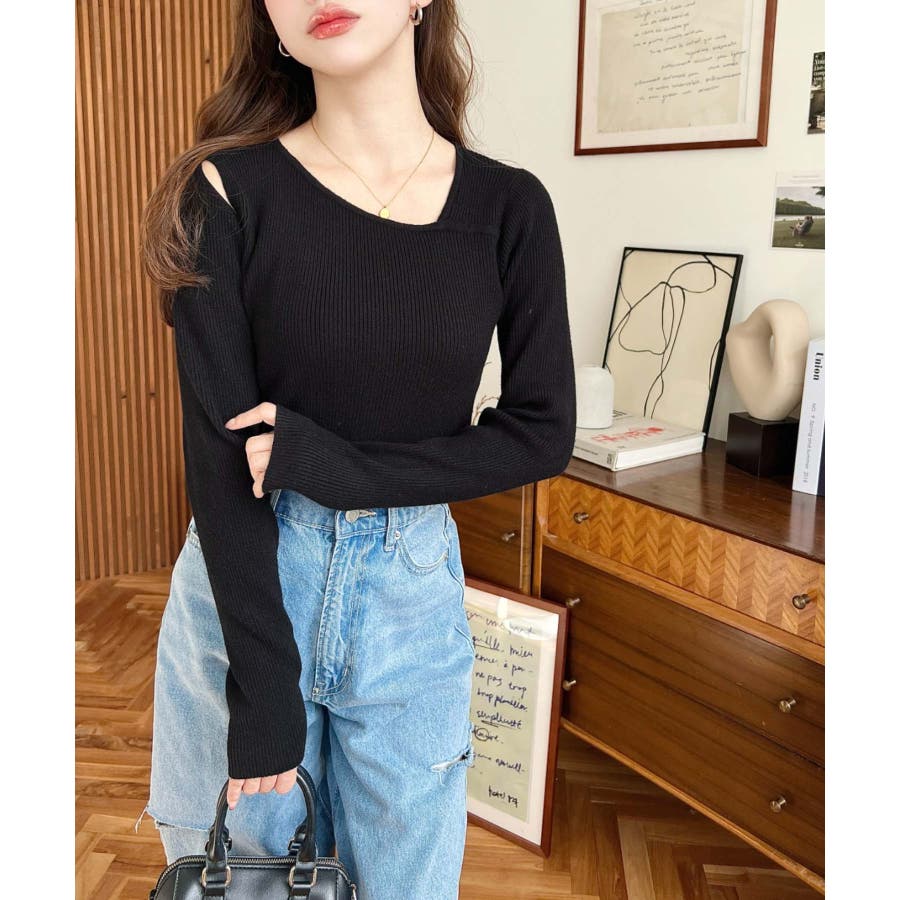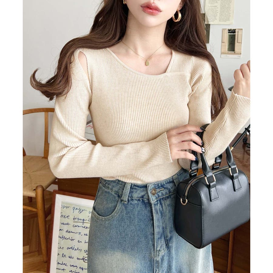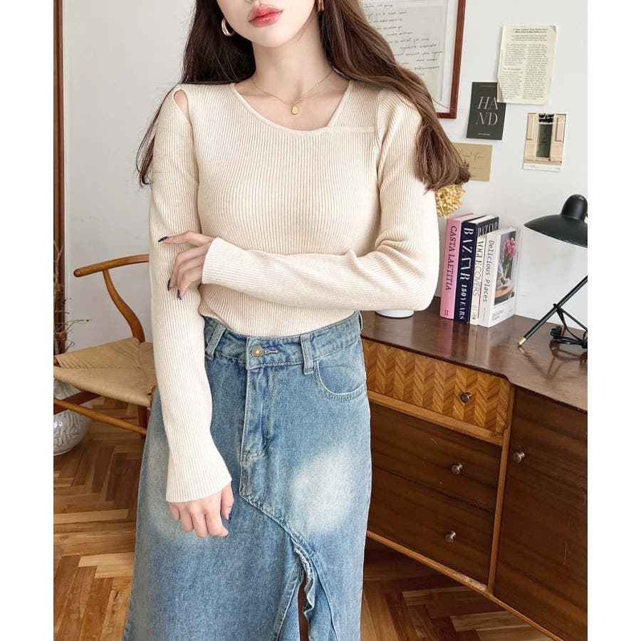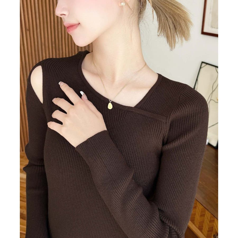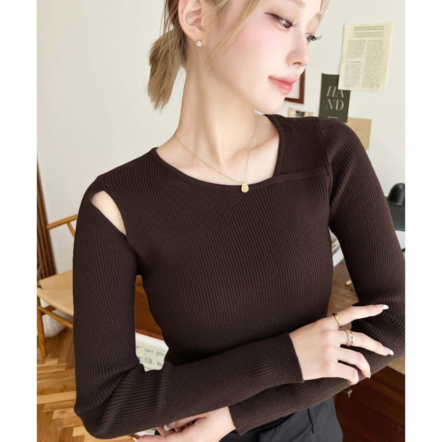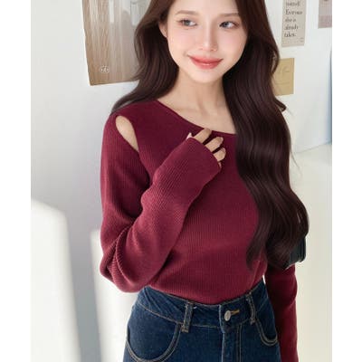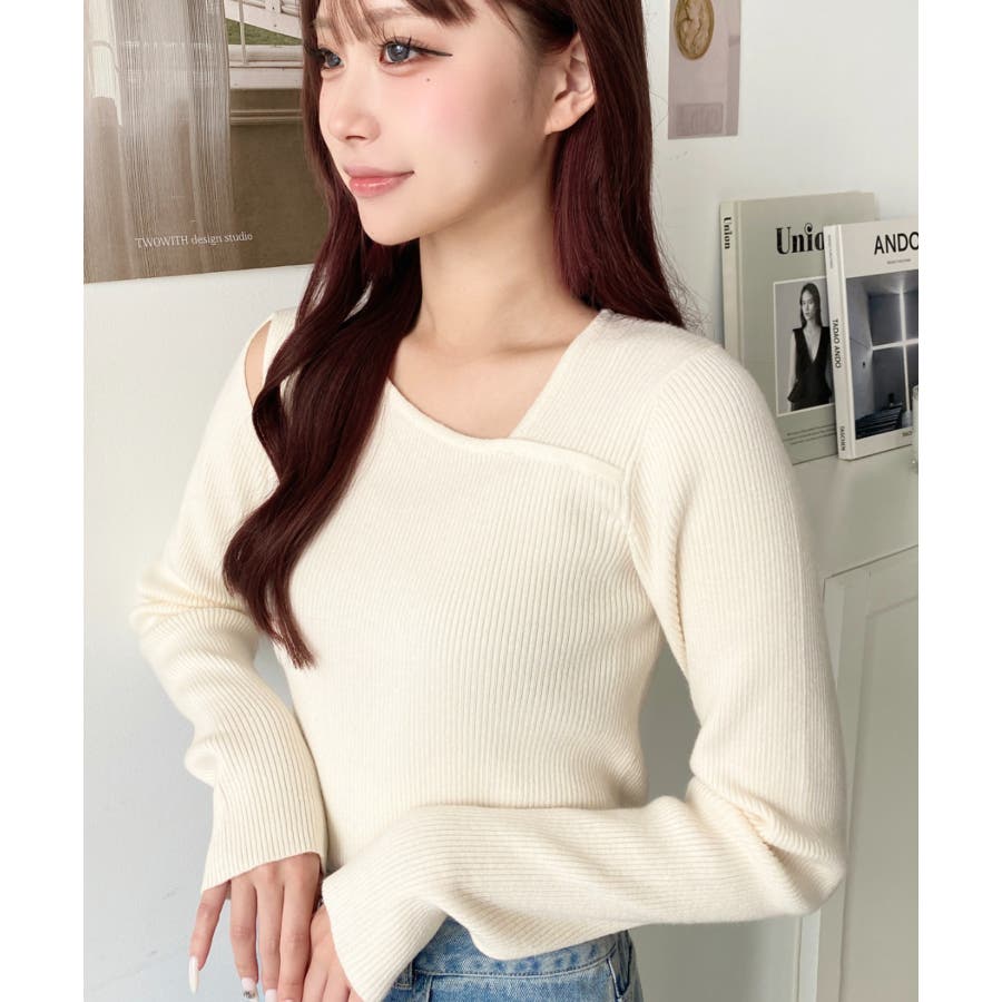 ・アシンメトリーな首元のデザインでヘルシーな程よい肌見せがポイントのニットトップス!