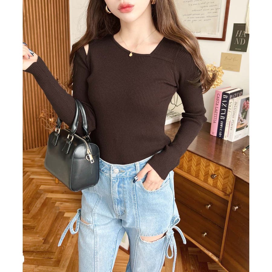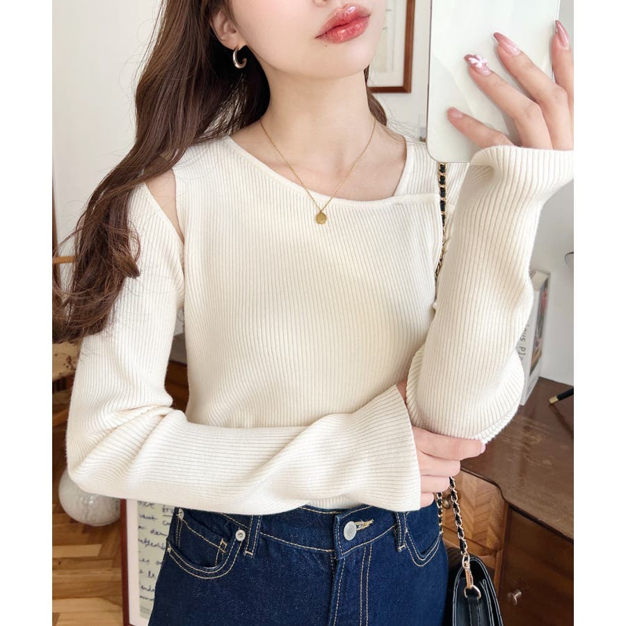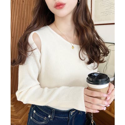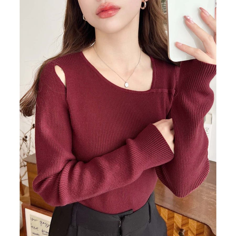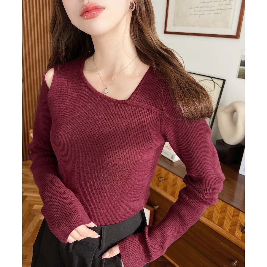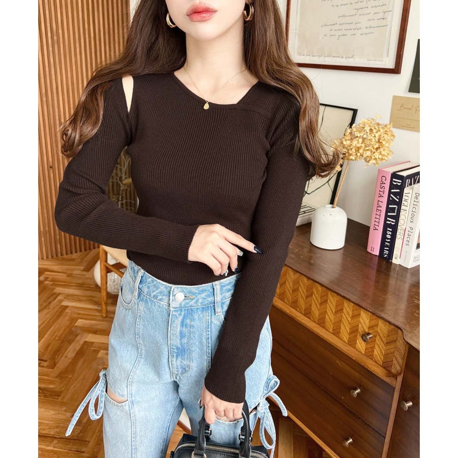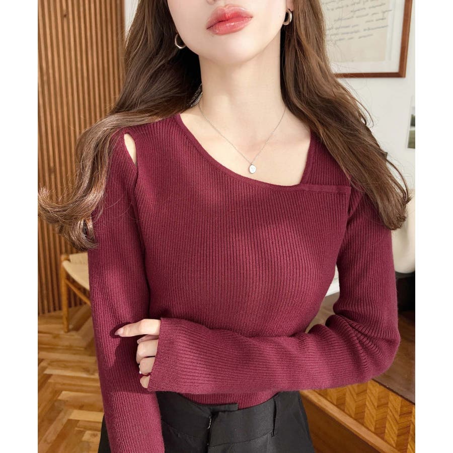 ・アシンメトリーな首元のデザインでヘルシーな程よい肌見せがポイントのニットトップス!