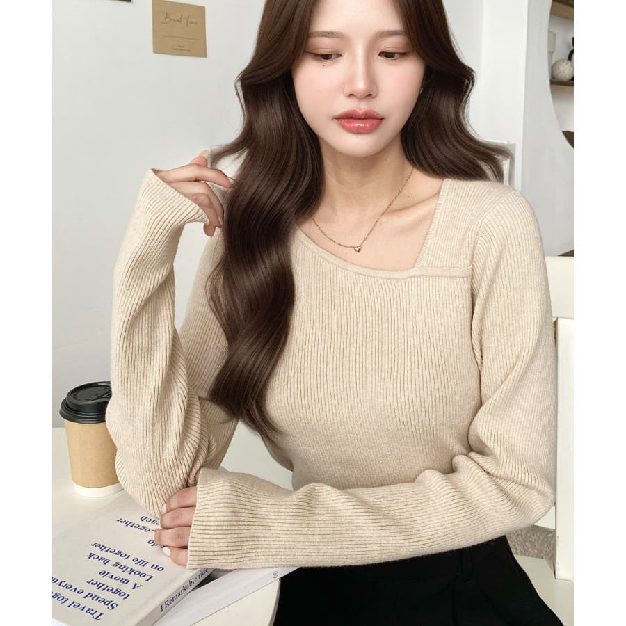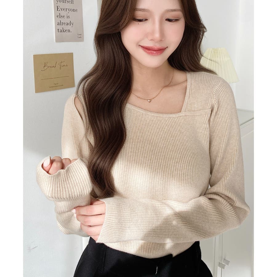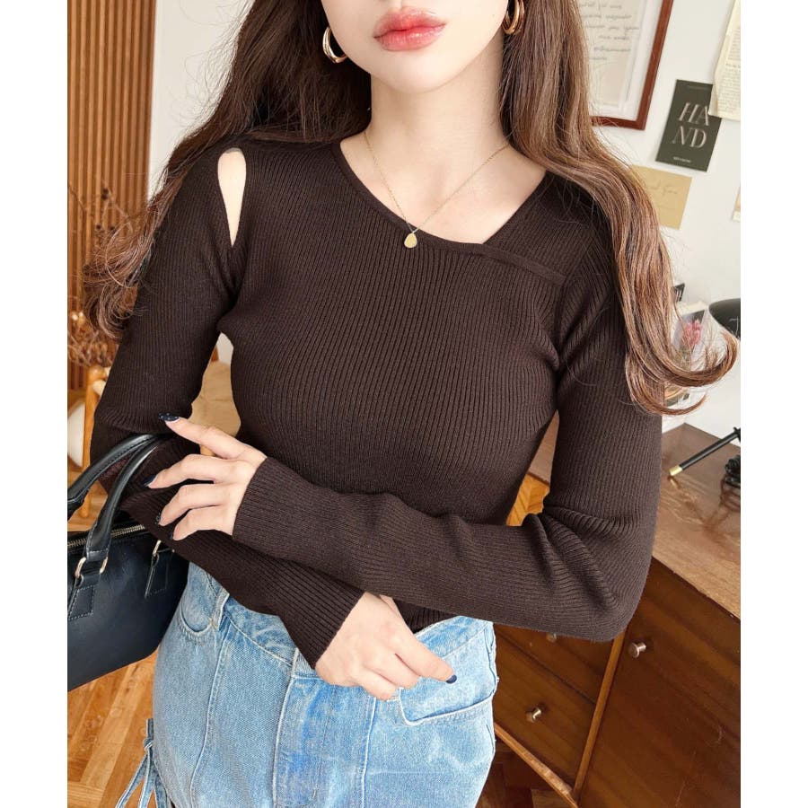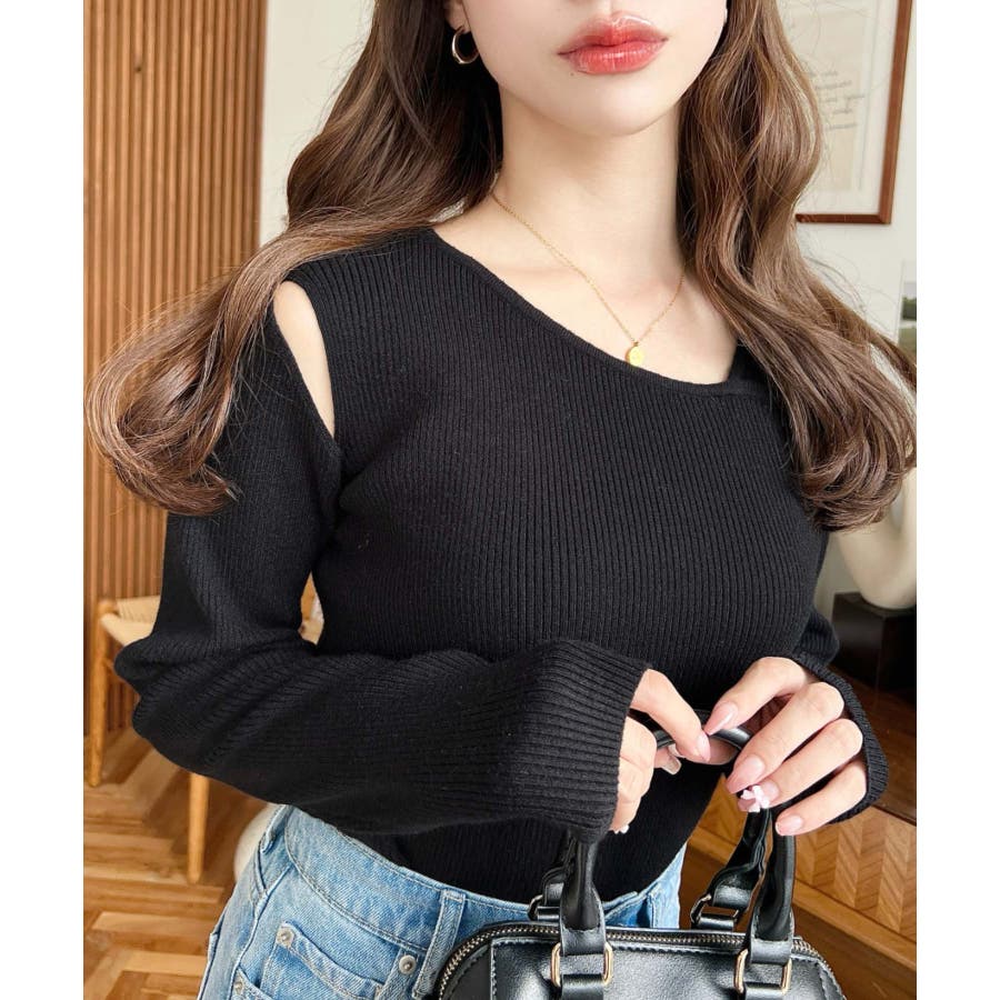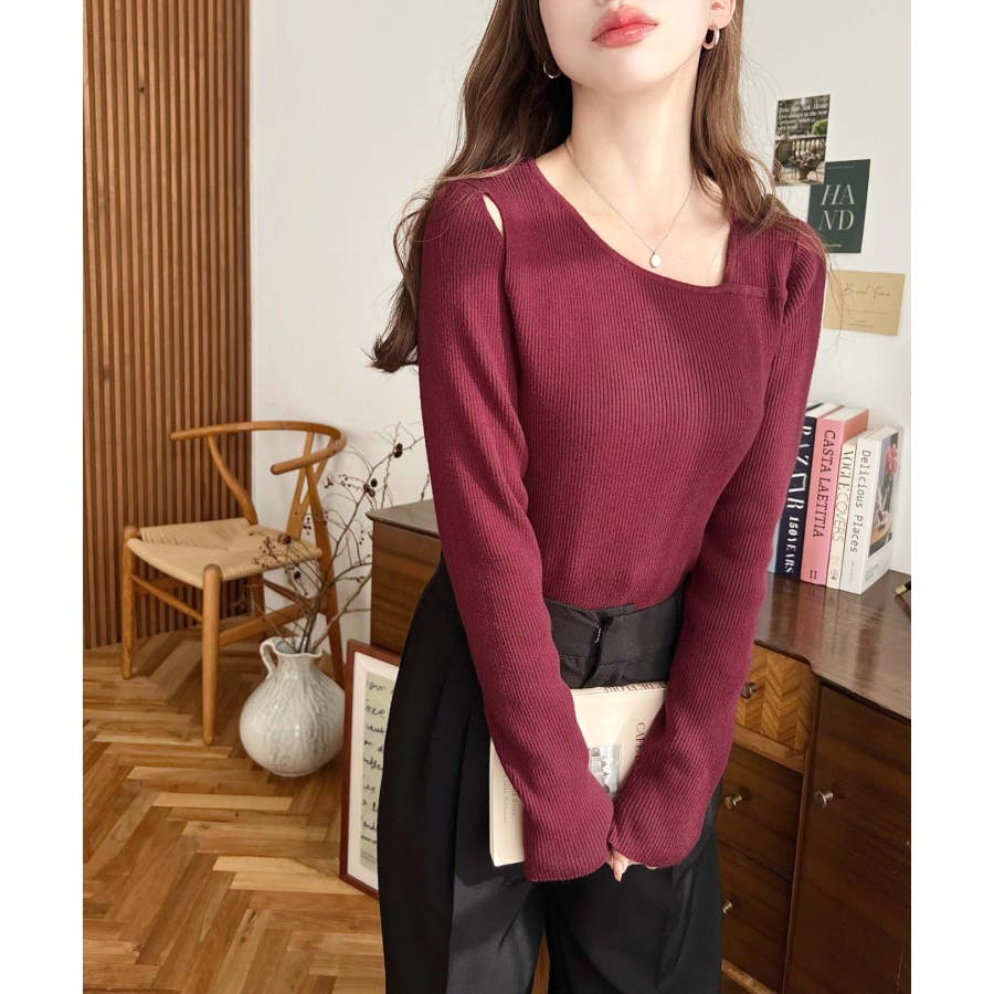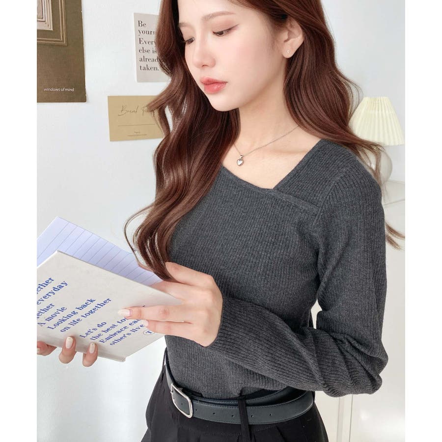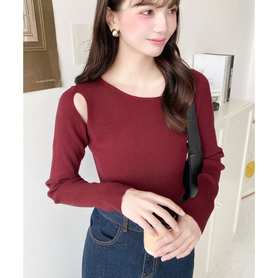 ・アシンメトリーな首元のデザインでヘルシーな程よい肌見せがポイントのニットトップス!