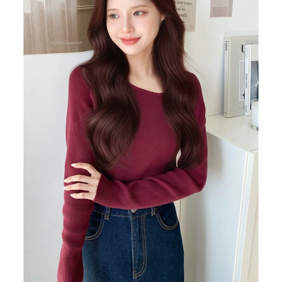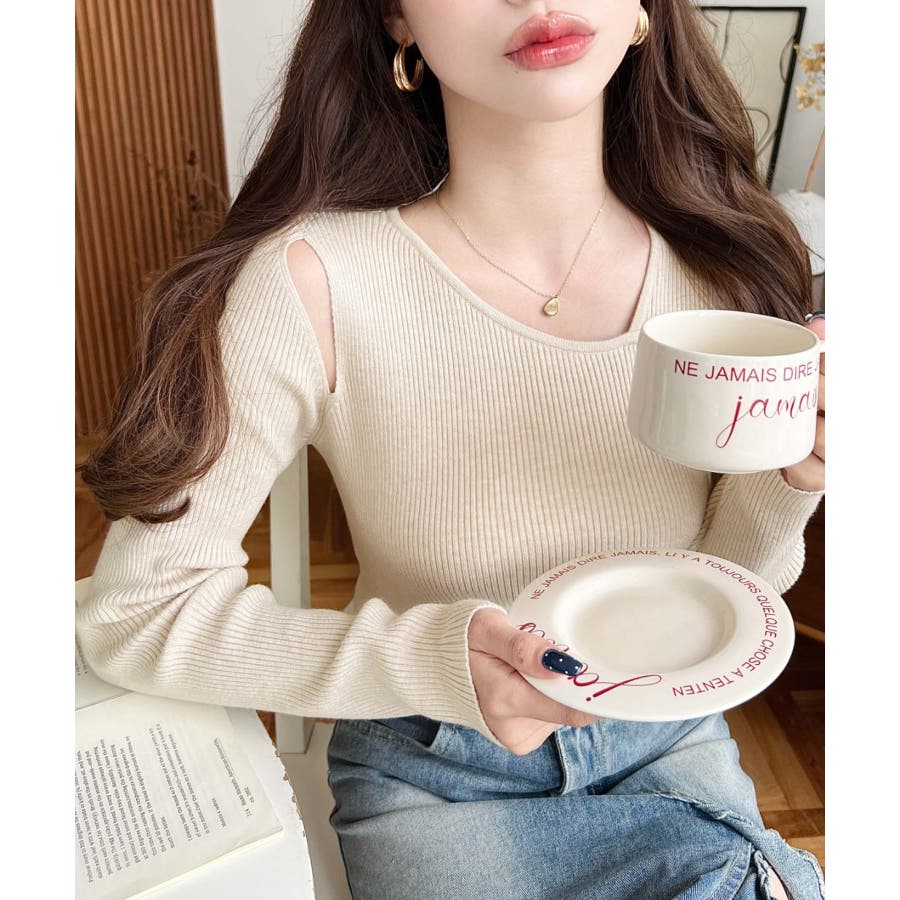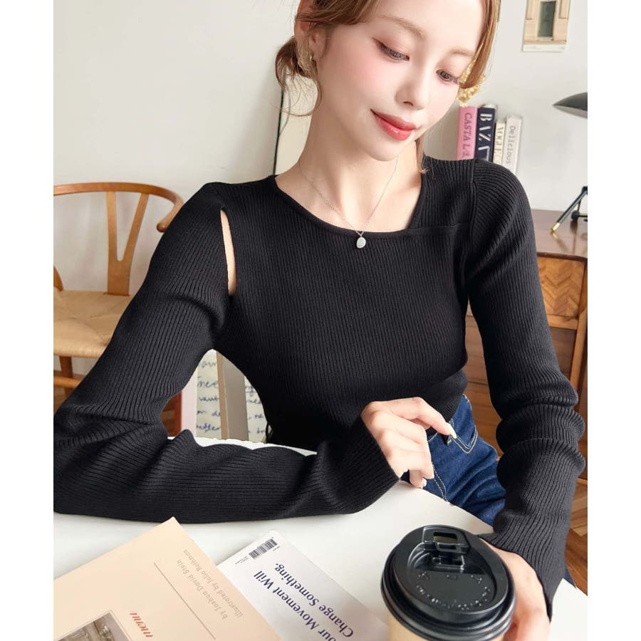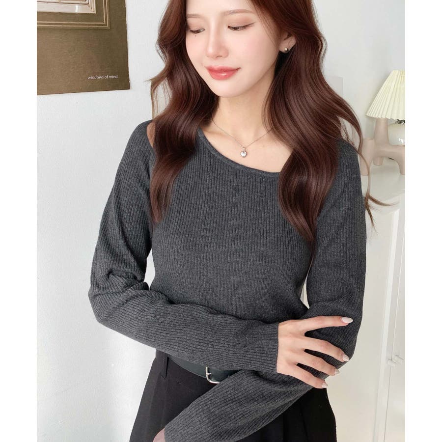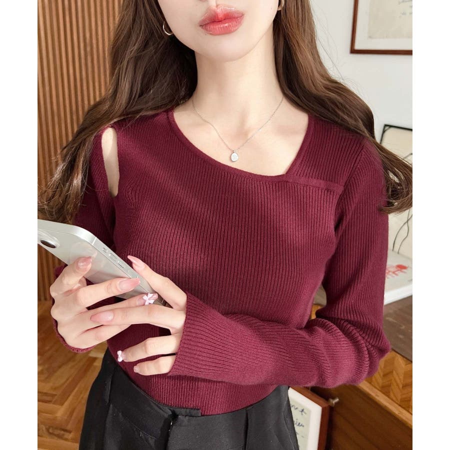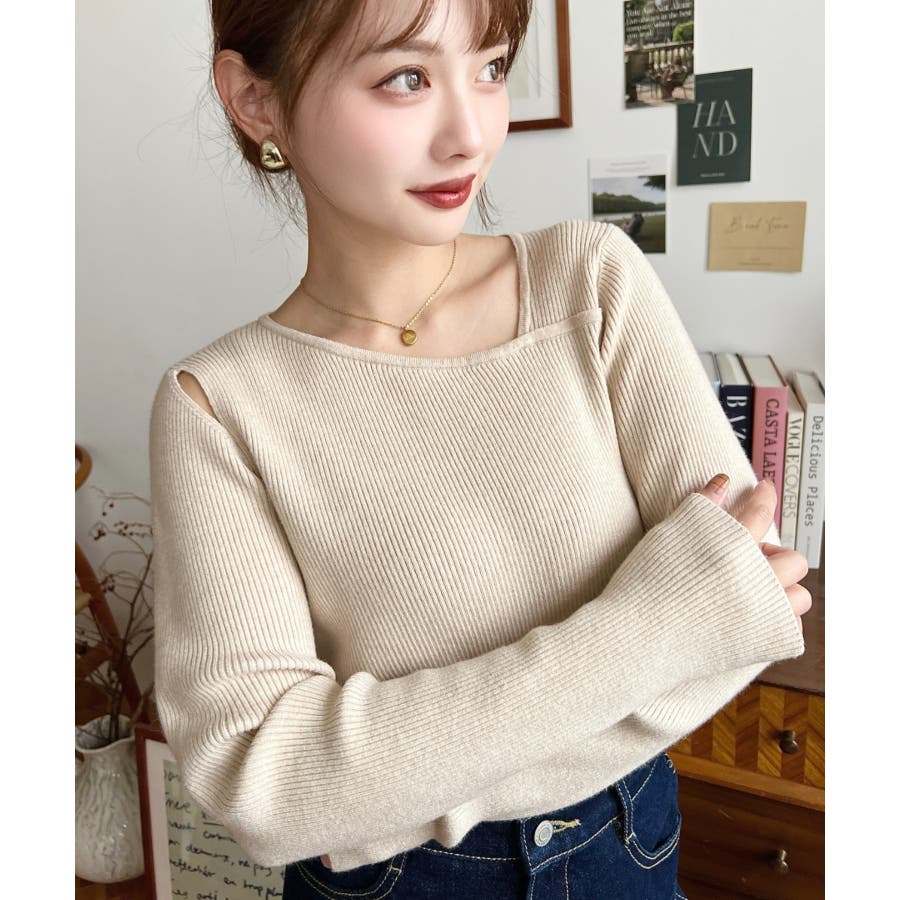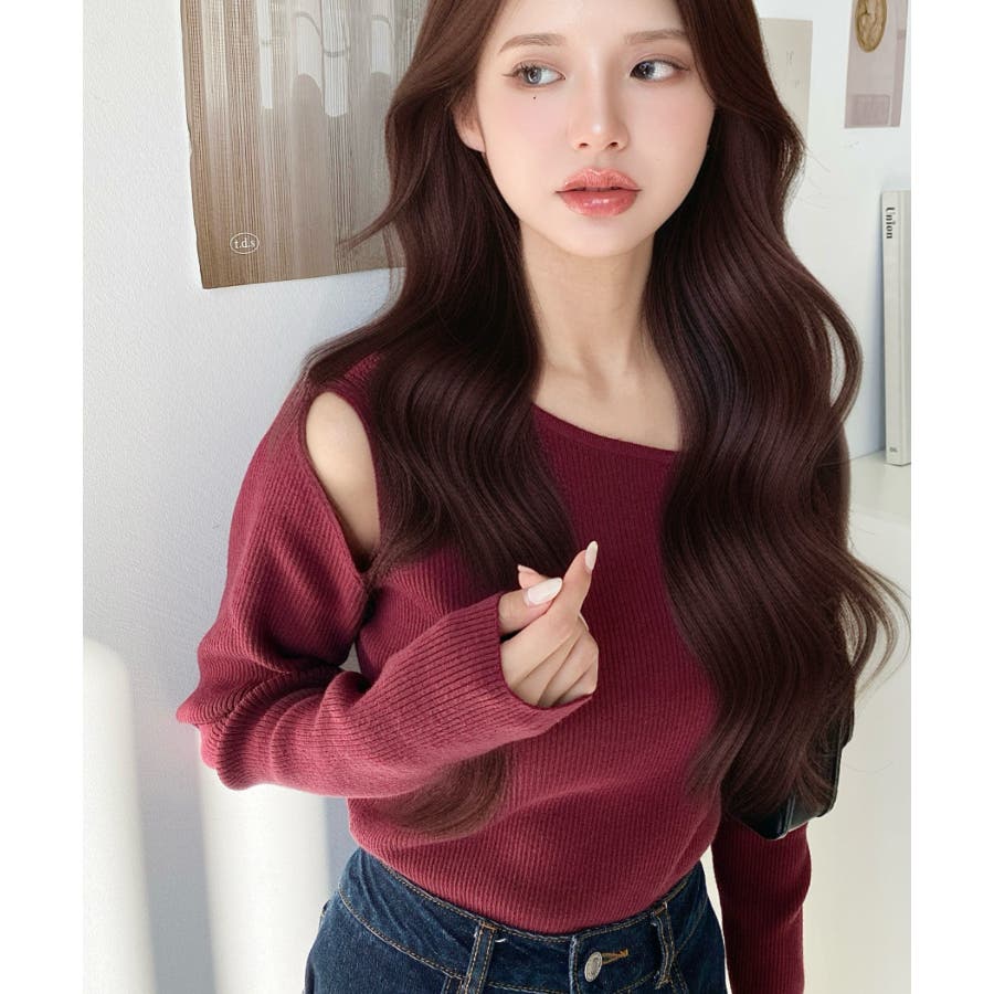 ・アシンメトリーな首元のデザインでヘルシーな程よい肌見せがポイントのニットトップス!