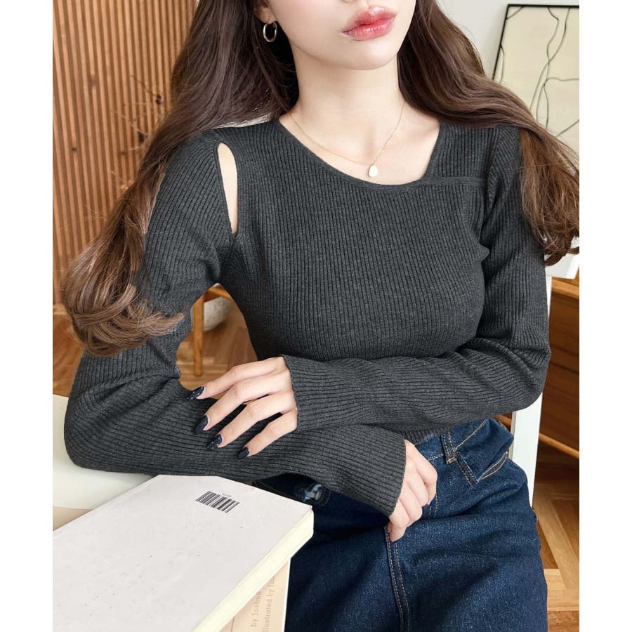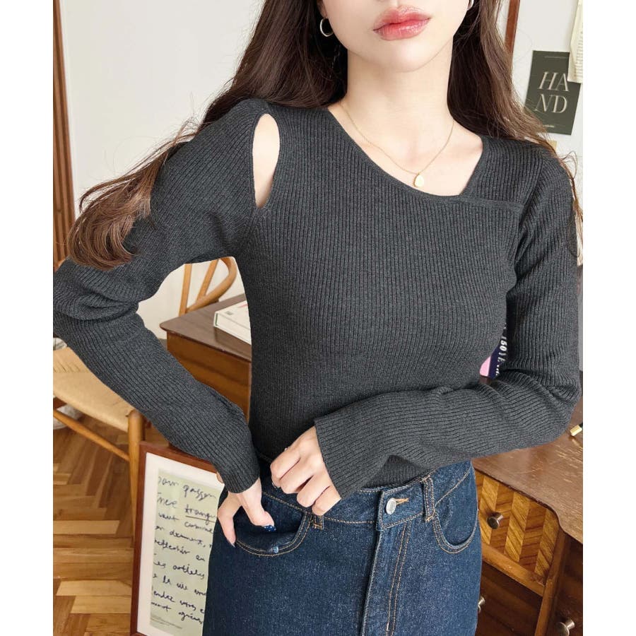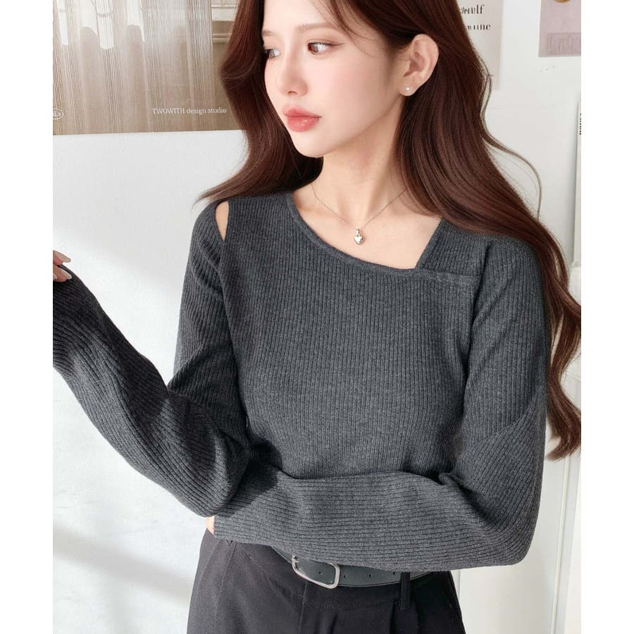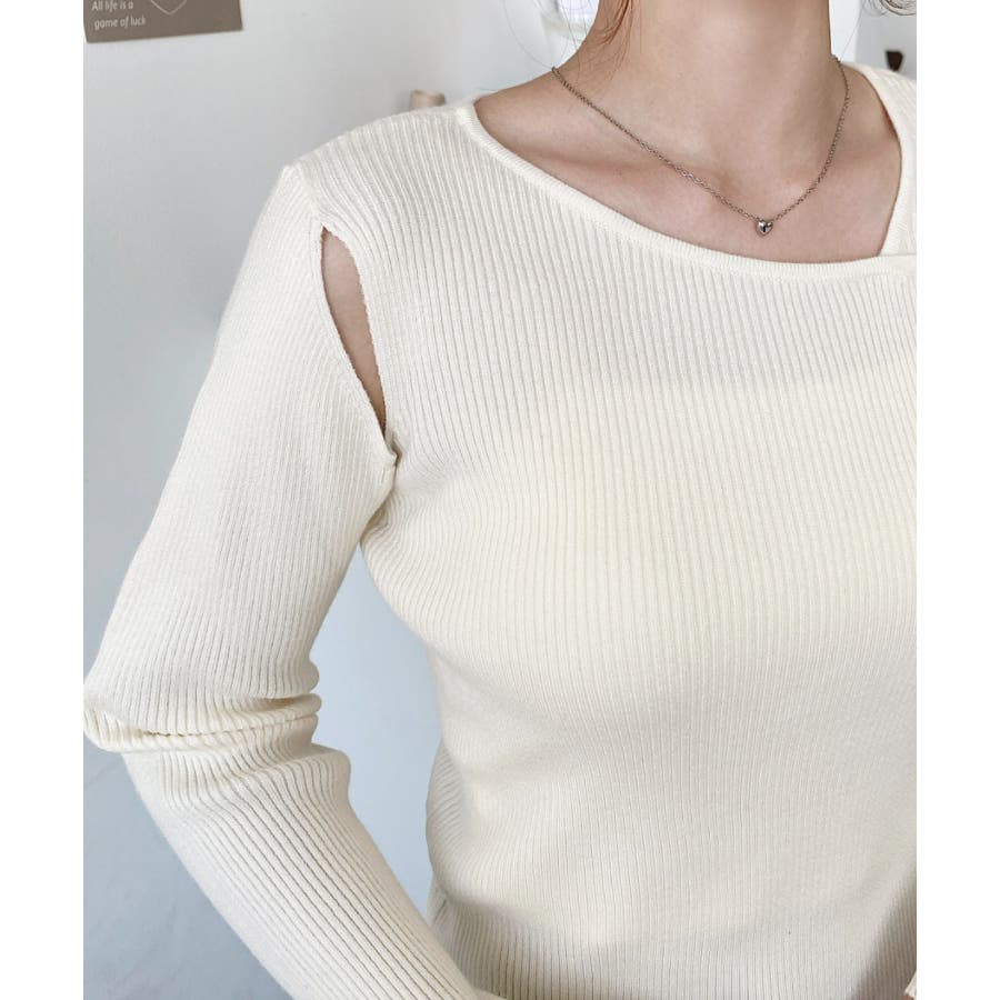ショルダースリットアシンメトリーネックリブニットプルオーバー12G