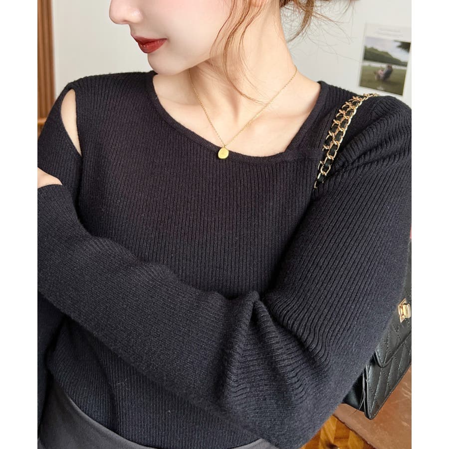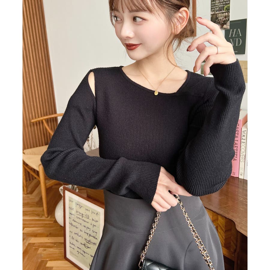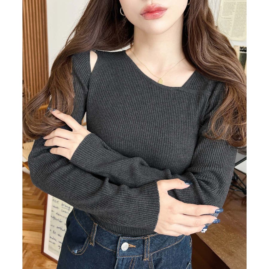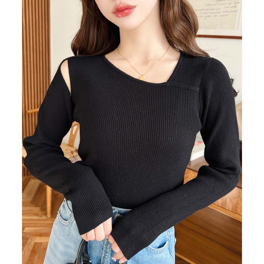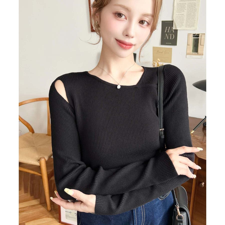 ショルダースリットアシンメトリーネックリブニットプルオーバー12G