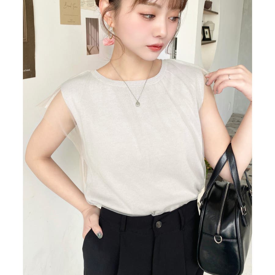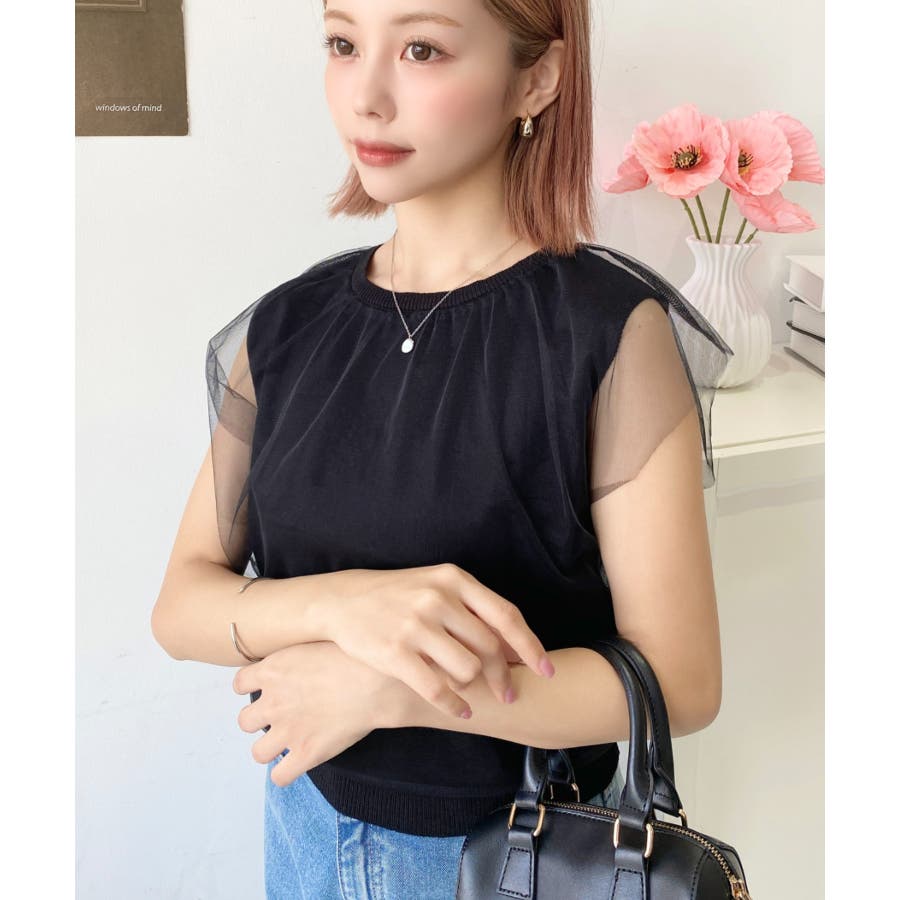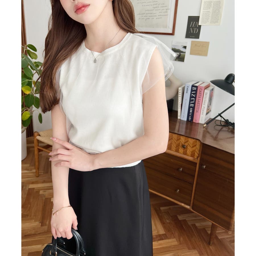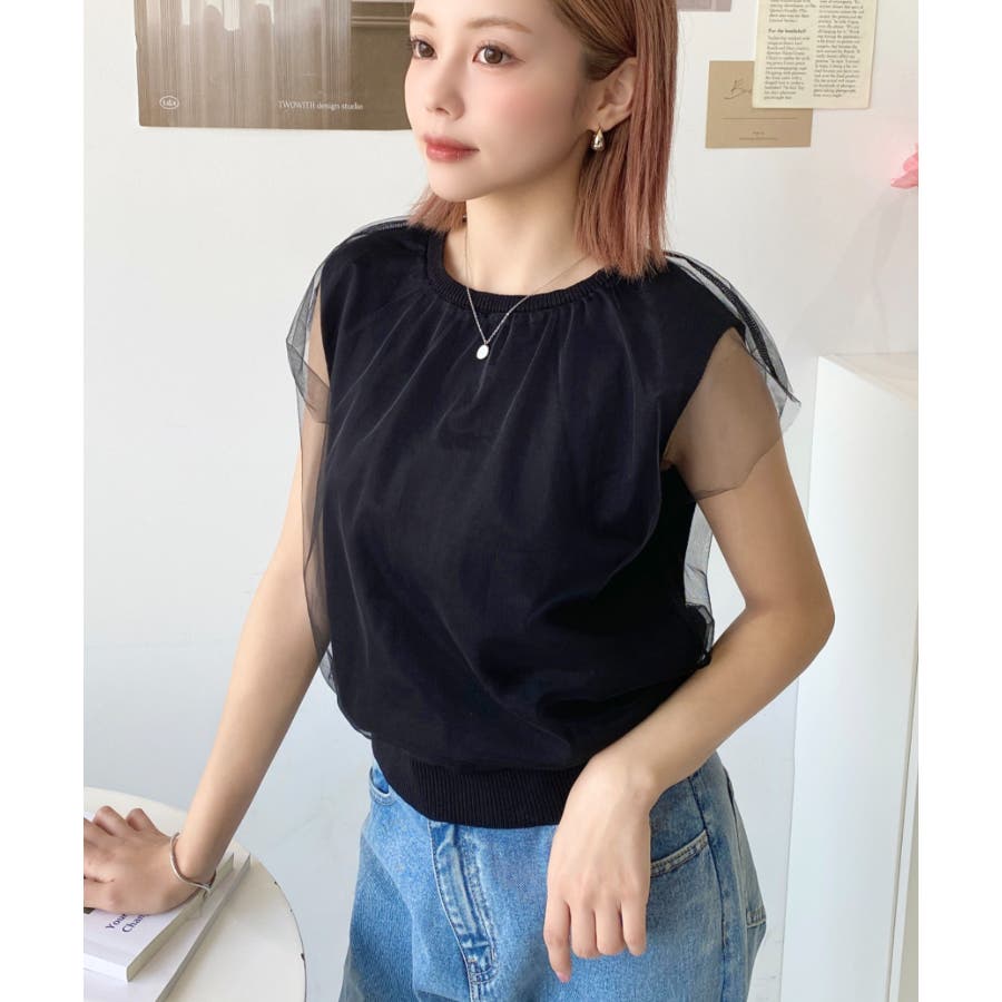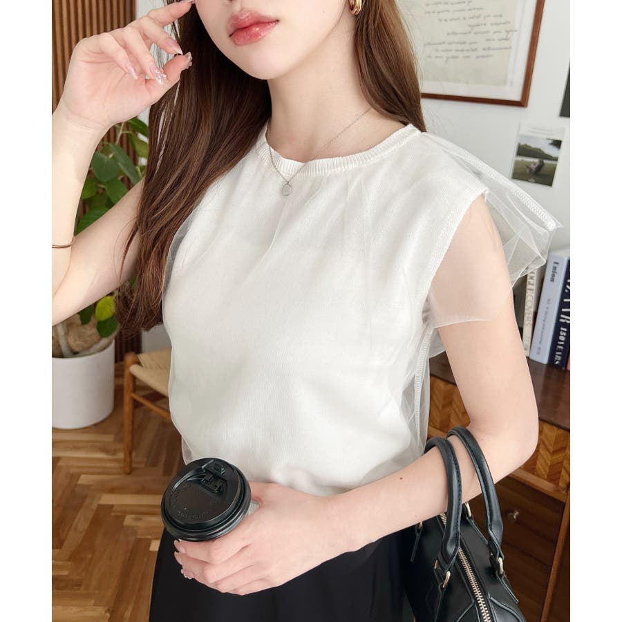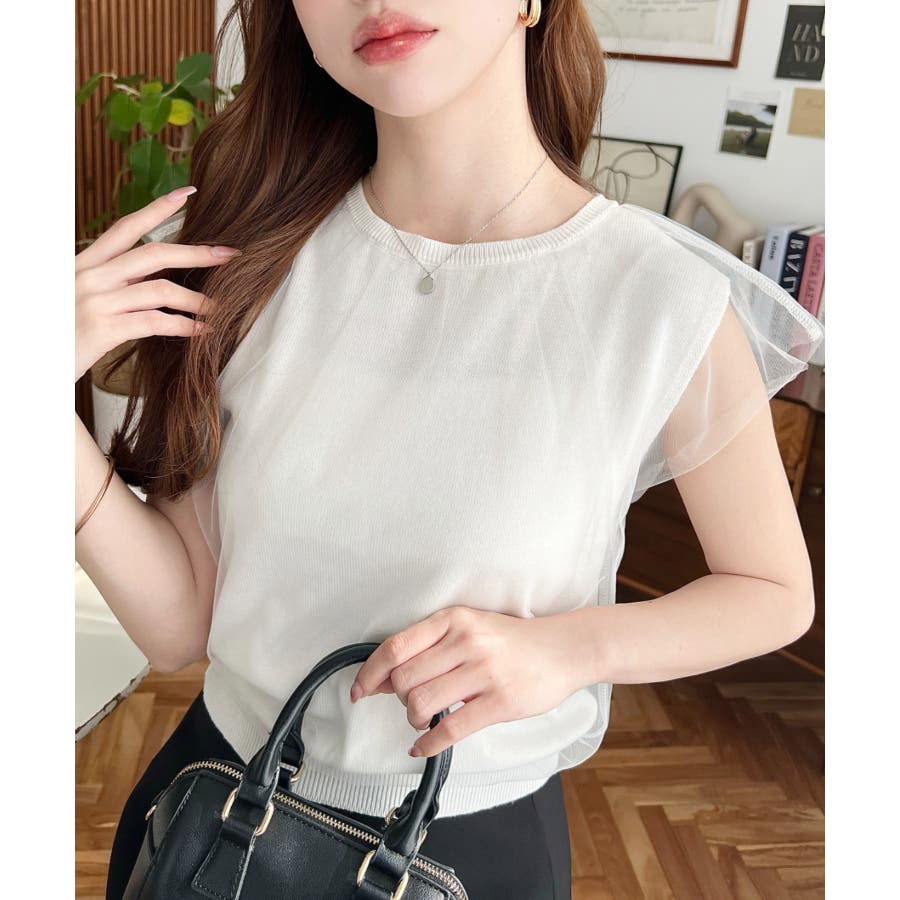 チュールレイヤードフレンチスリーブニットプルオーバー