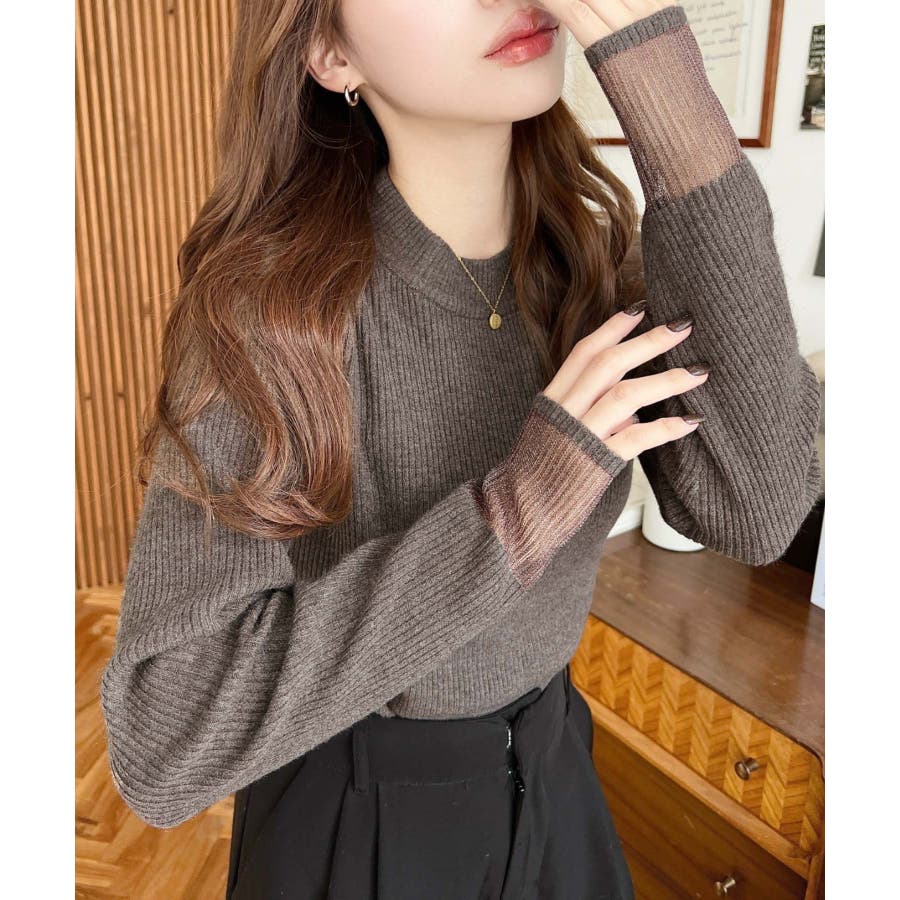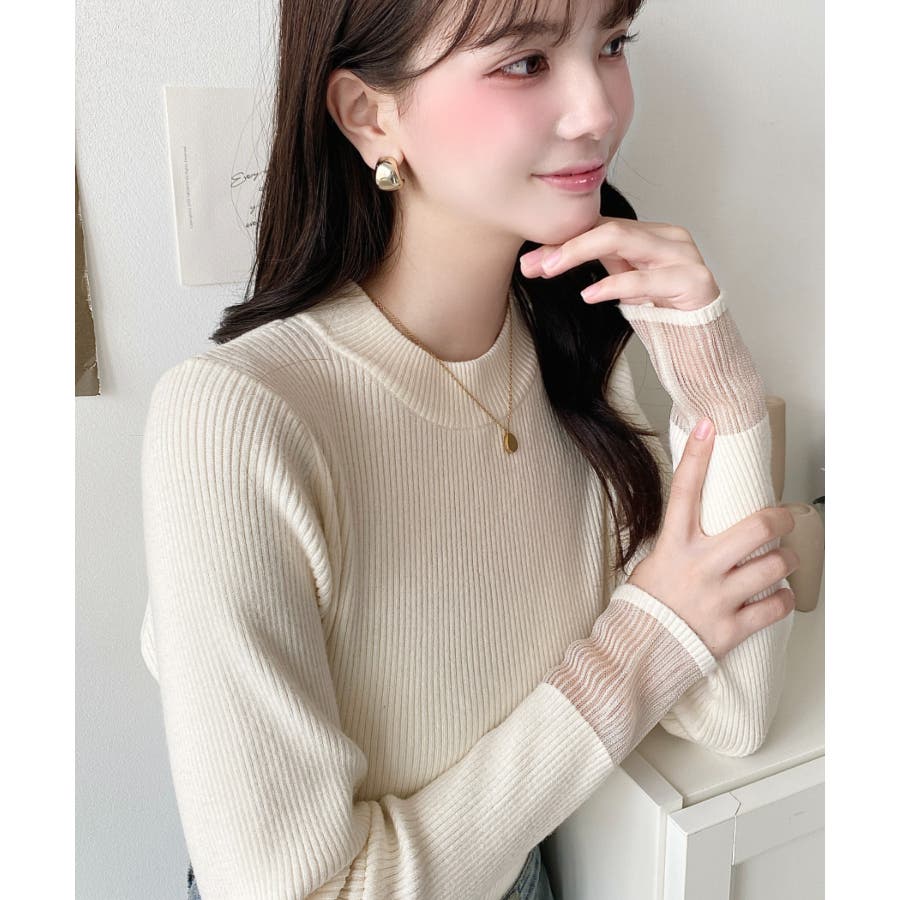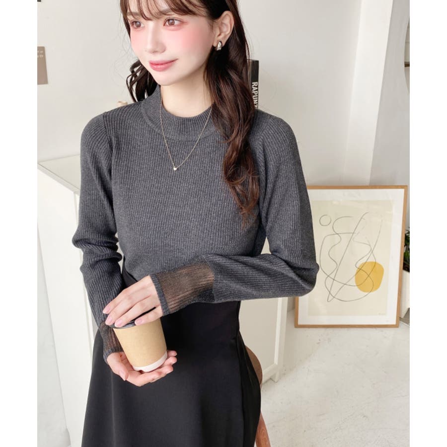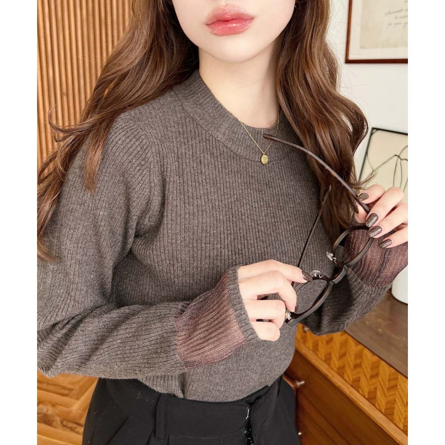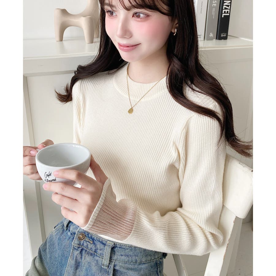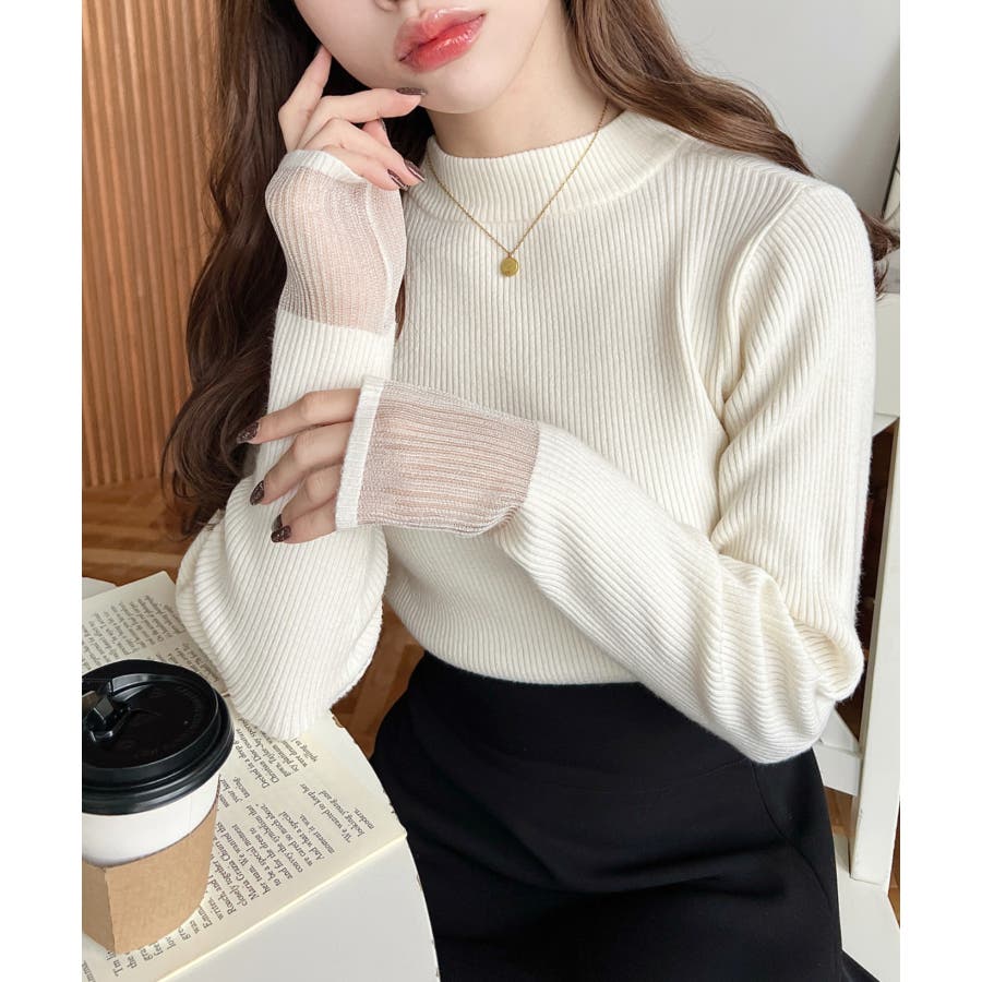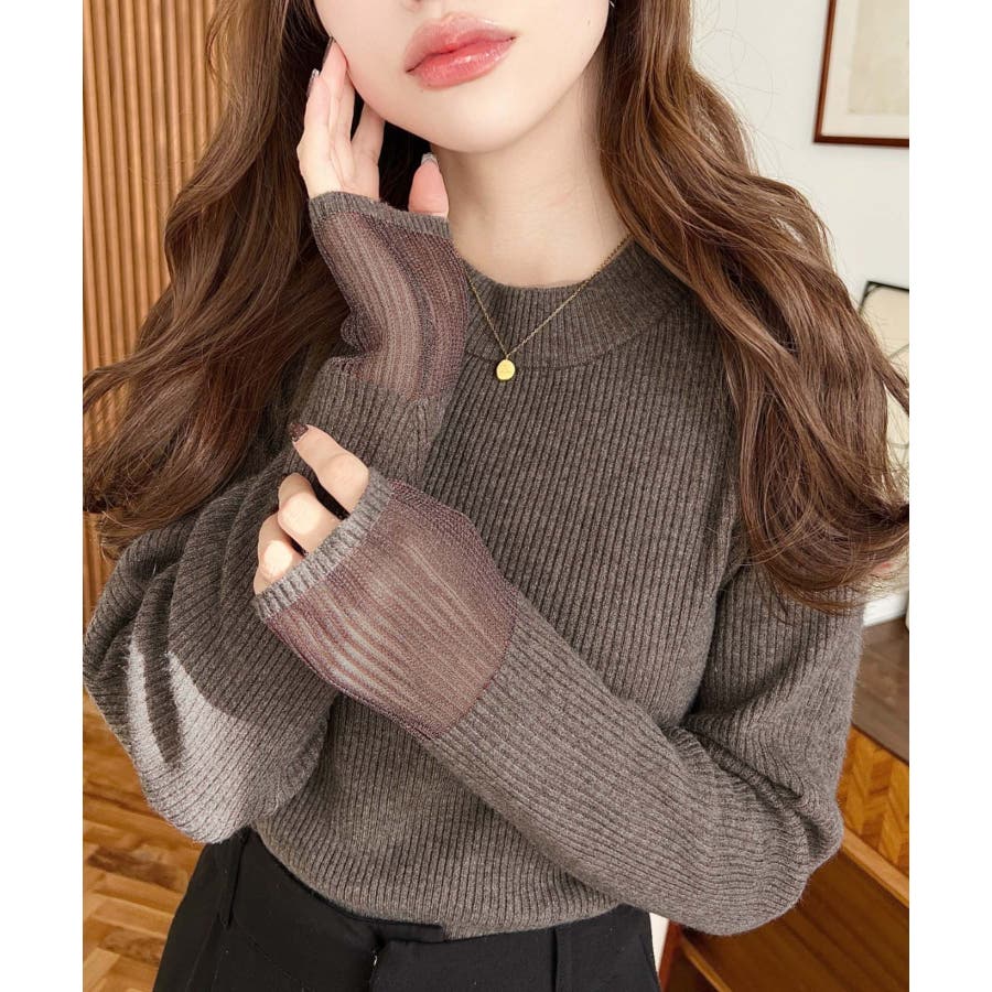 ・シンプルリブニットで袖だけシアーになったお洒落ニットが仲間入り!異素材ミックスがさりげなくて◎