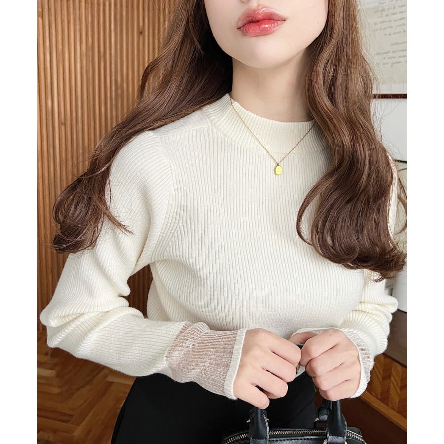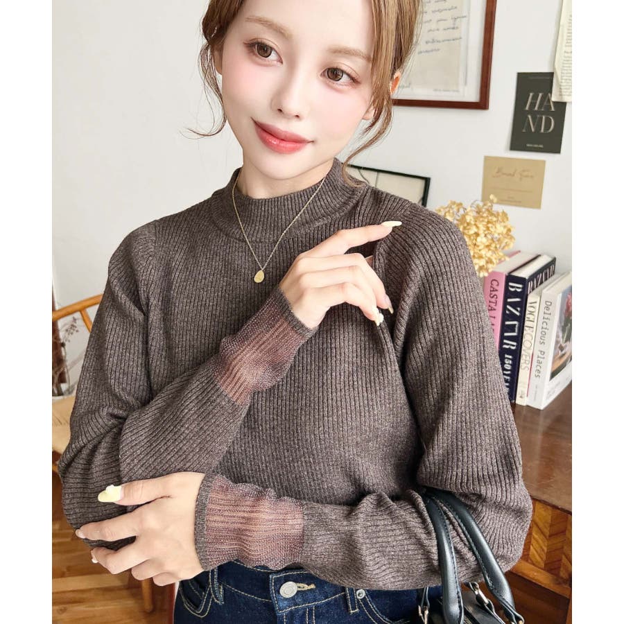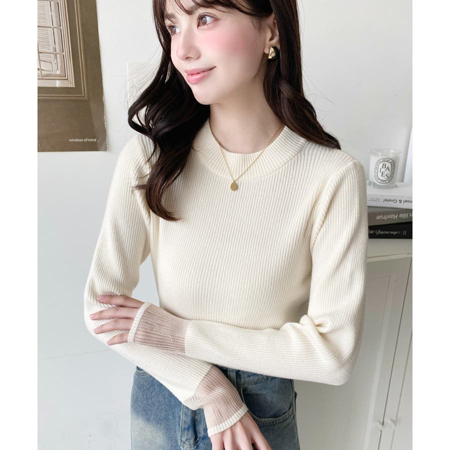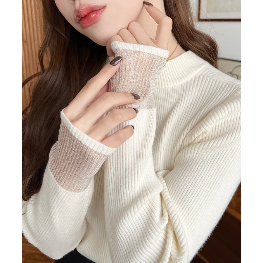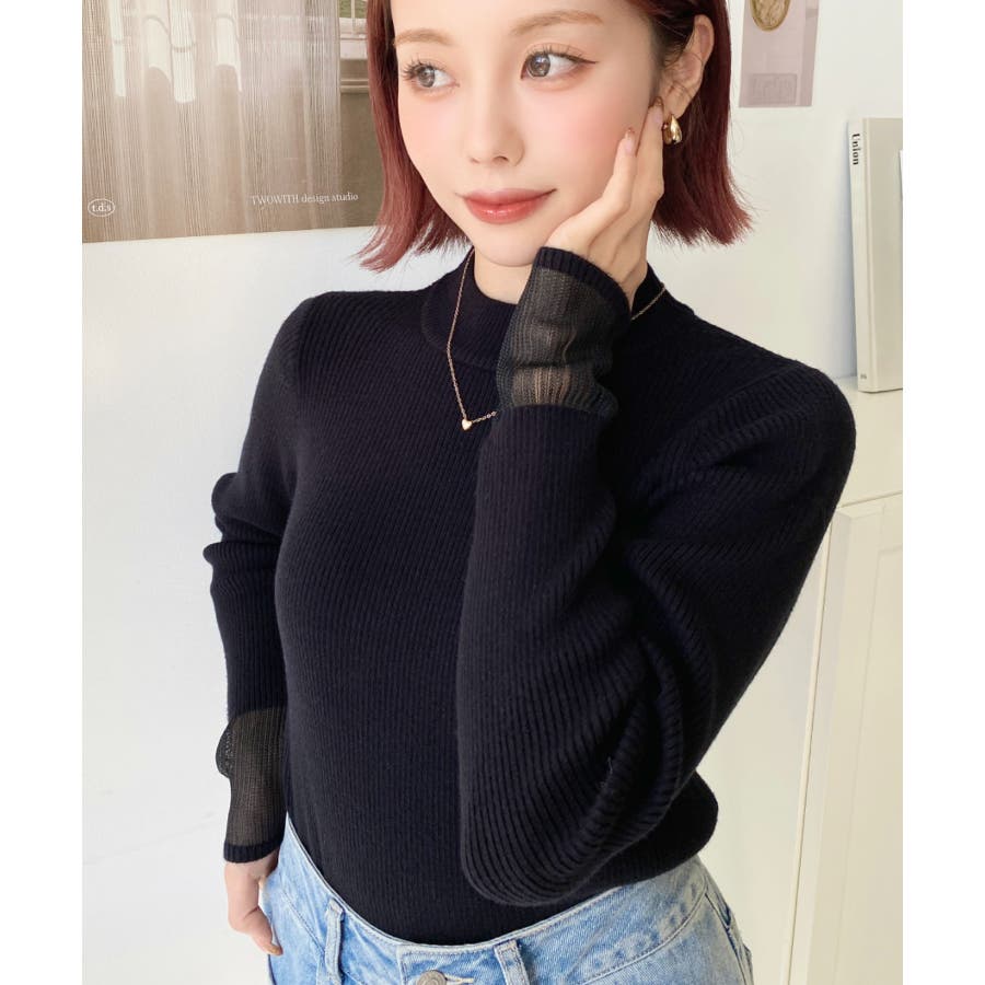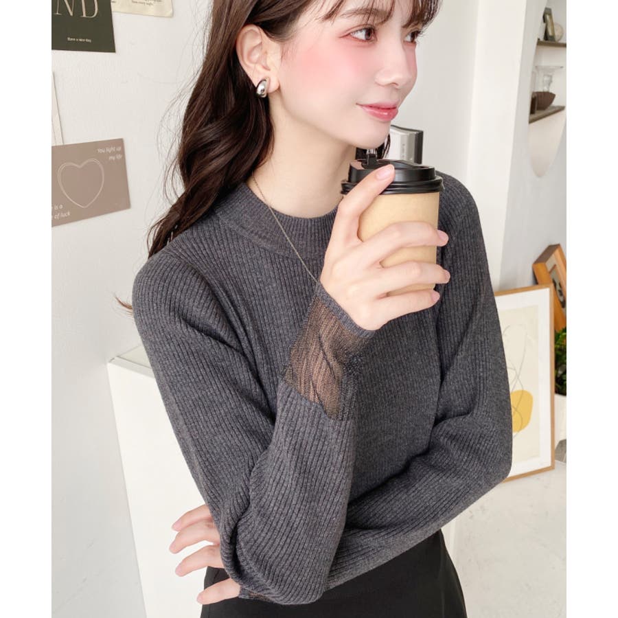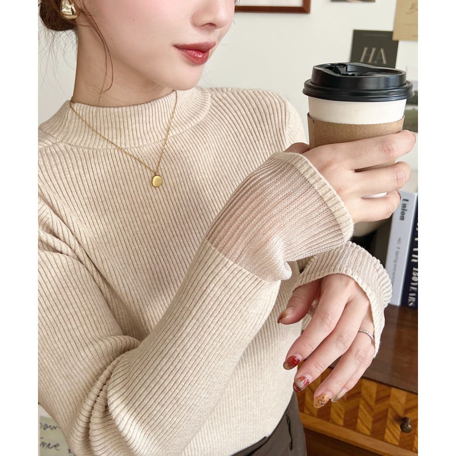 ・シンプルリブニットで袖だけシアーになったお洒落ニットが仲間入り!異素材ミックスがさりげなくて◎