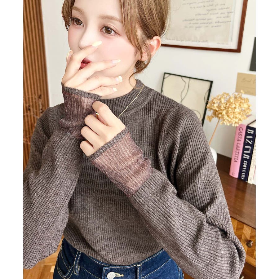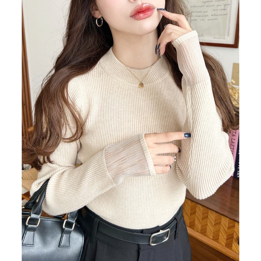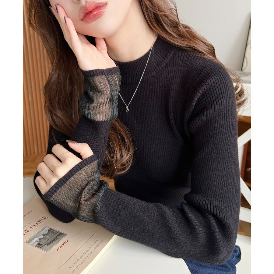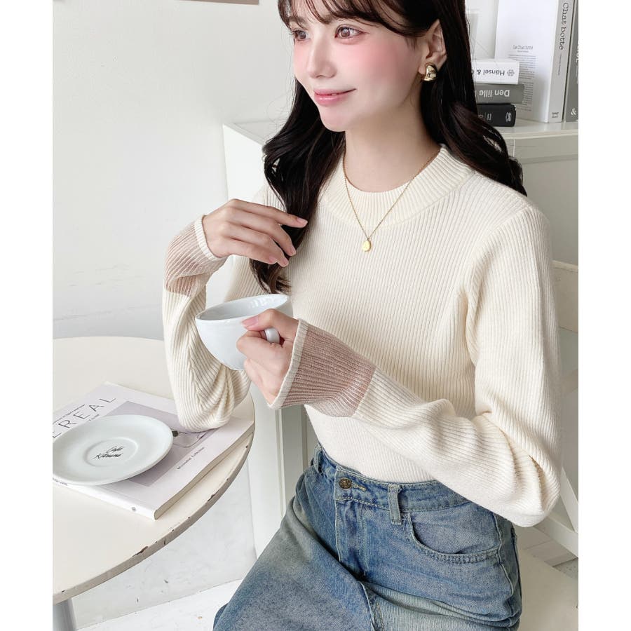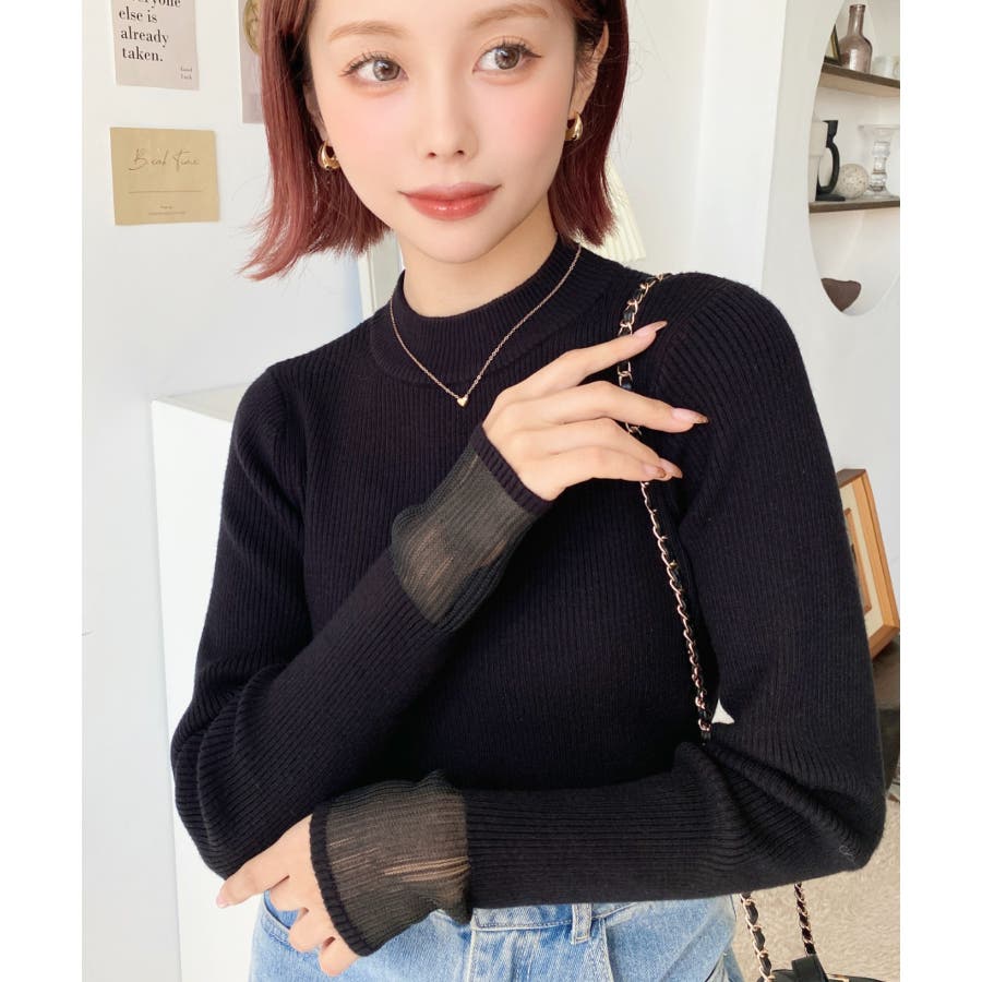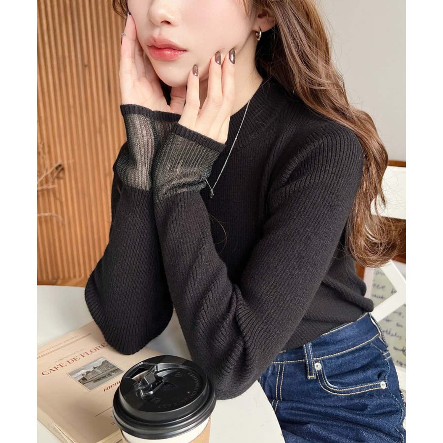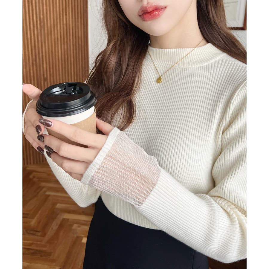 ・シンプルリブニットで袖だけシアーになったお洒落ニットが仲間入り!異素材ミックスがさりげなくて◎