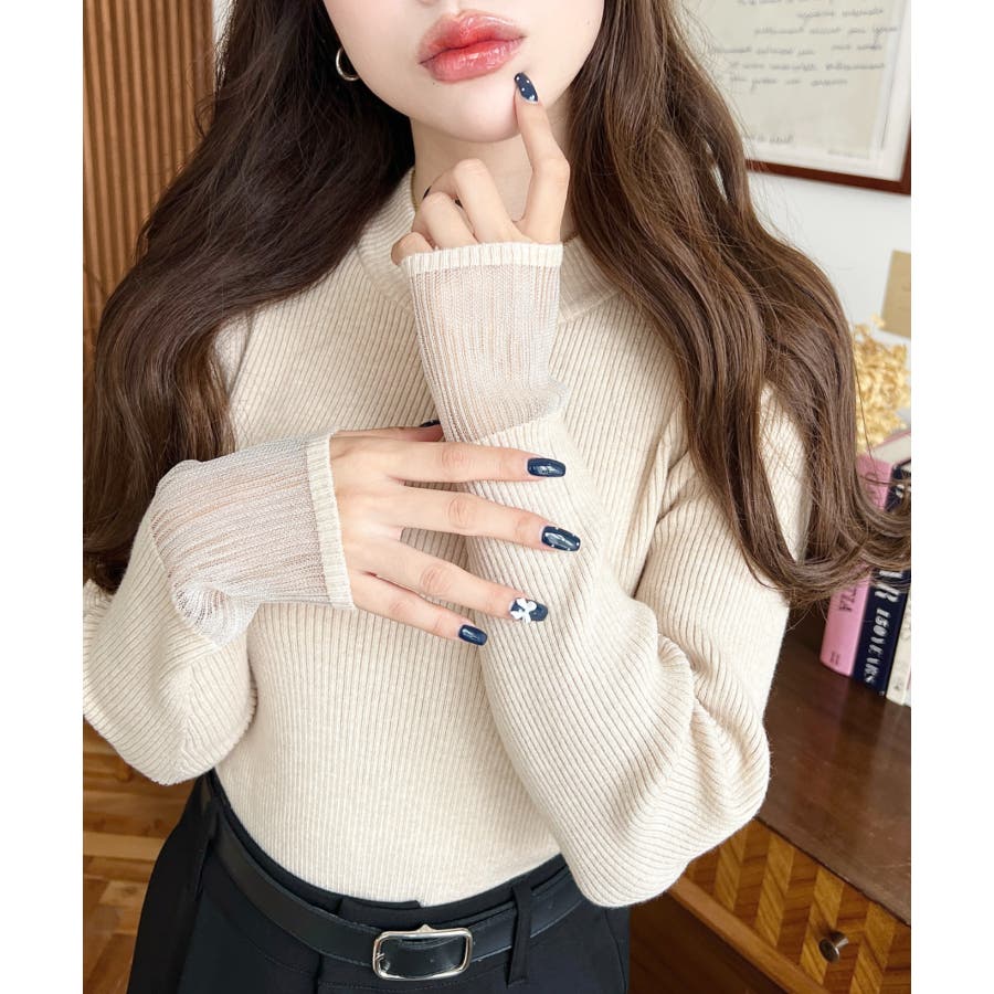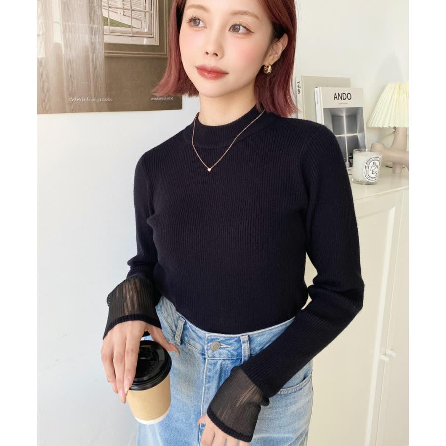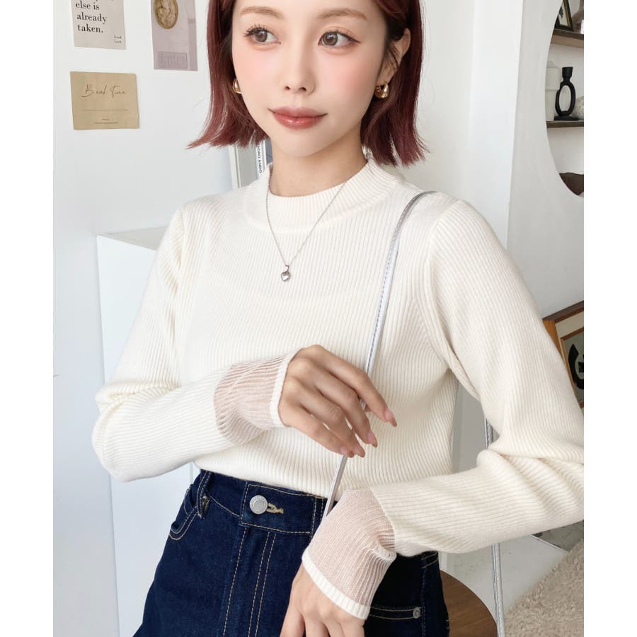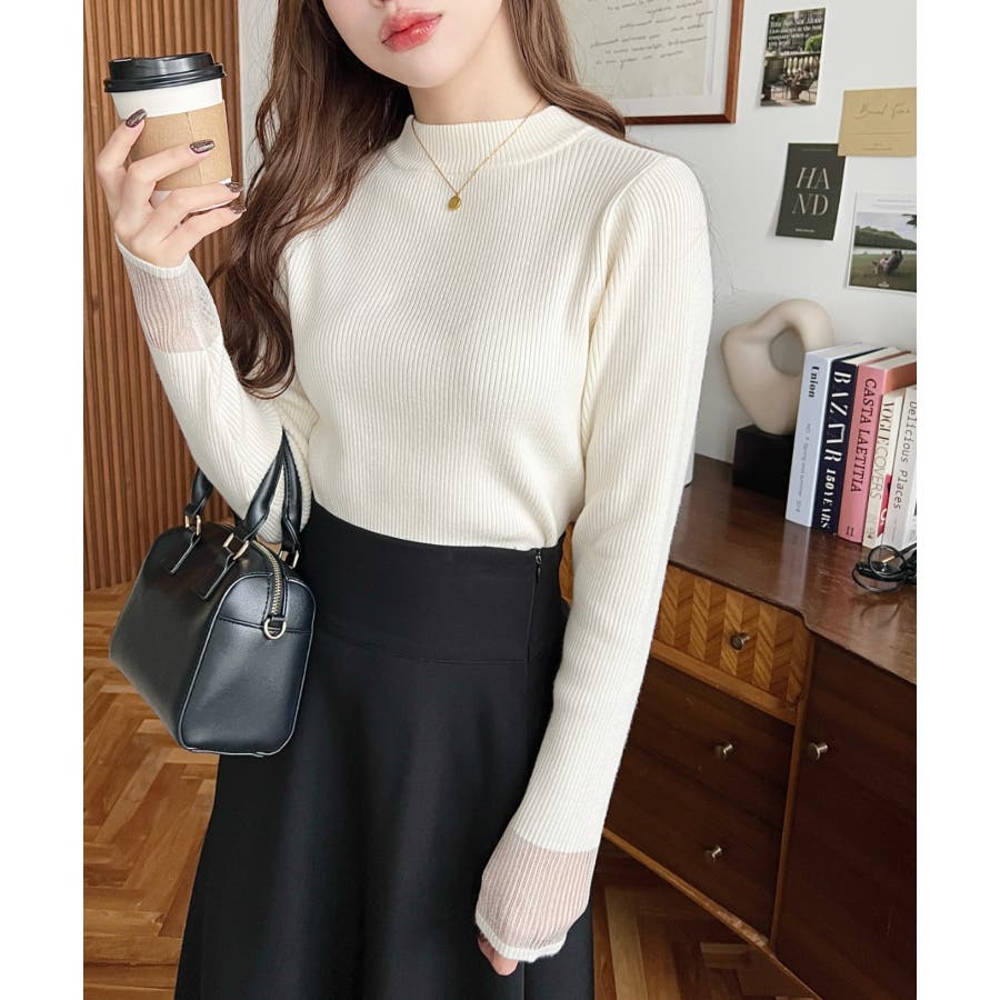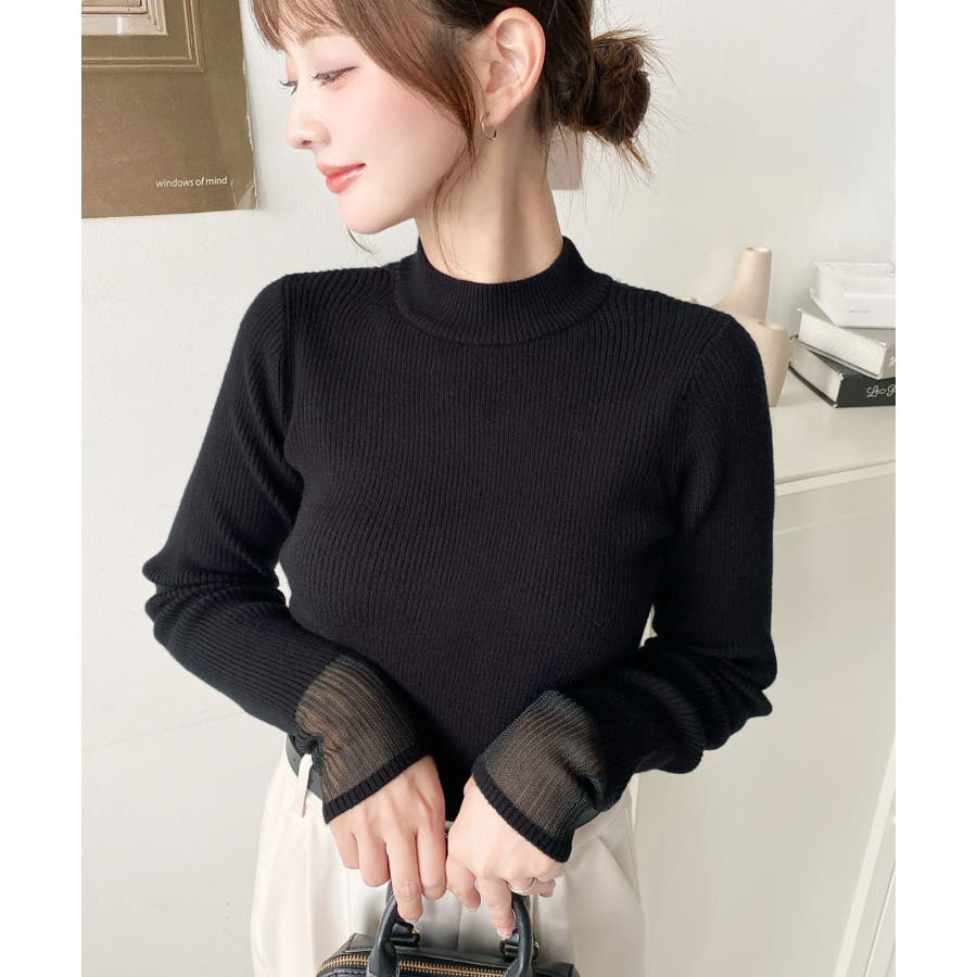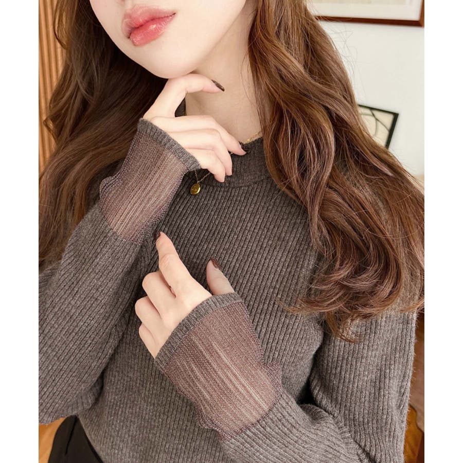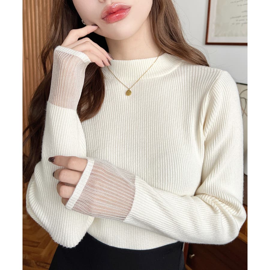 ・シンプルリブニットで袖だけシアーになったお洒落ニットが仲間入り!異素材ミックスがさりげなくて◎