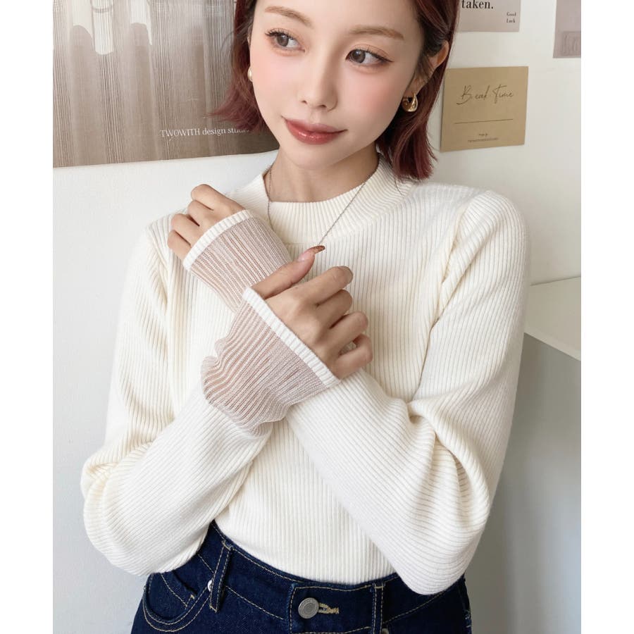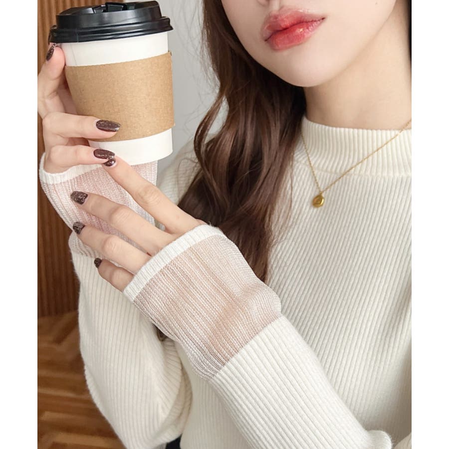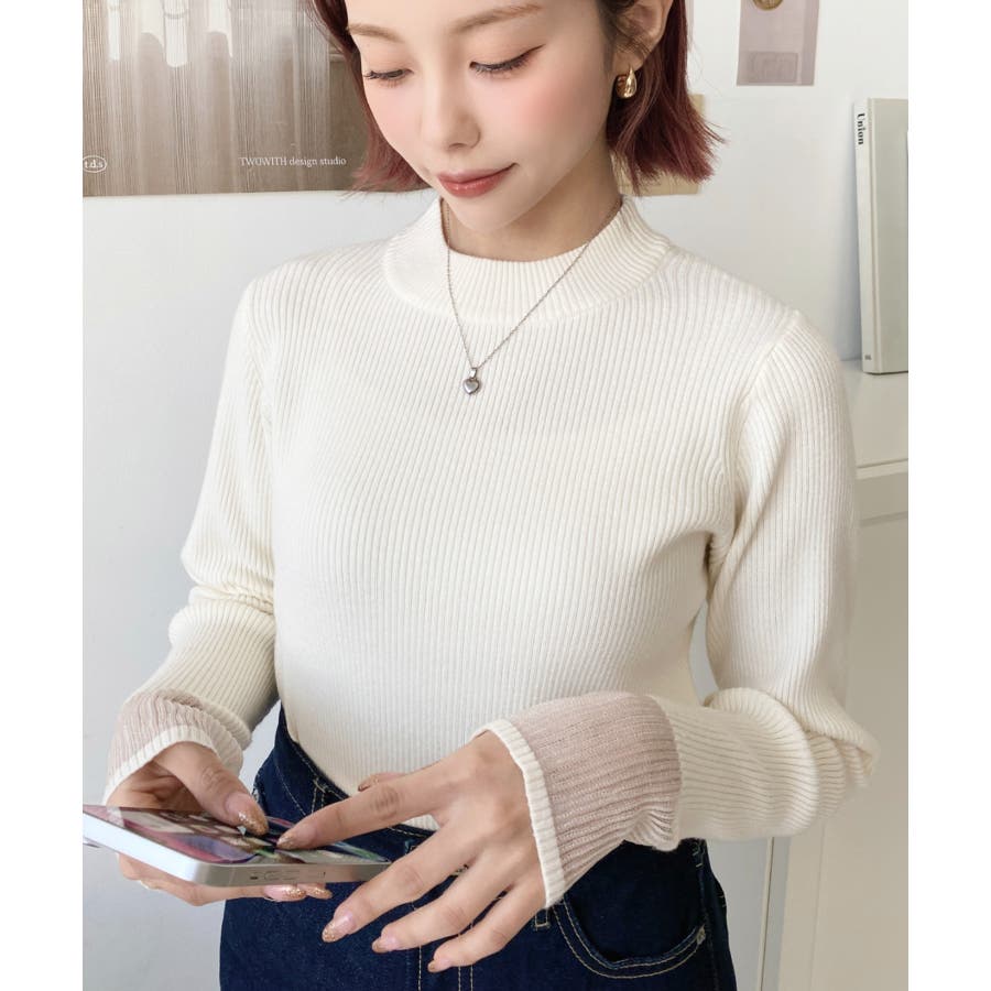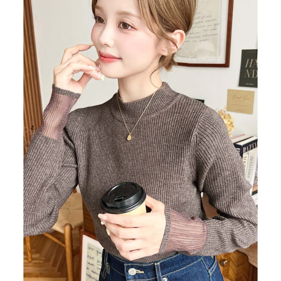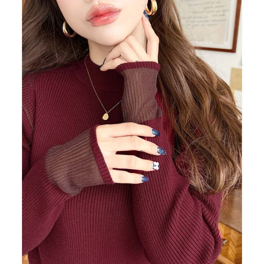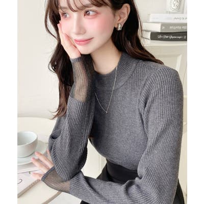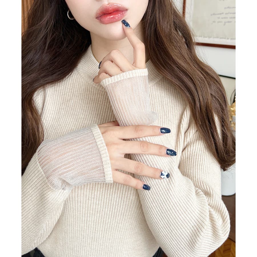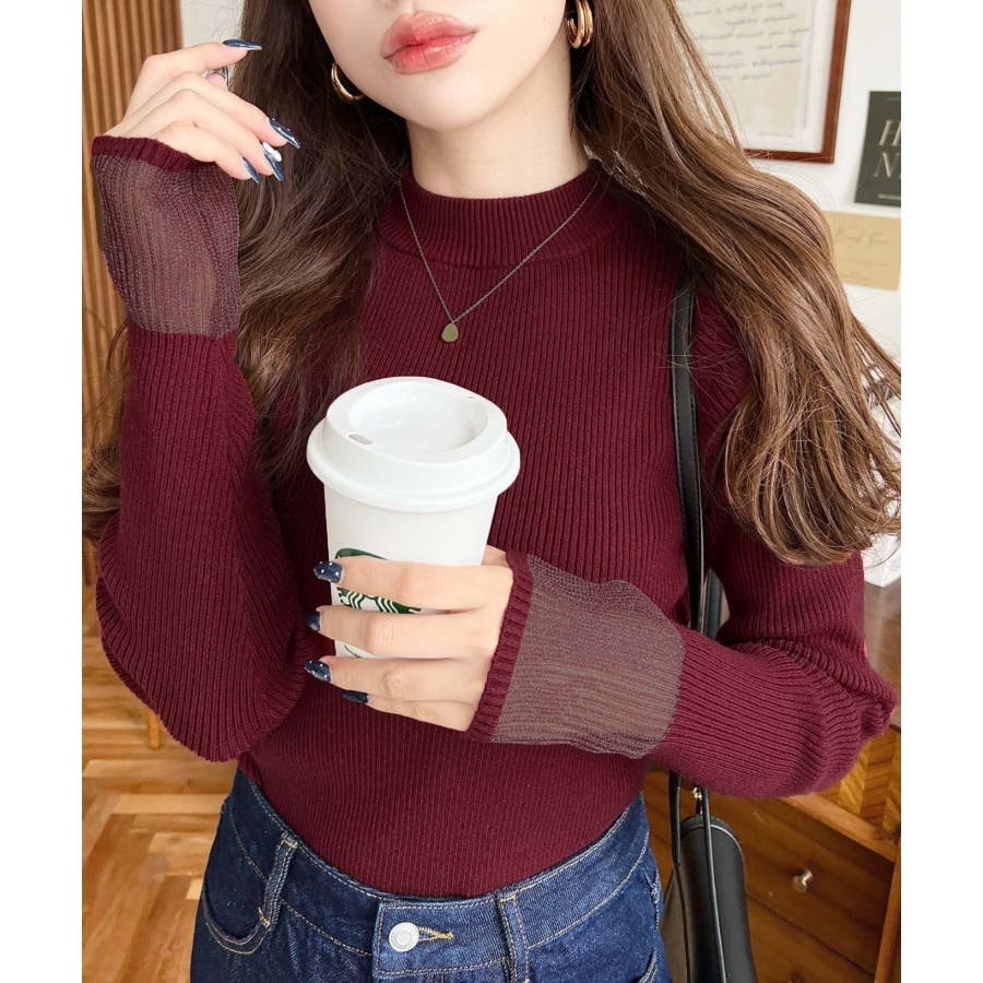 ・シンプルリブニットで袖だけシアーになったお洒落ニットが仲間入り!異素材ミックスがさりげなくて◎