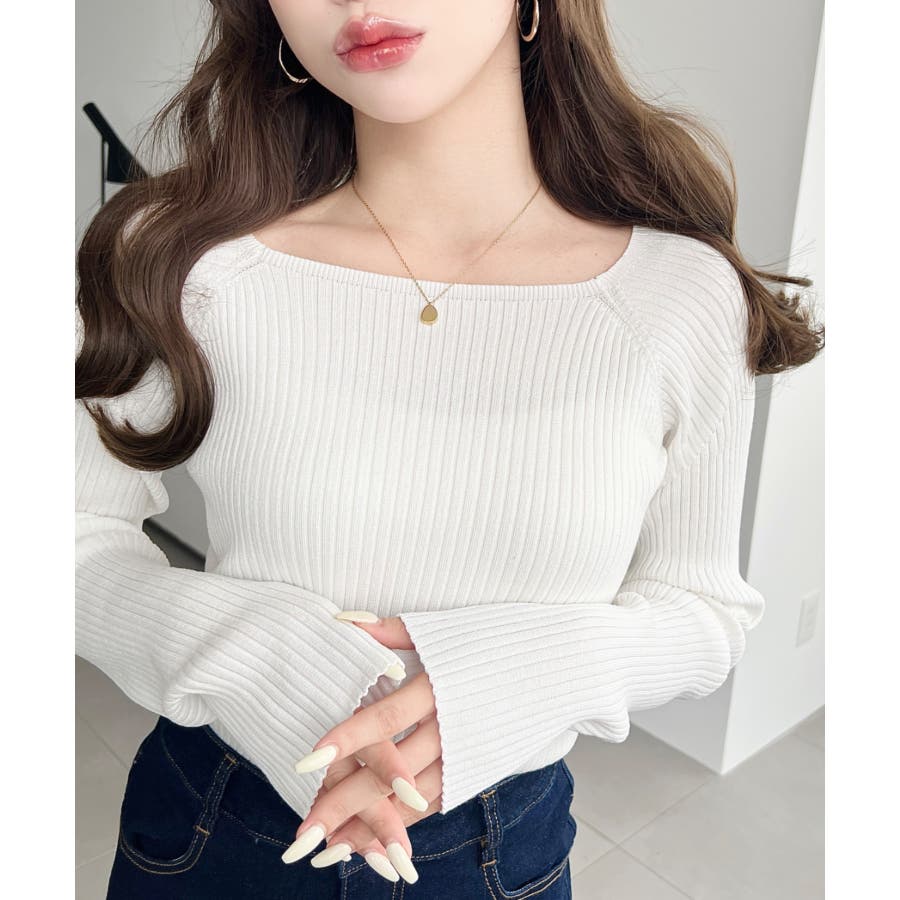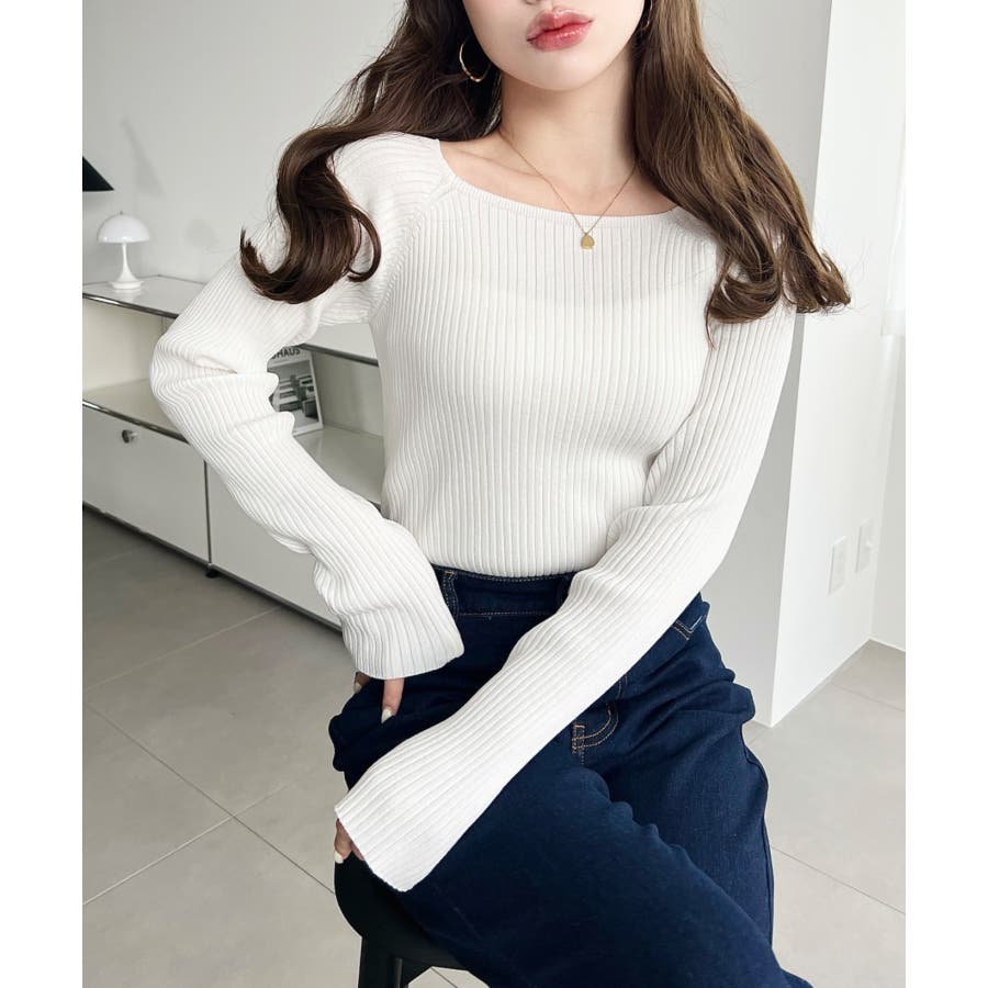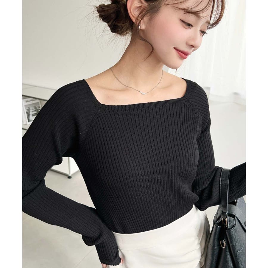 ・シンプルなリブニットにスクエアネックの大人ポイントが抜け感のあるアクセントに。