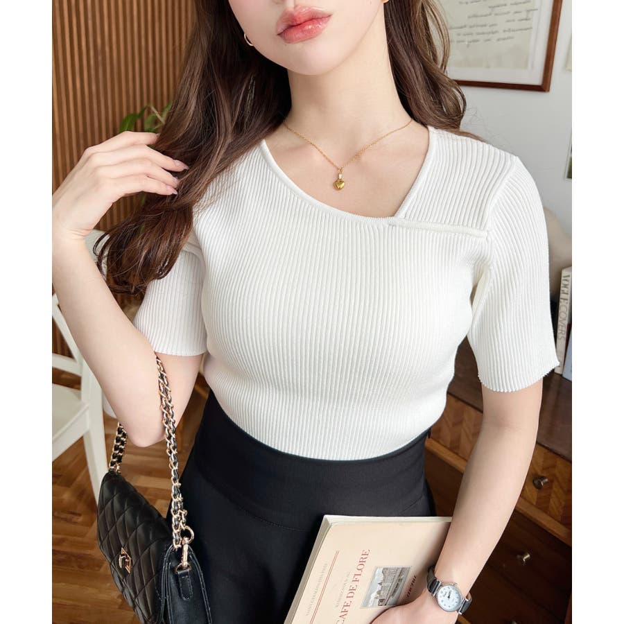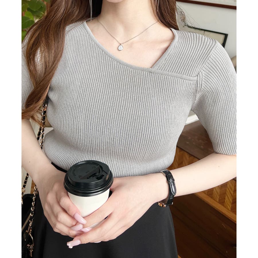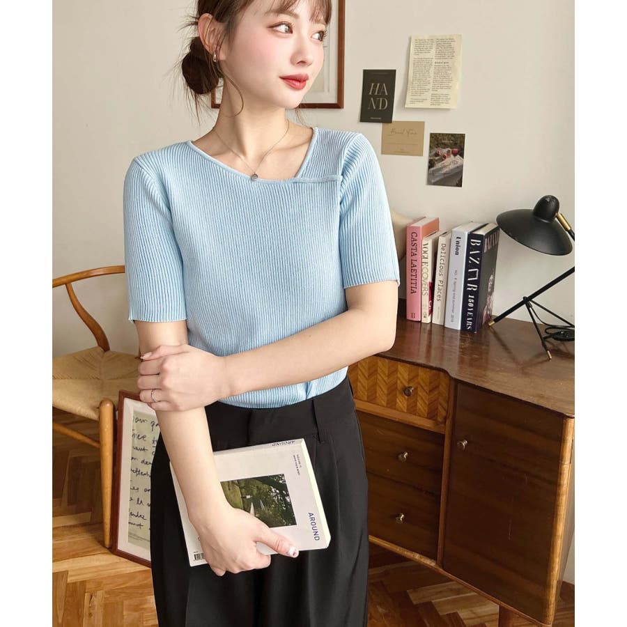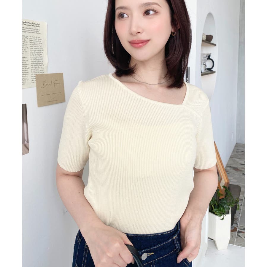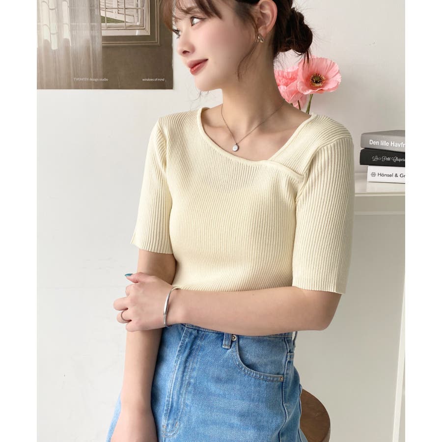 アシンメトリーネックSS半袖リブニットプルオーバー