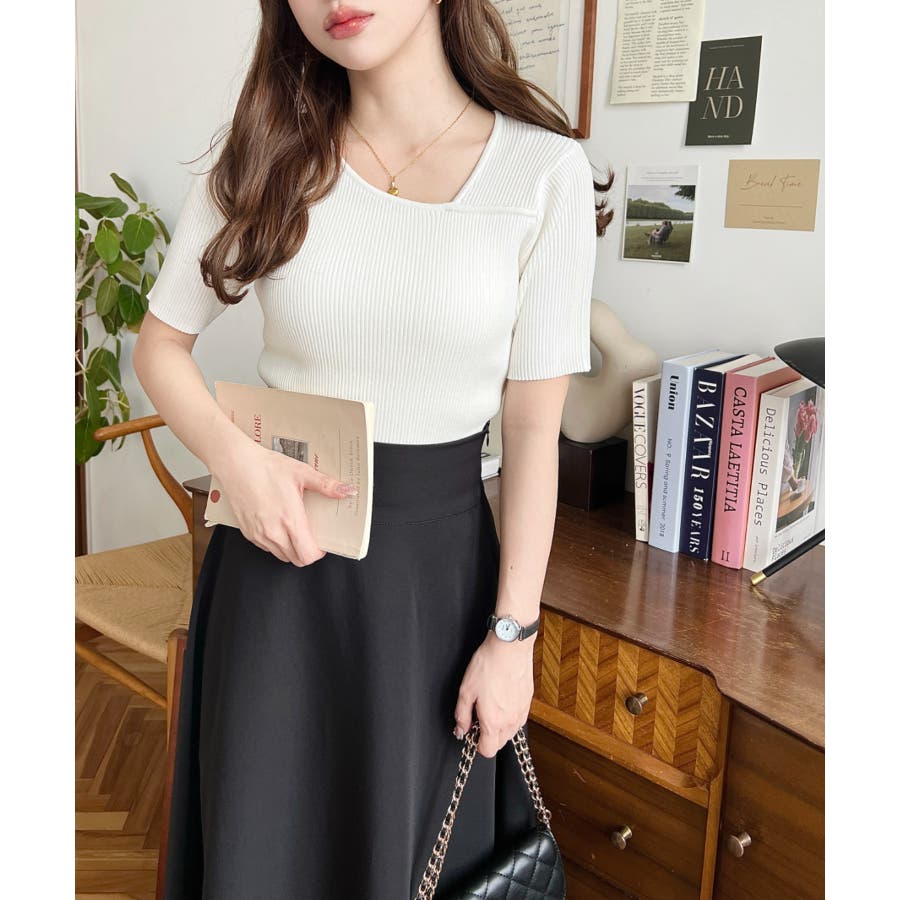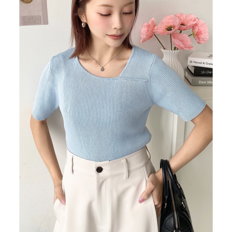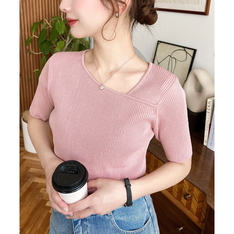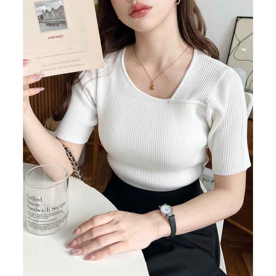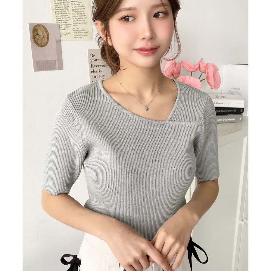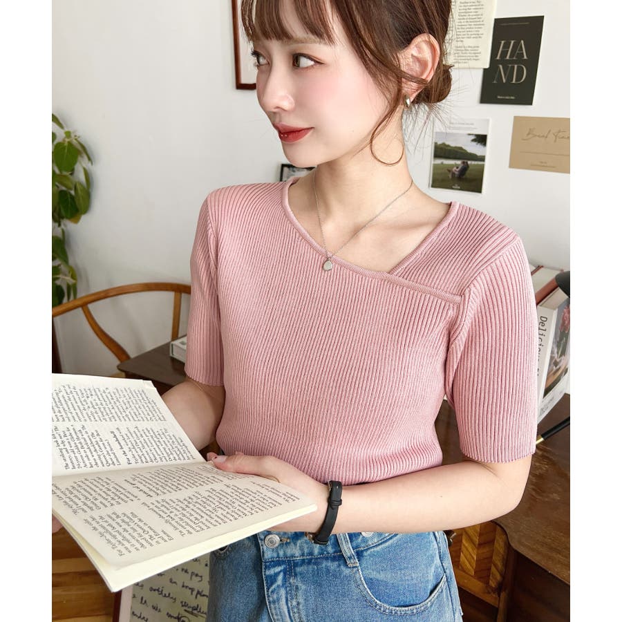 アシンメトリーネックSS半袖リブニットプルオーバー