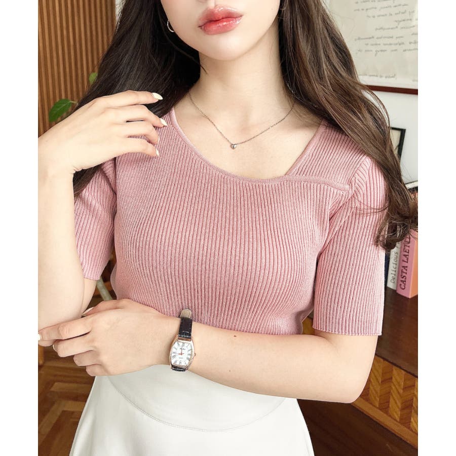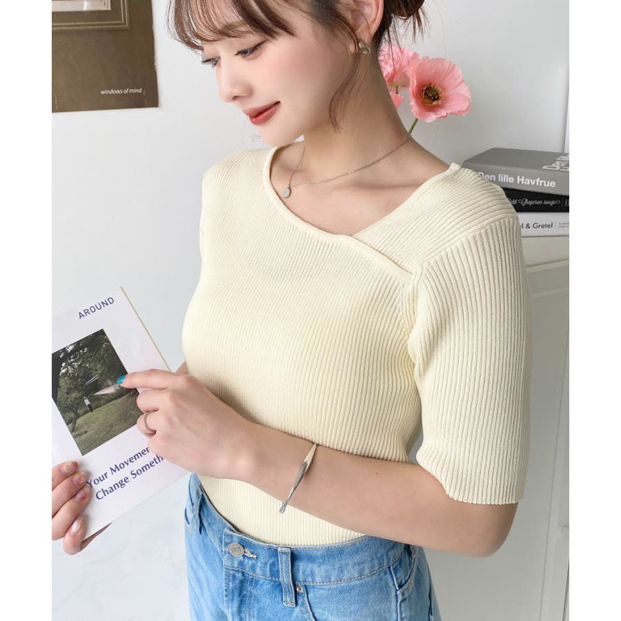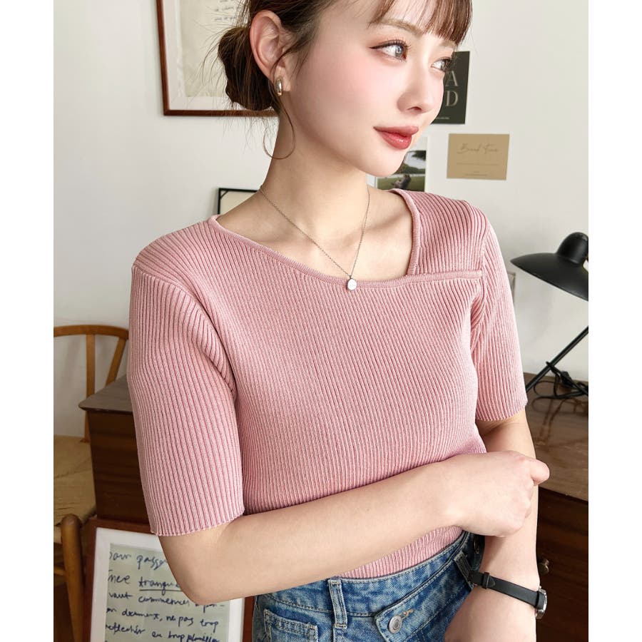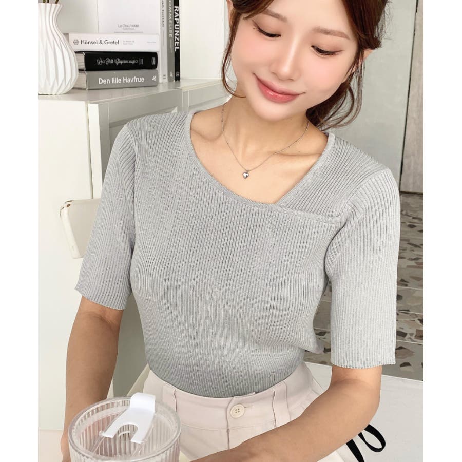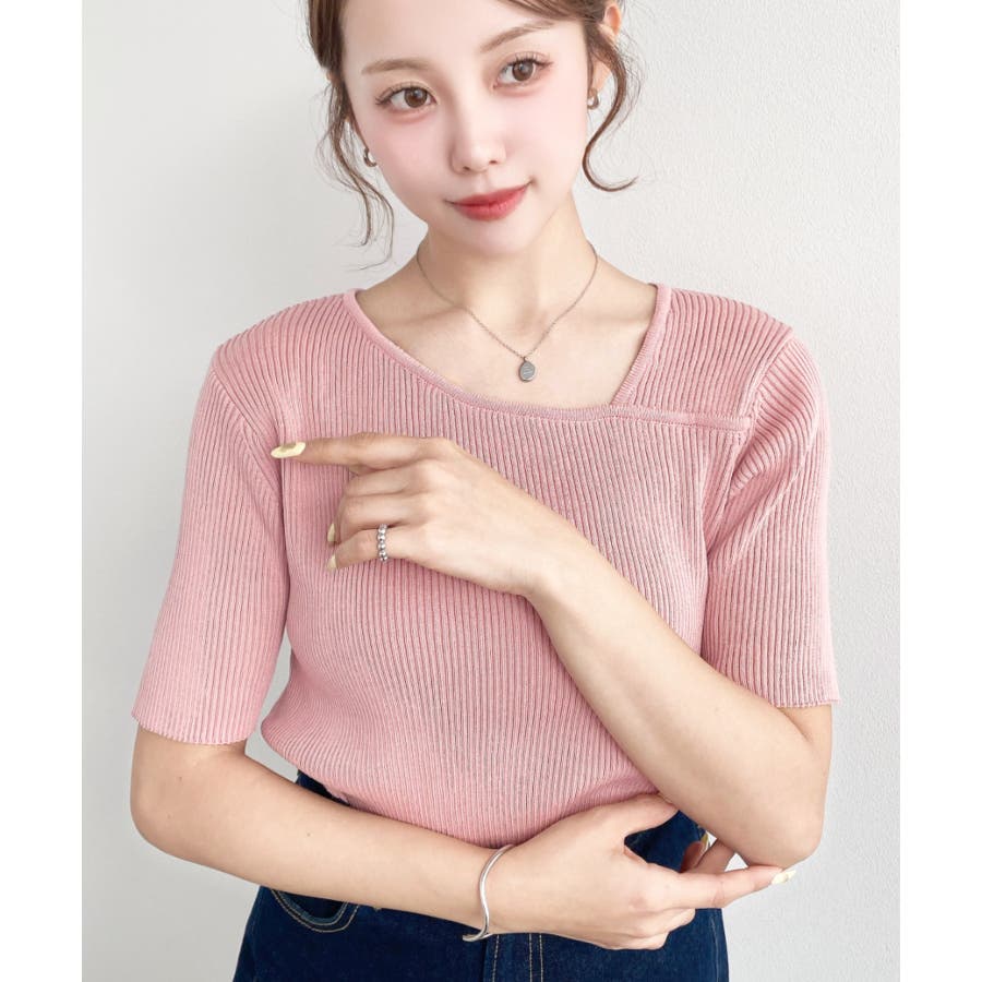 アシンメトリーネックSS半袖リブニットプルオーバー