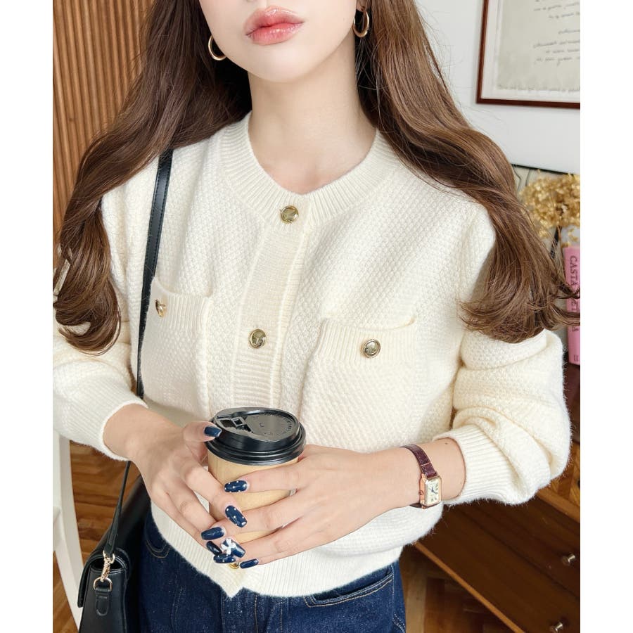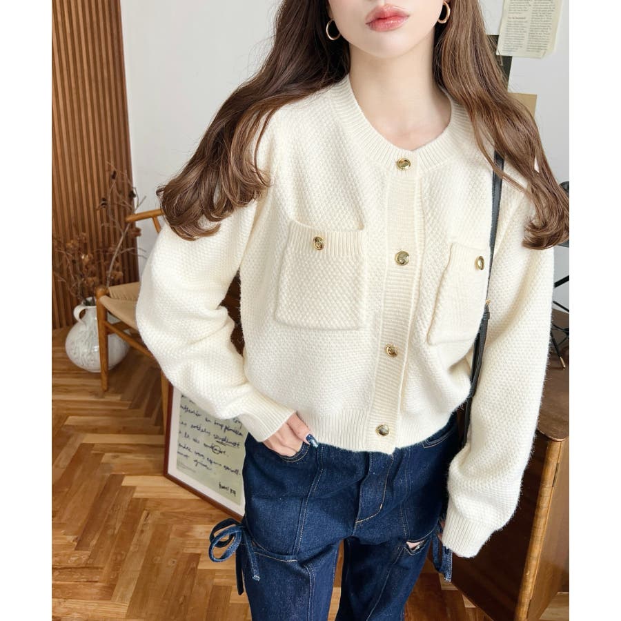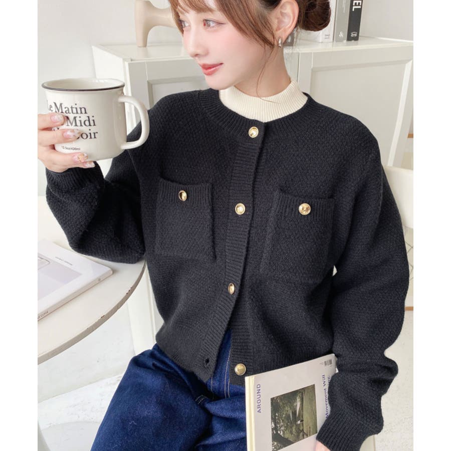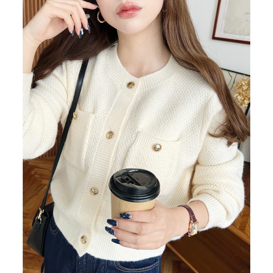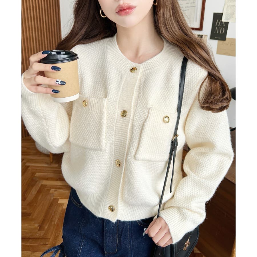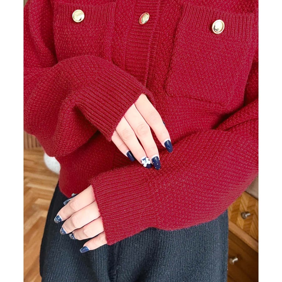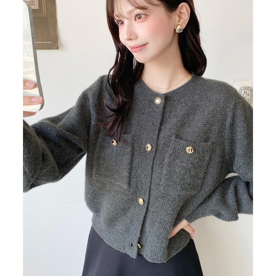 ・胸元のWポケットや金ボタンデザインが、上品なアクセントになりクラシカルな印象に魅せてくれるニットカーディガンです♪