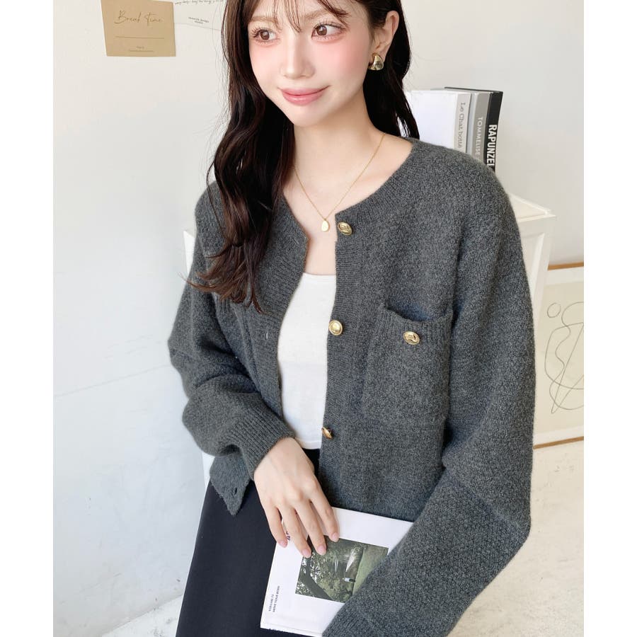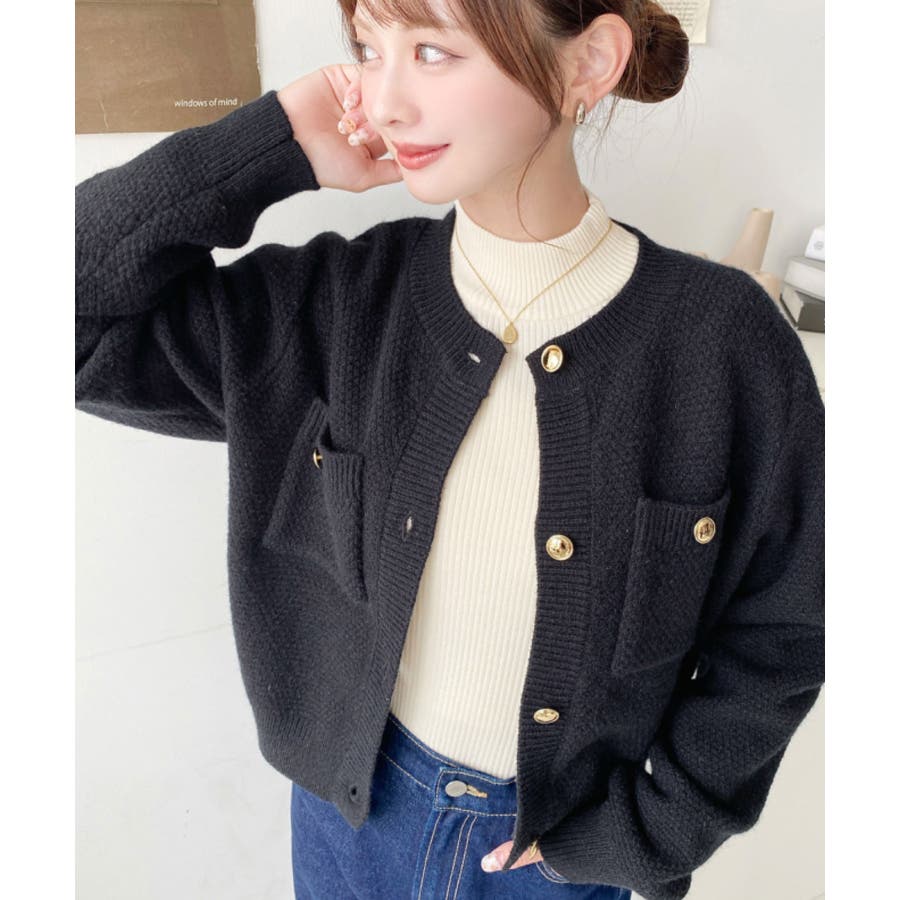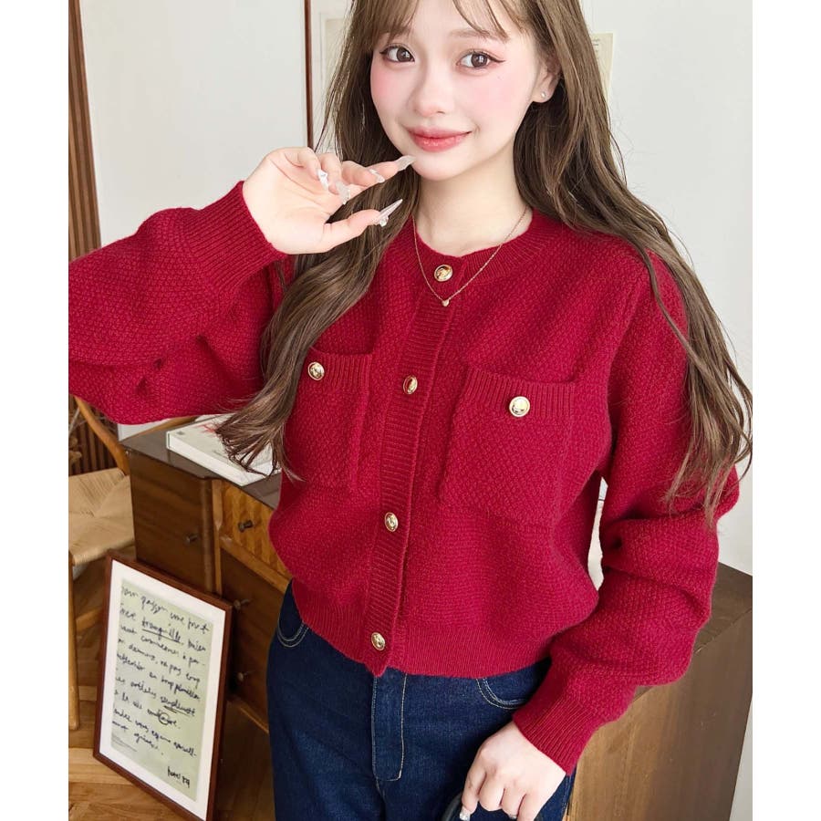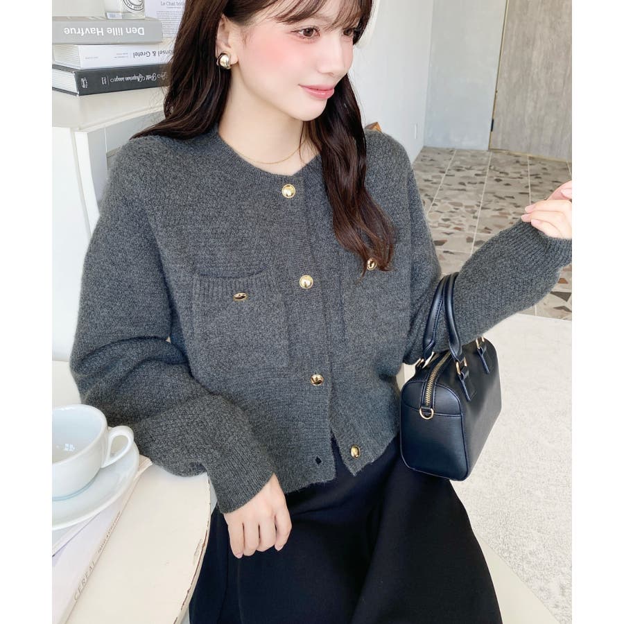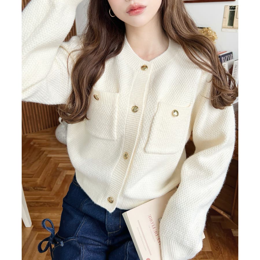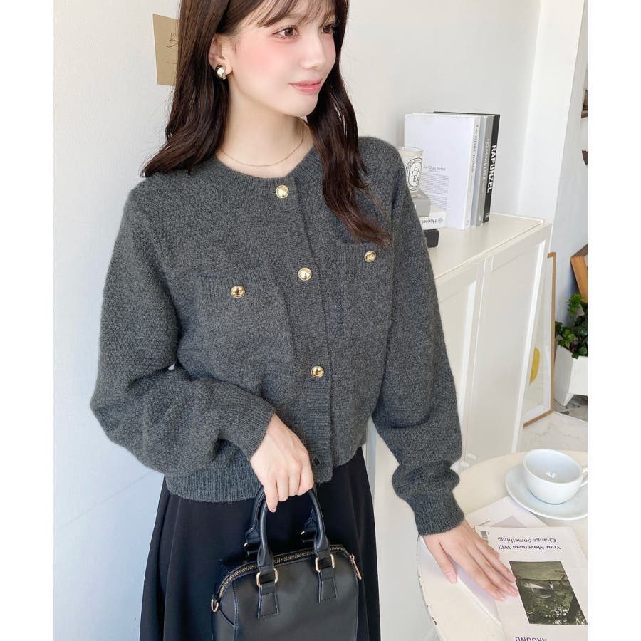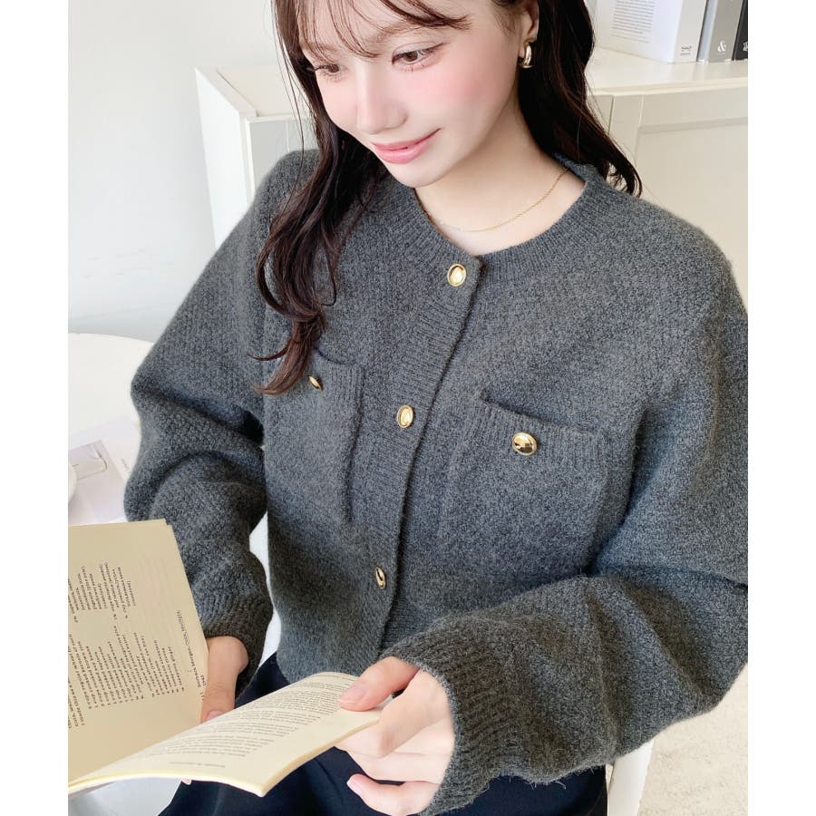 ・胸元のWポケットや金ボタンデザインが、上品なアクセントになりクラシカルな印象に魅せてくれるニットカーディガンです♪