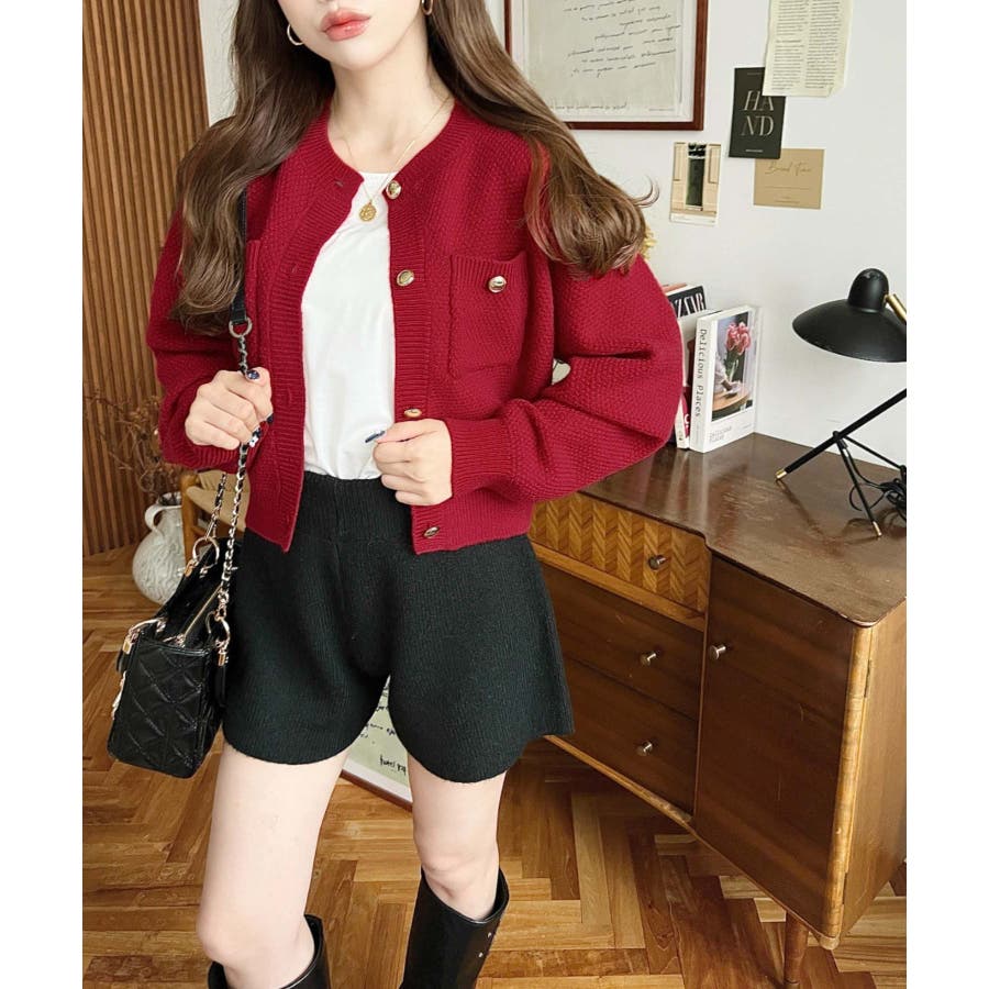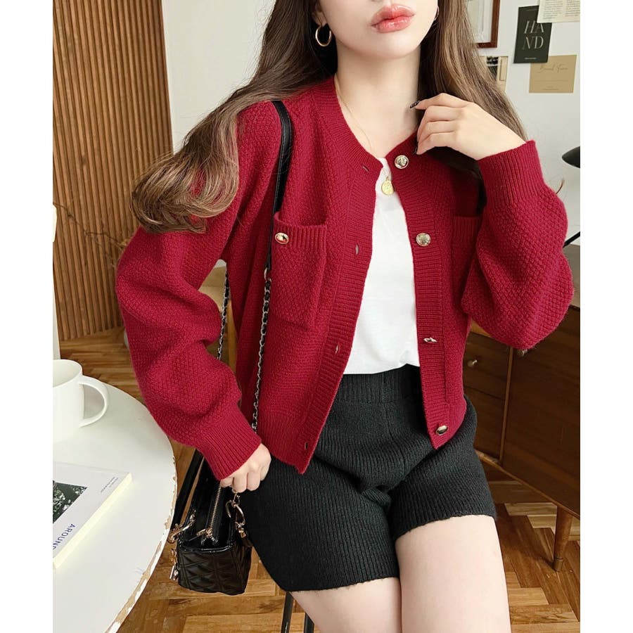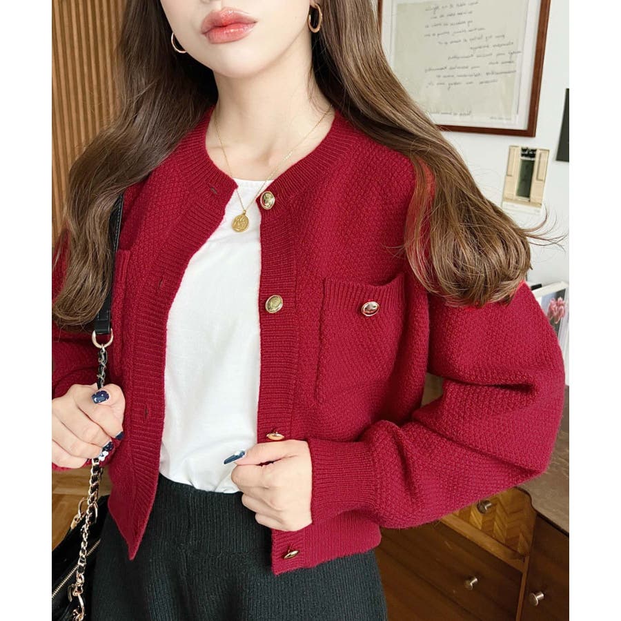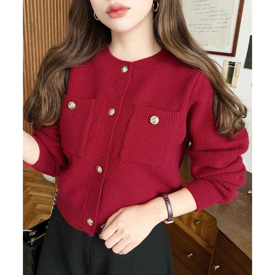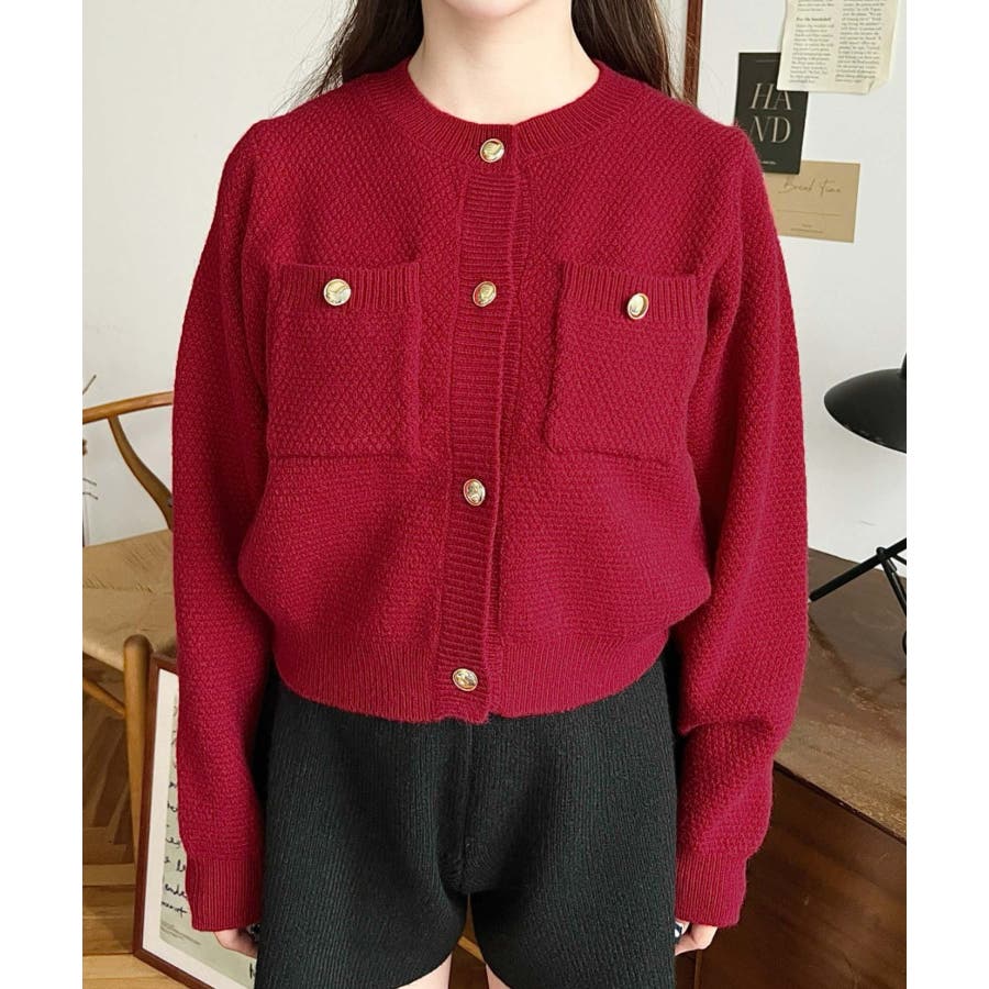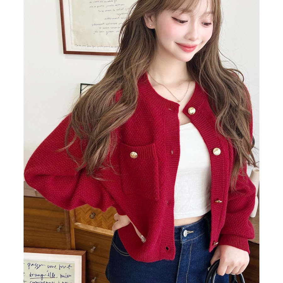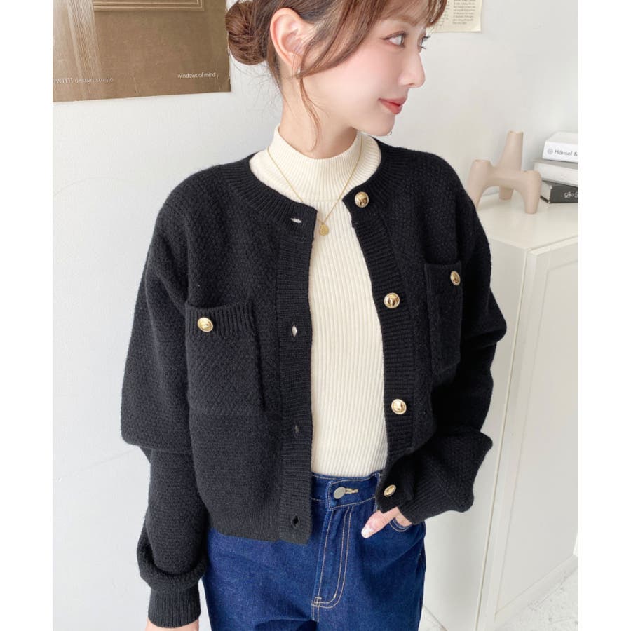 ・胸元のWポケットや金ボタンデザインが、上品なアクセントになりクラシカルな印象に魅せてくれるニットカーディガンです♪