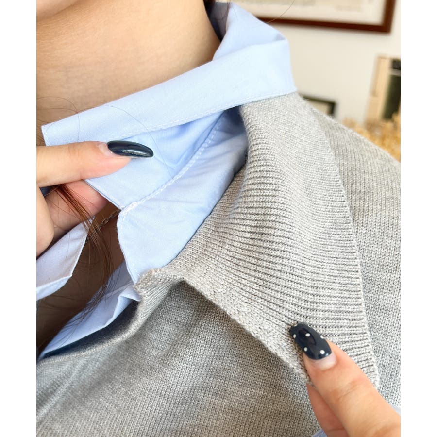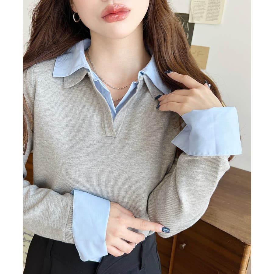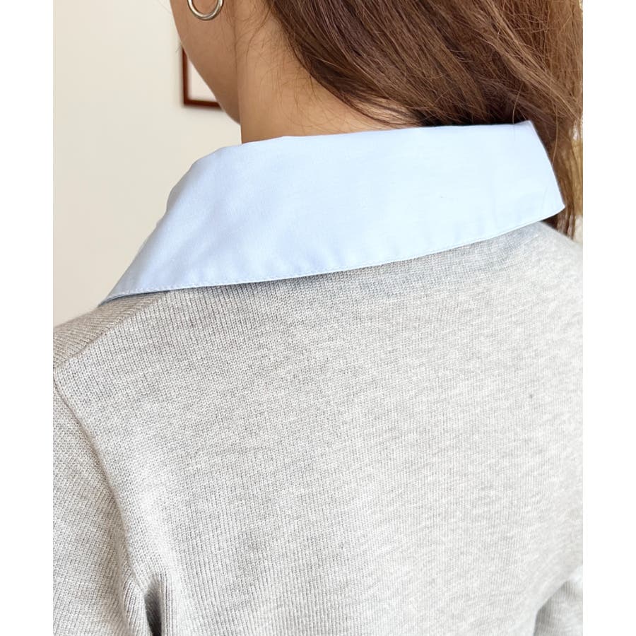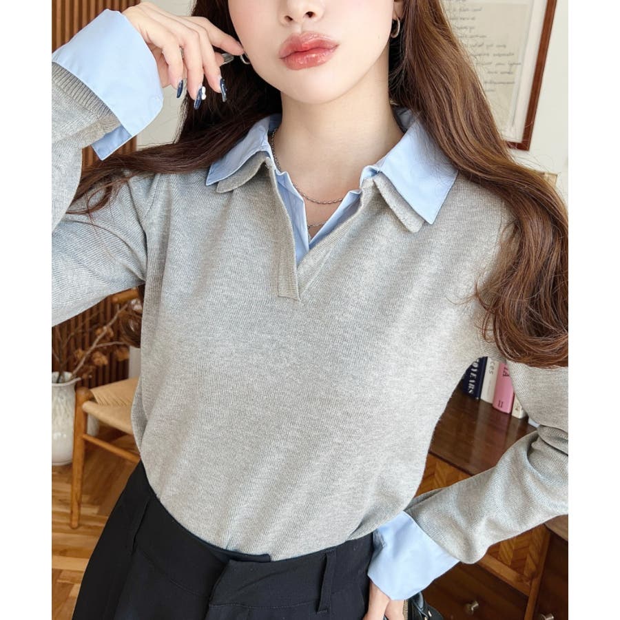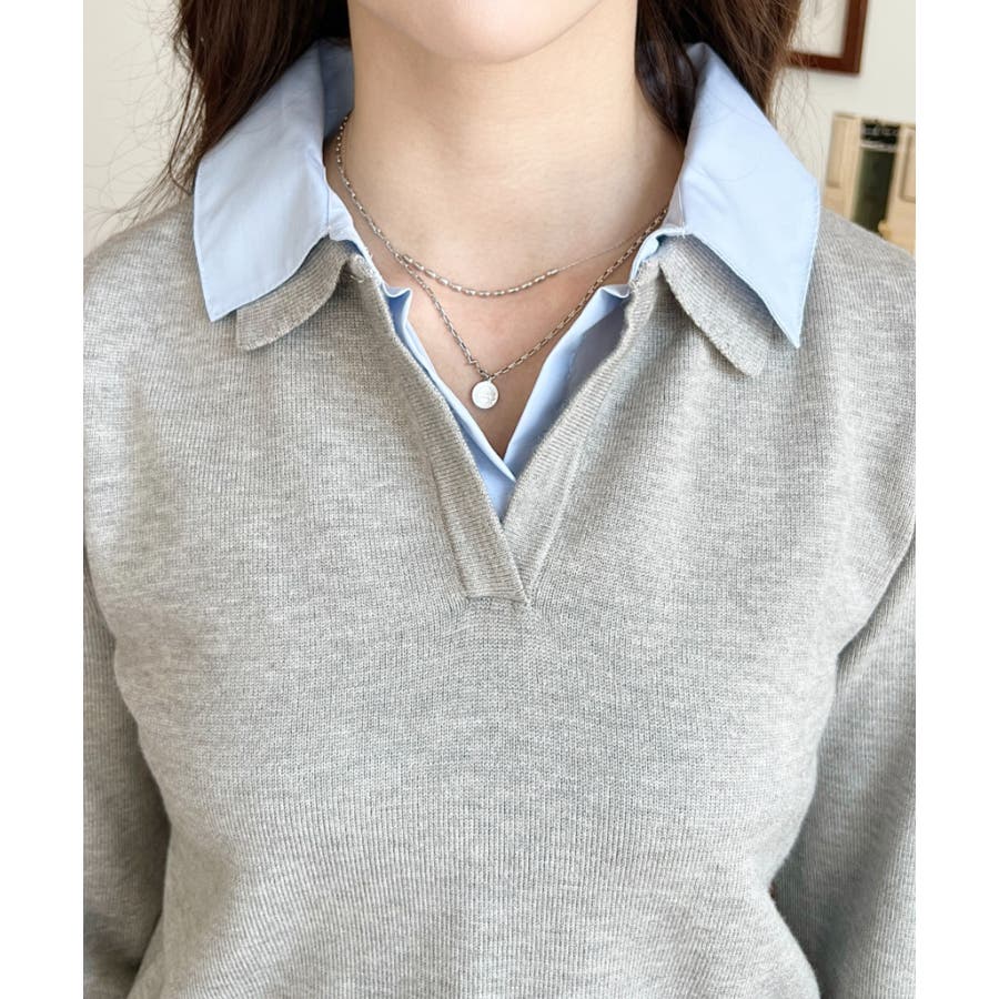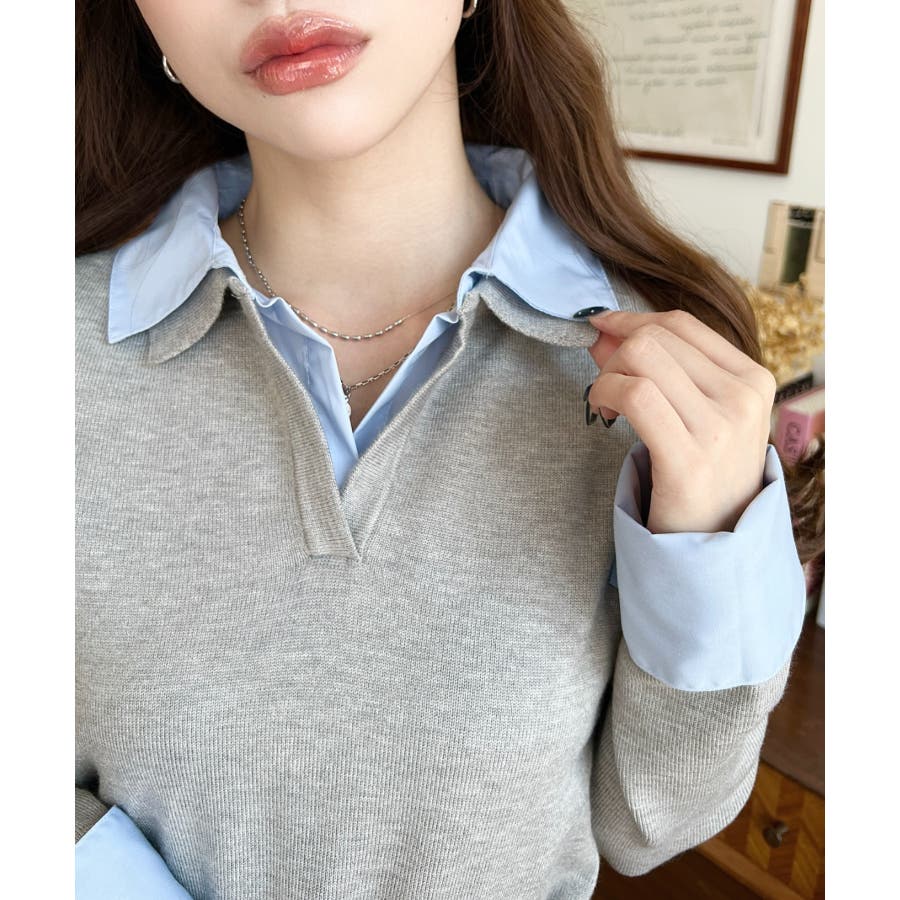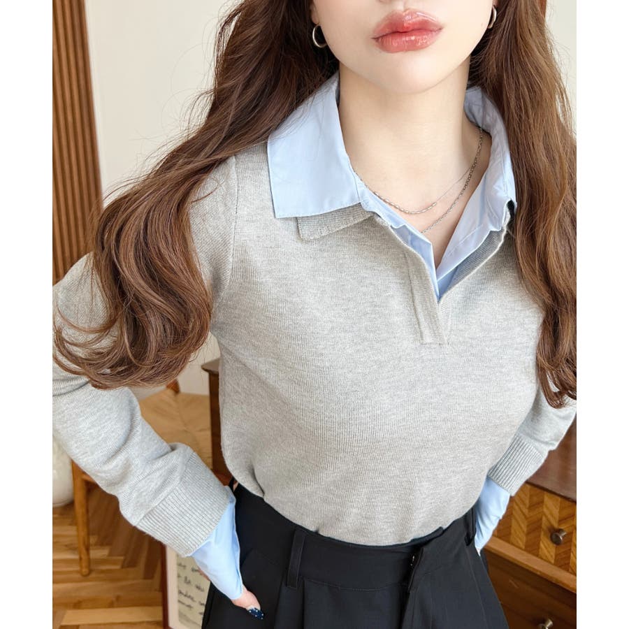 シャツレイヤードライク襟付きポロニットプルオーバー