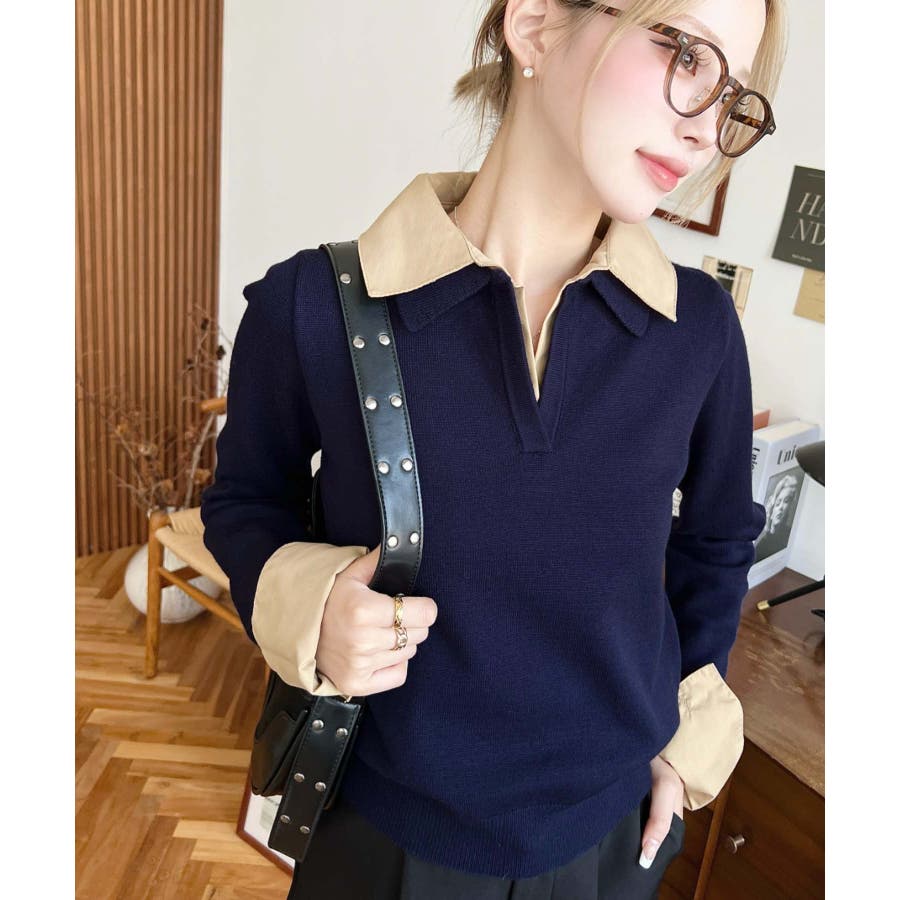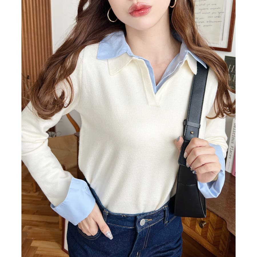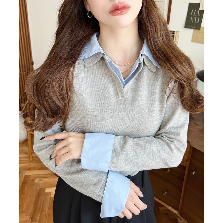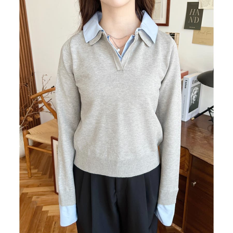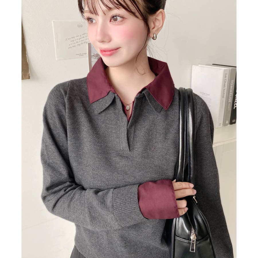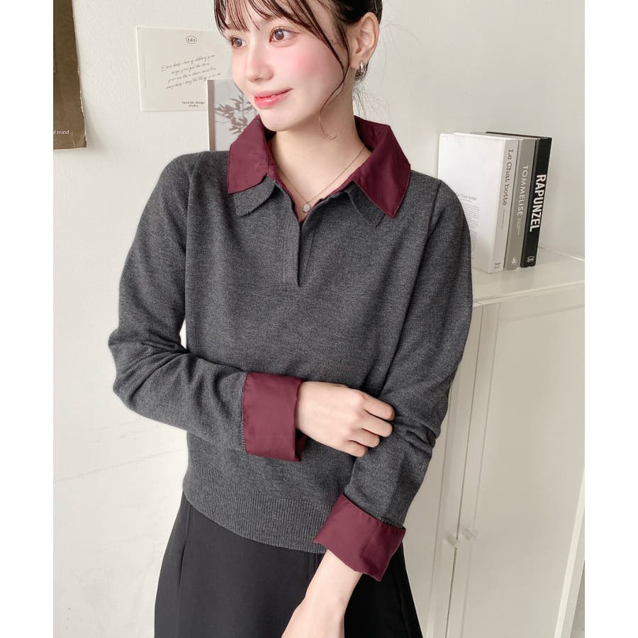 シャツレイヤードライク襟付きポロニットプルオーバー