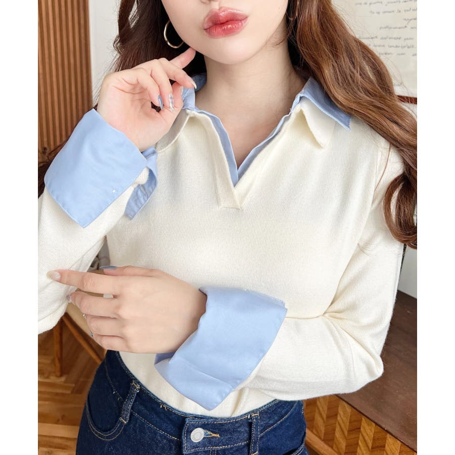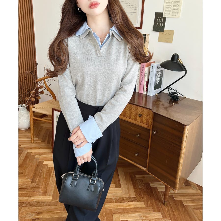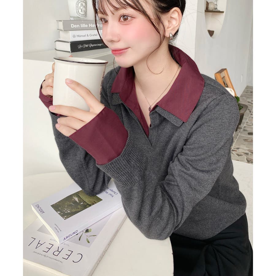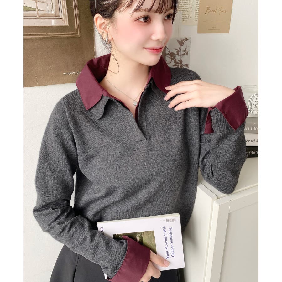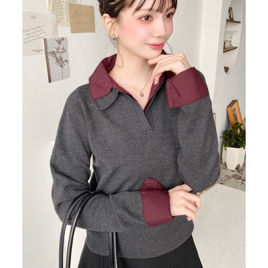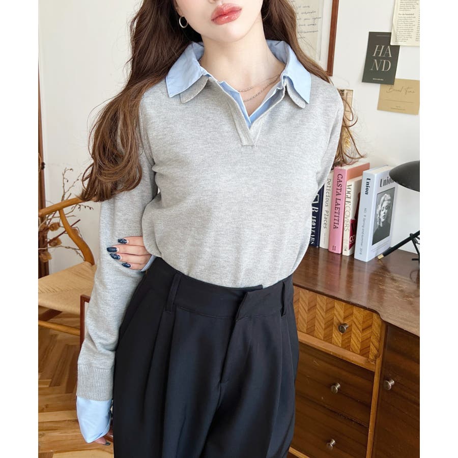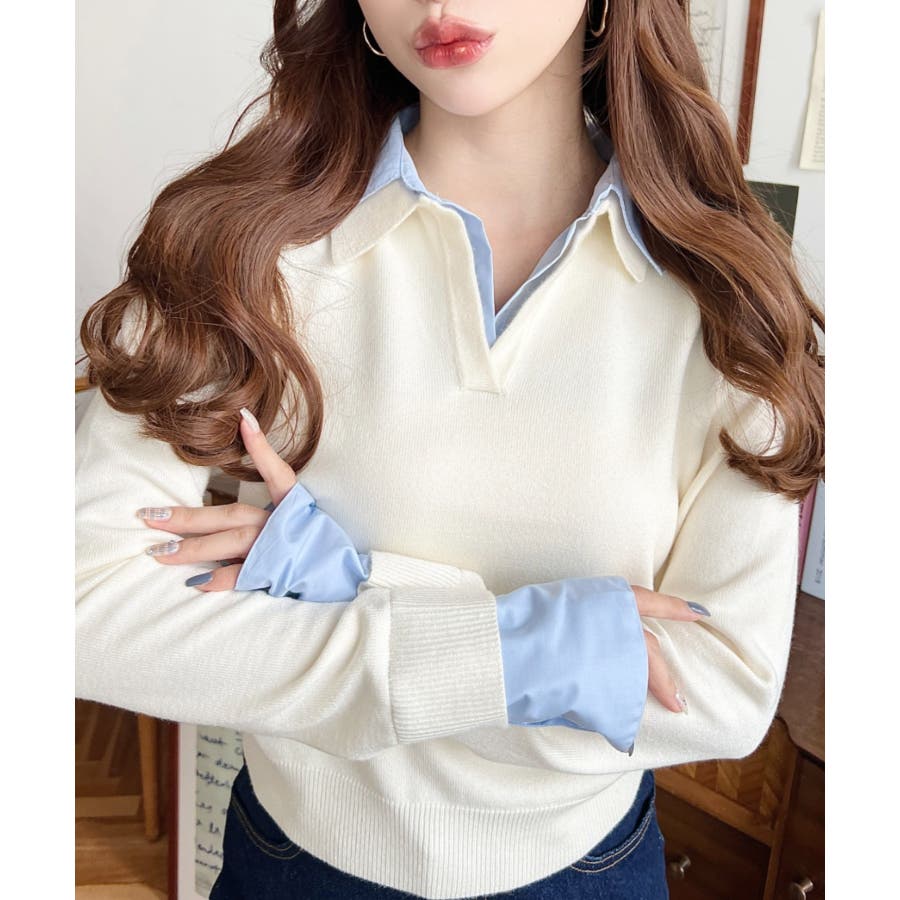 シャツレイヤードライク襟付きポロニットプルオーバー