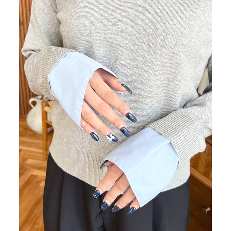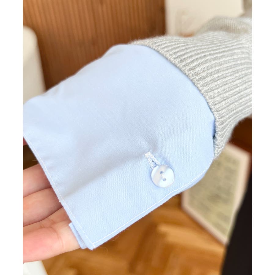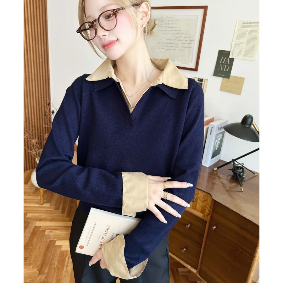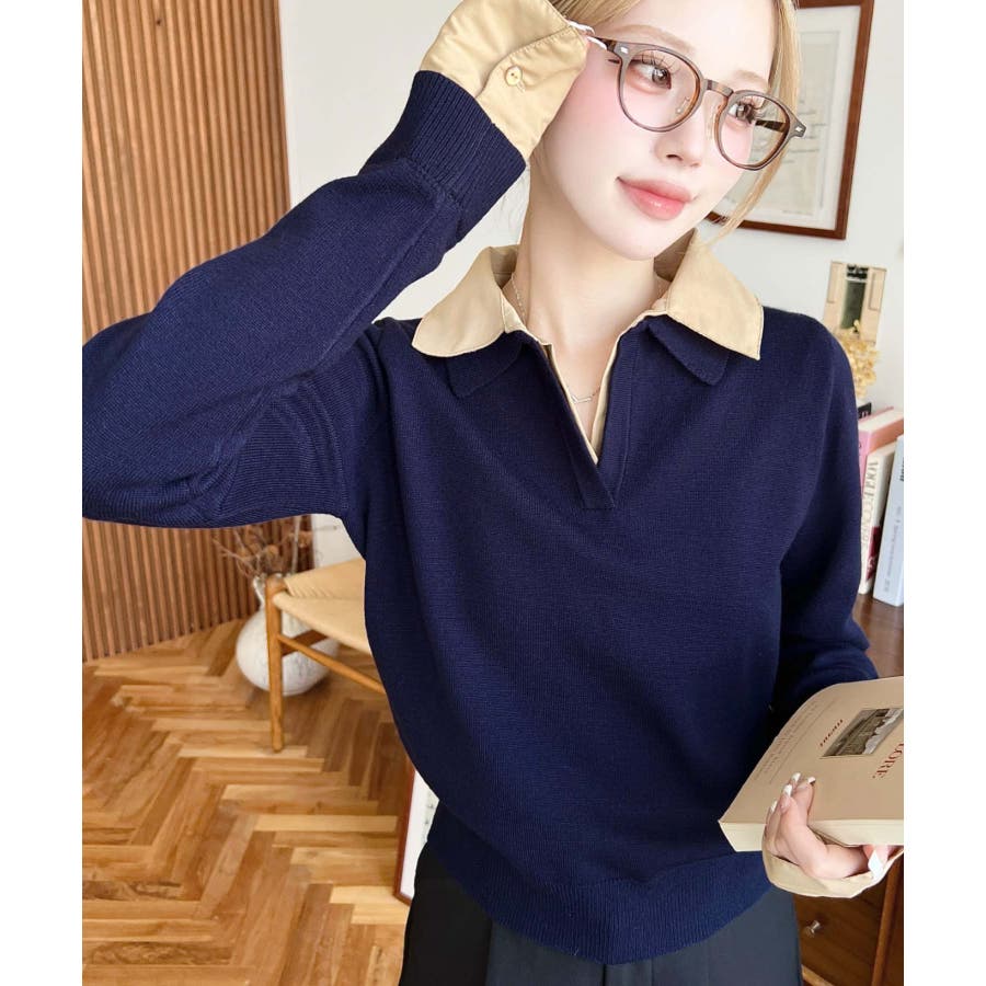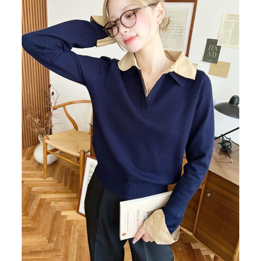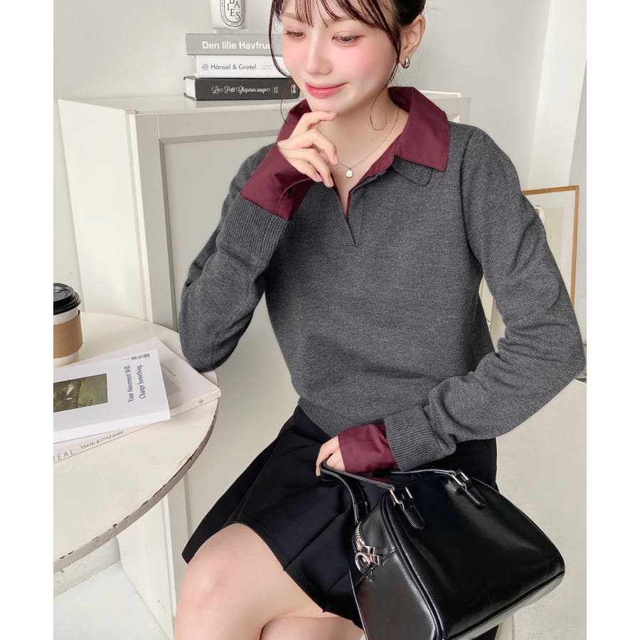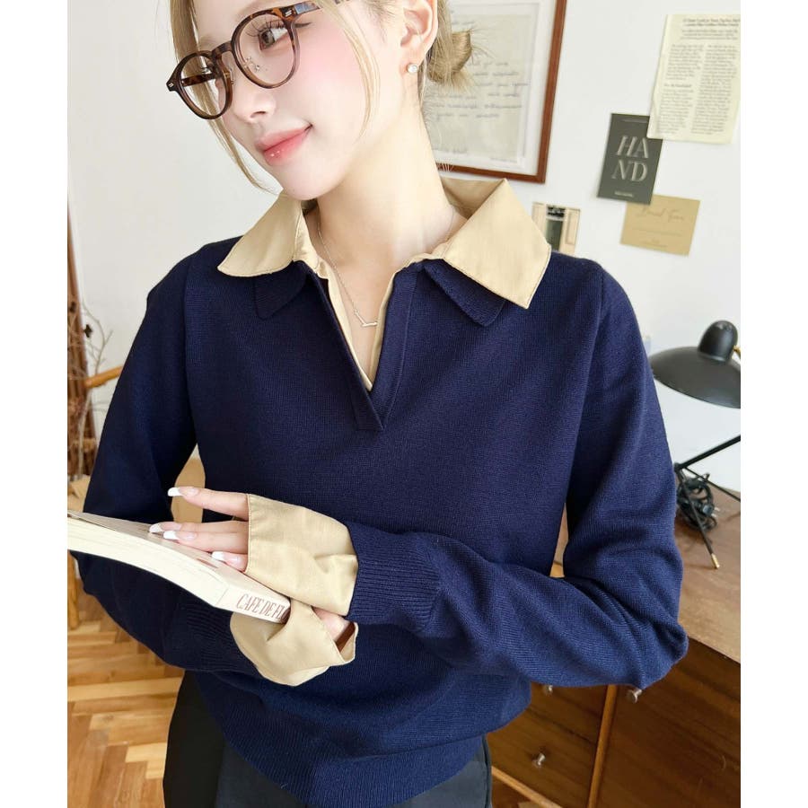 シャツレイヤードライク襟付きポロニットプルオーバー