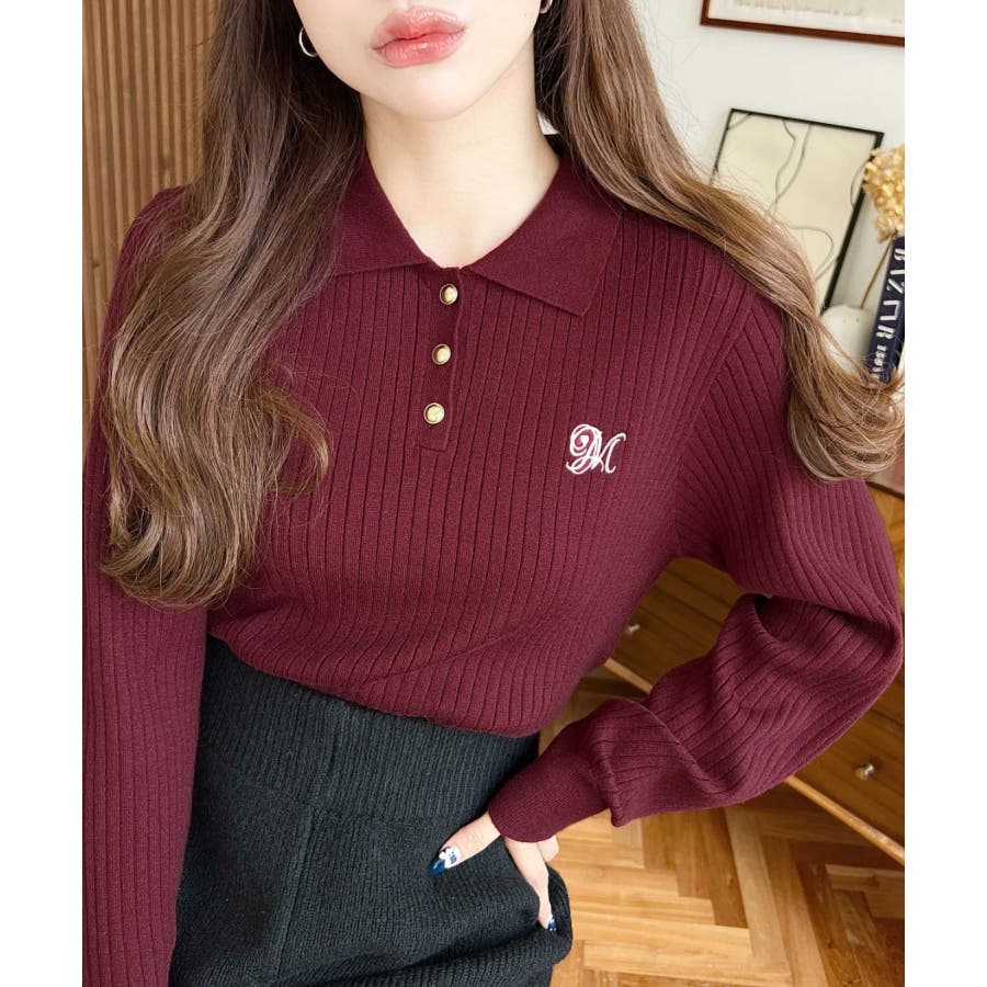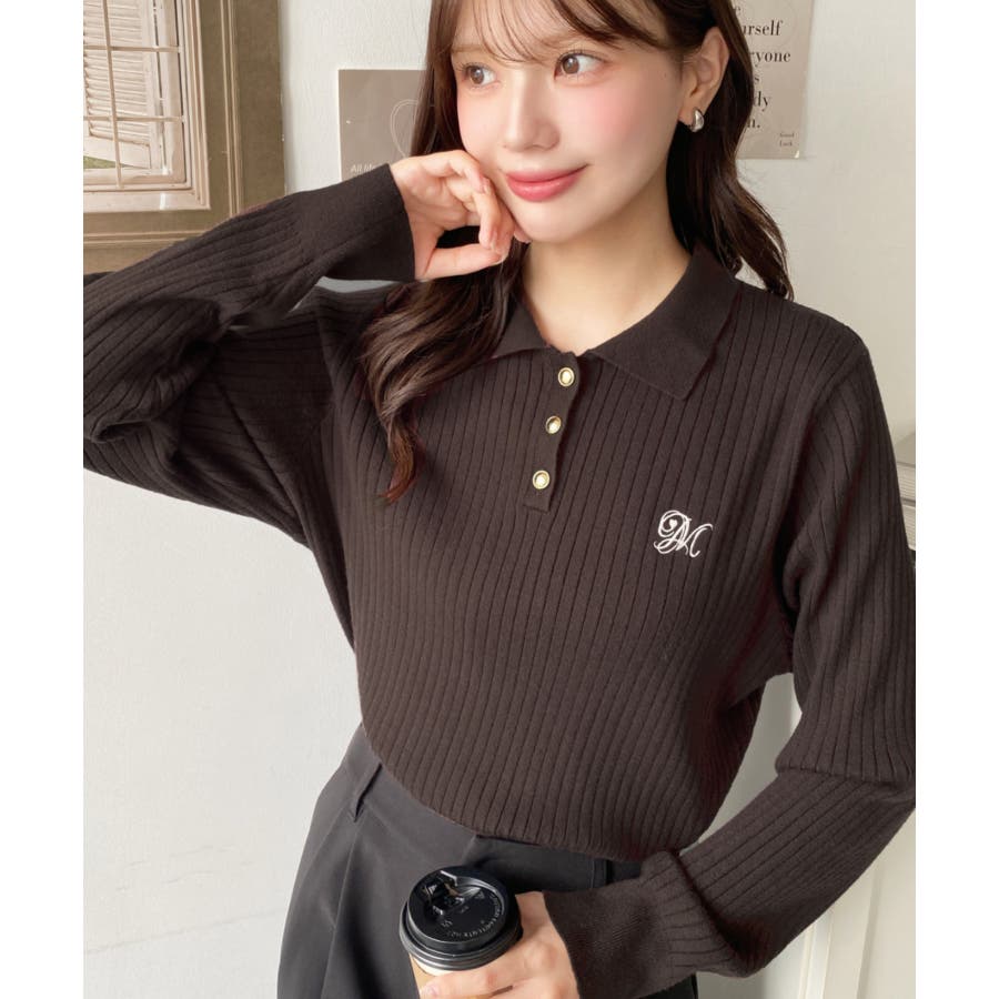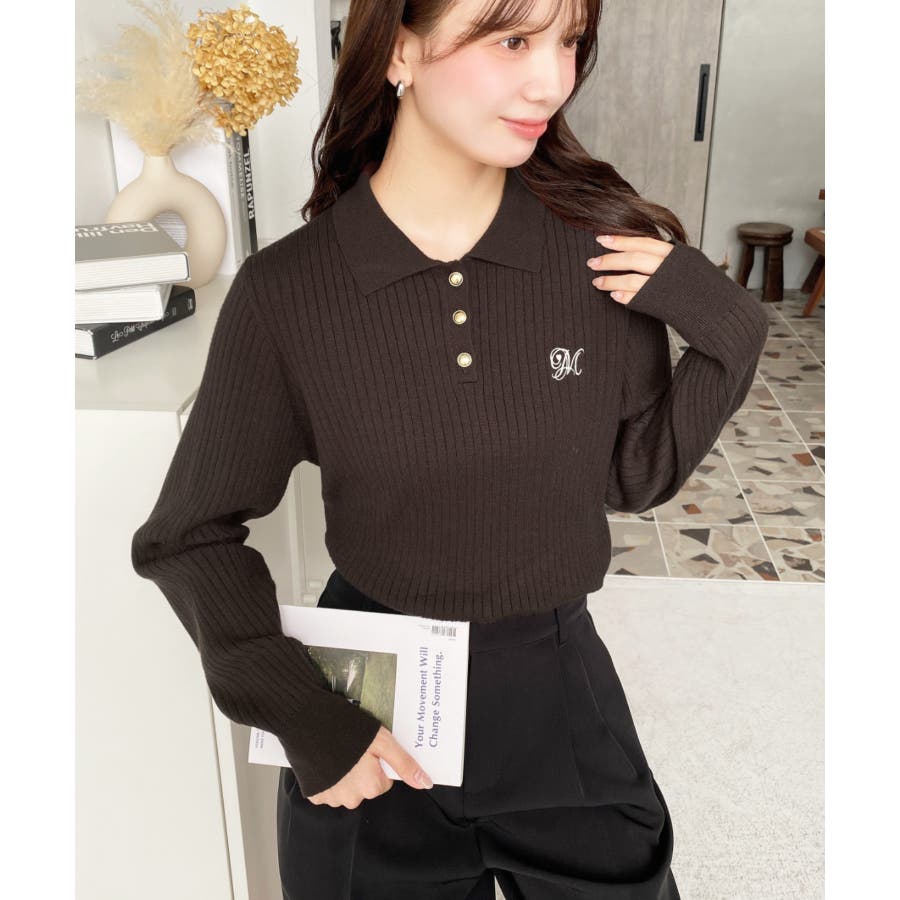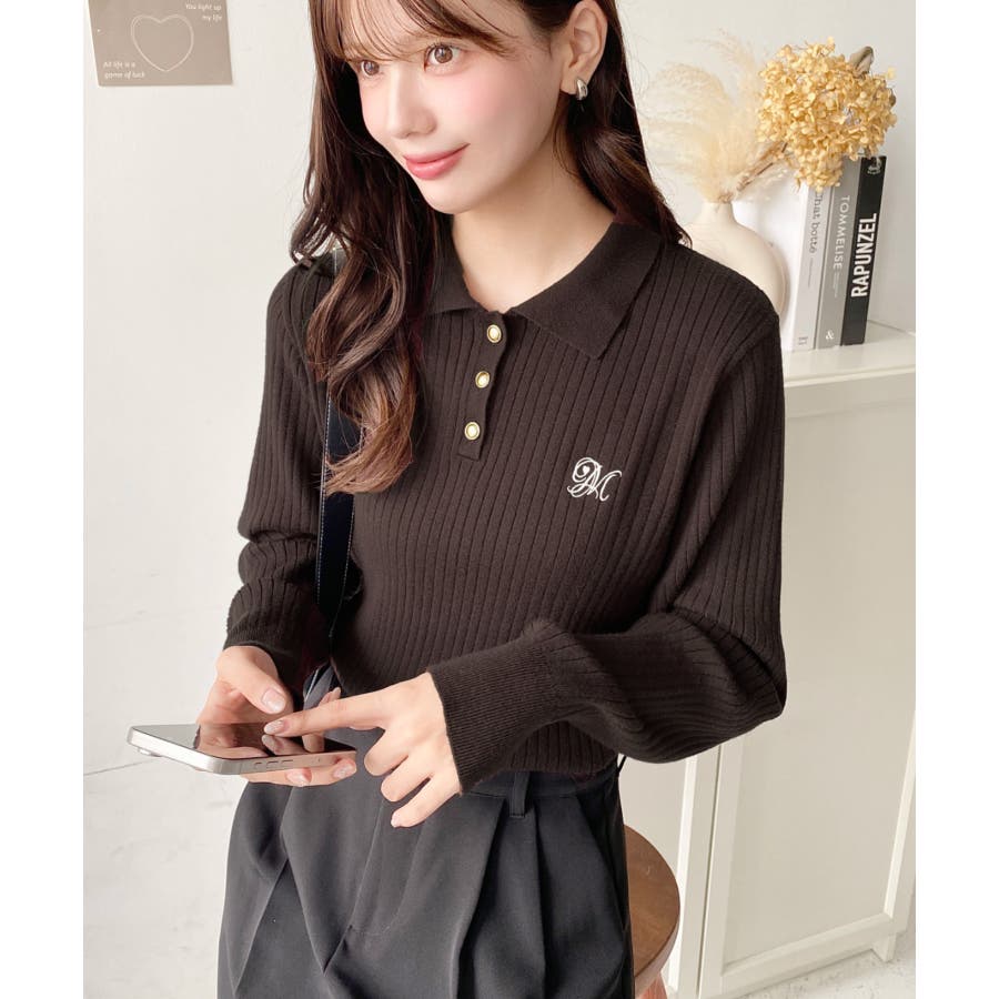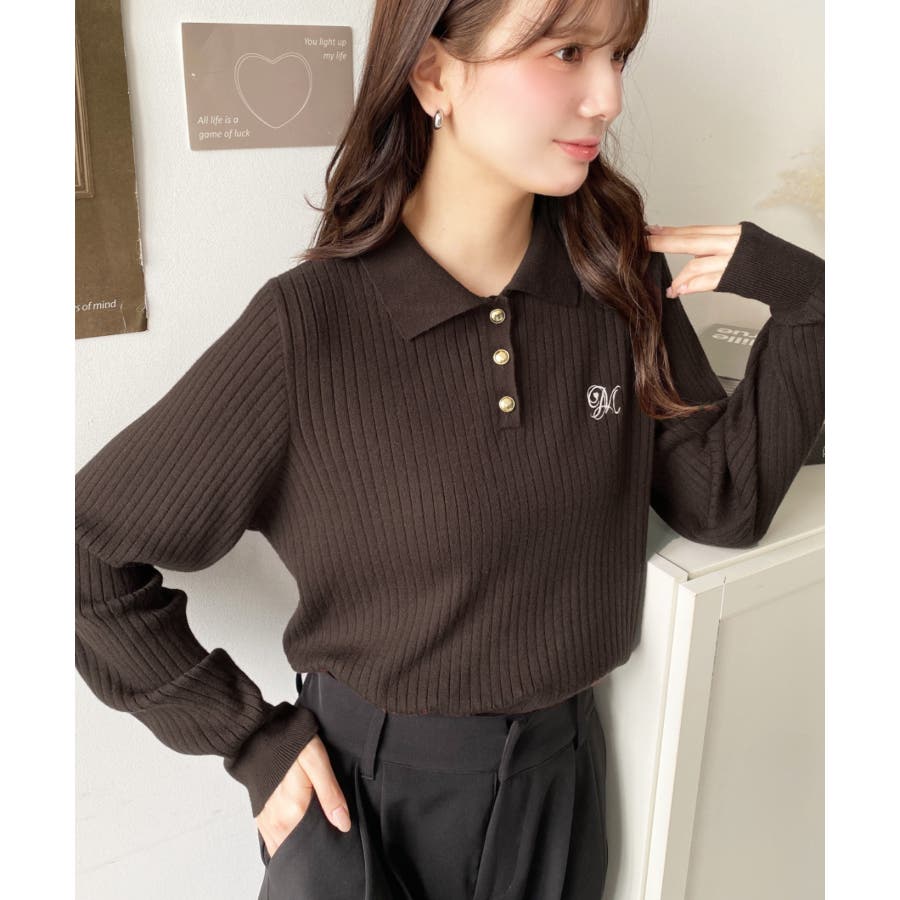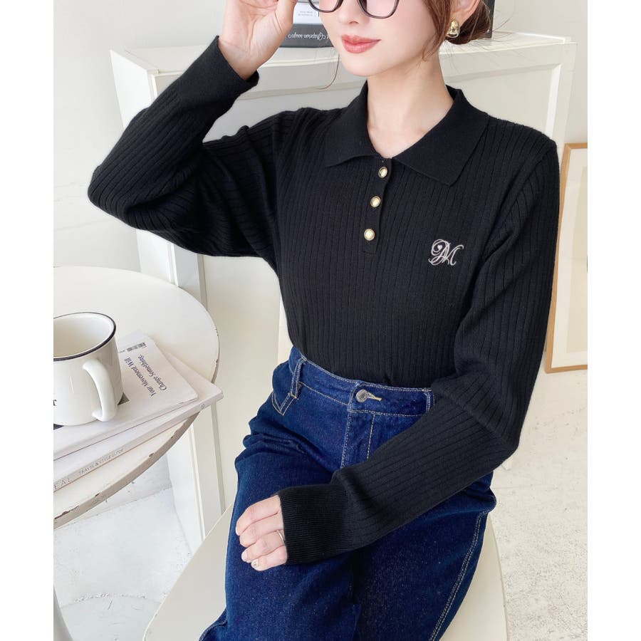 ・胸元にロゴ刺繍入りの襟付きポロデザインで、シンプルながらも目を引く華やかさをプラスした長袖リブニットです♪