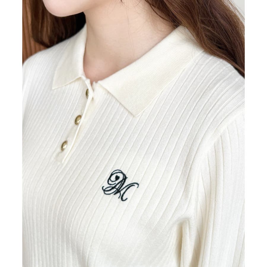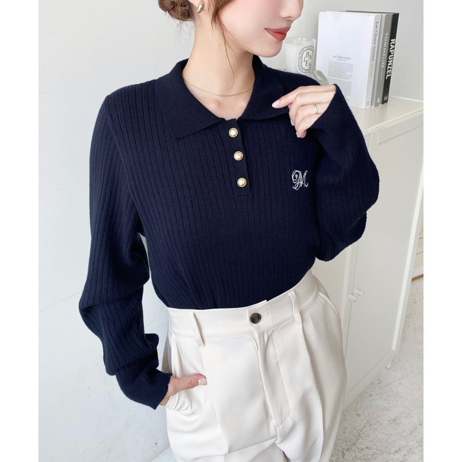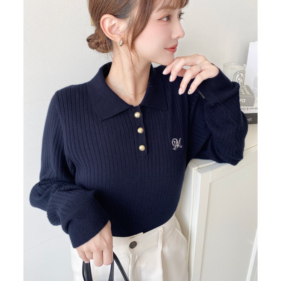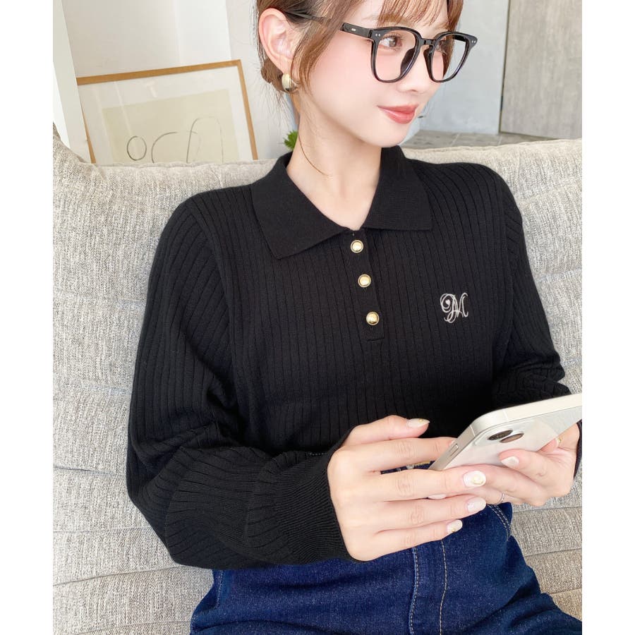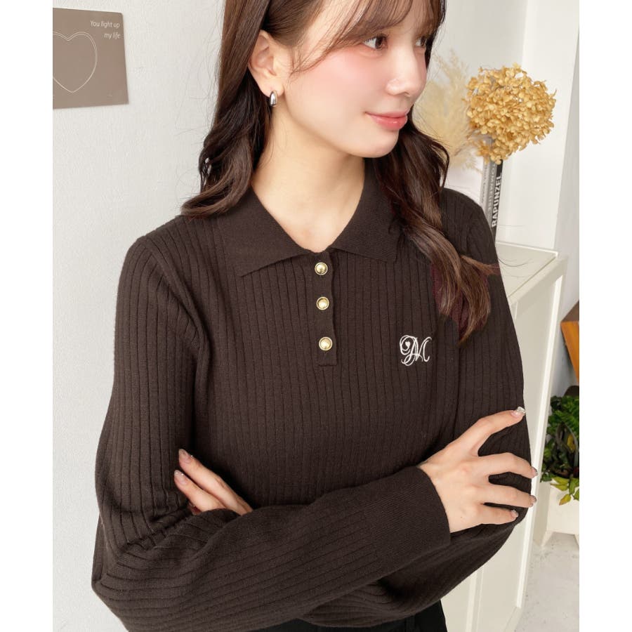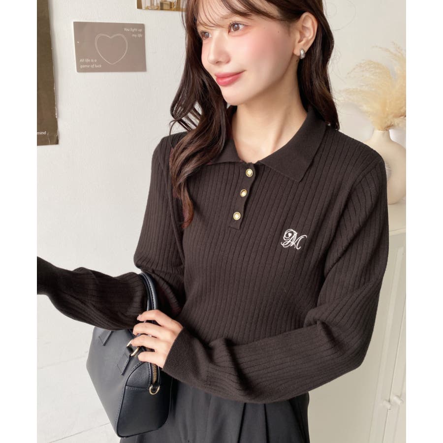 ・胸元にロゴ刺繍入りの襟付きポロデザインで、シンプルながらも目を引く華やかさをプラスした長袖リブニットです♪