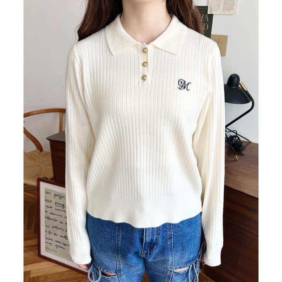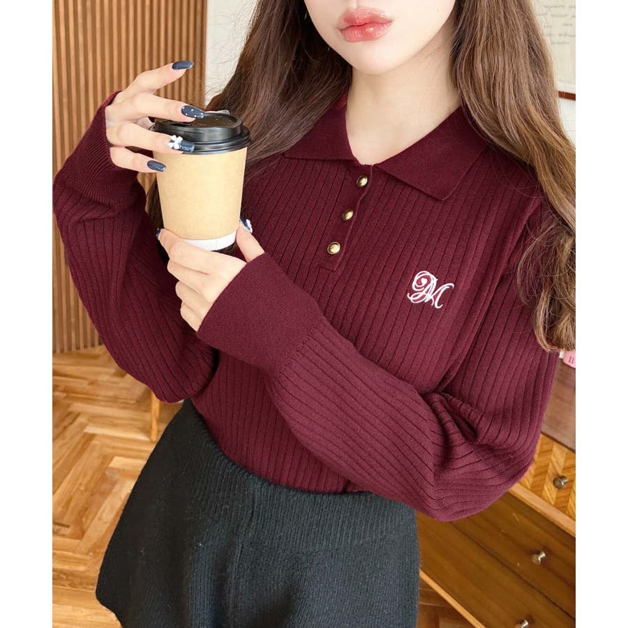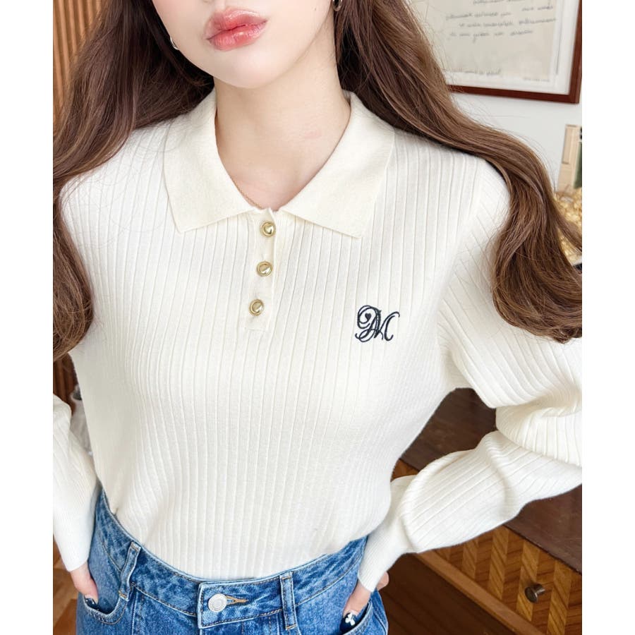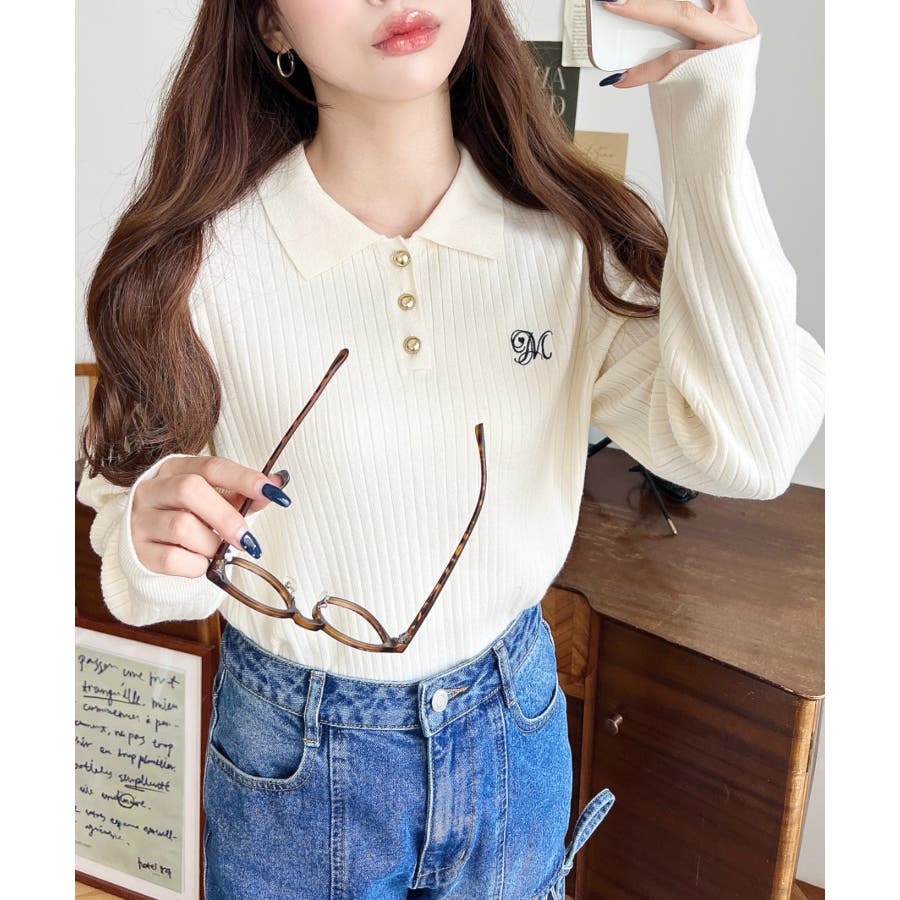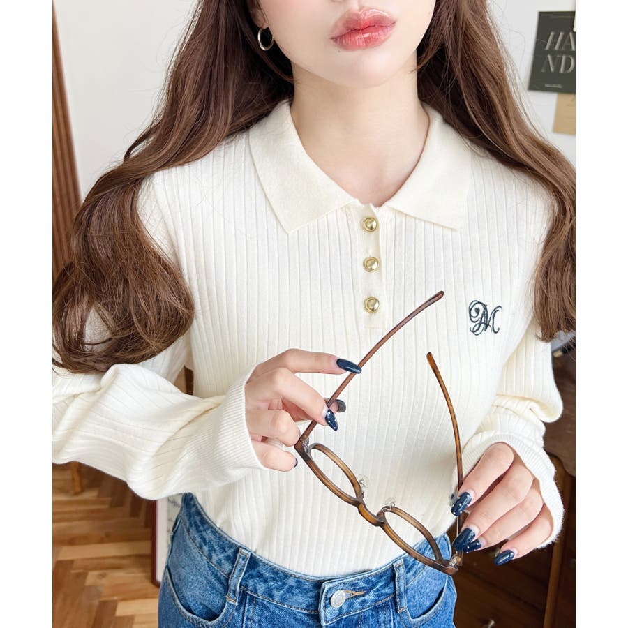 ・胸元にロゴ刺繍入りの襟付きポロデザインで、シンプルながらも目を引く華やかさをプラスした長袖リブニットです♪