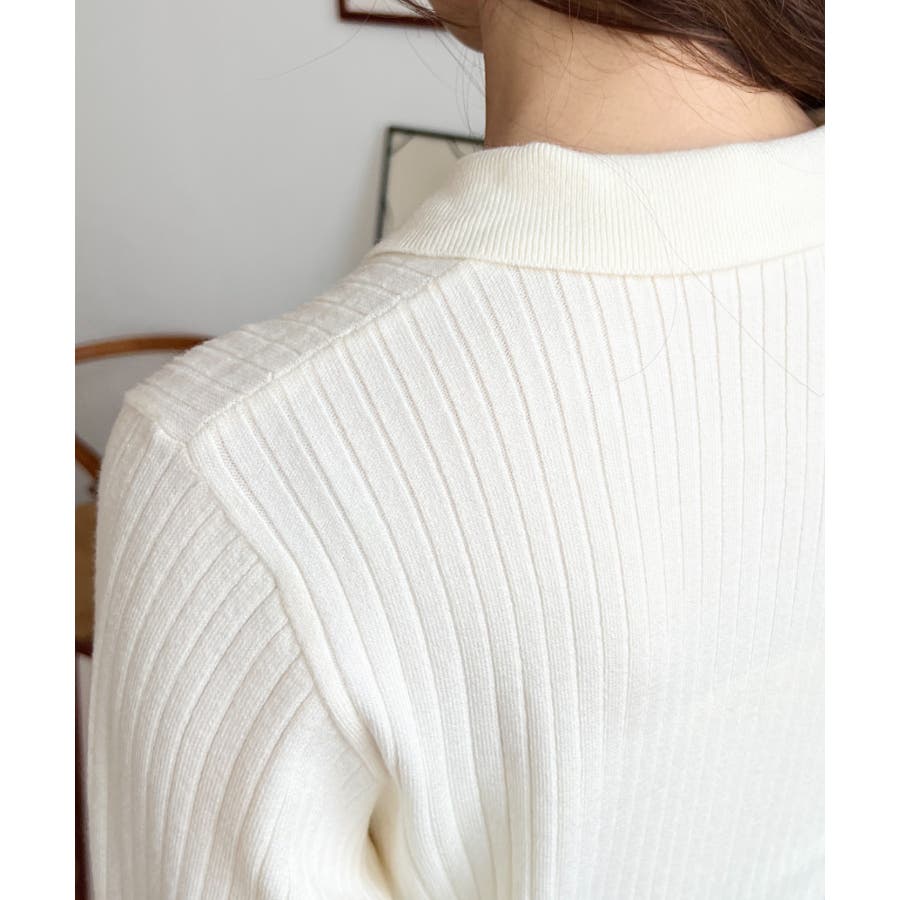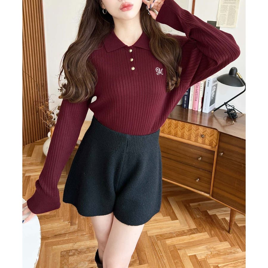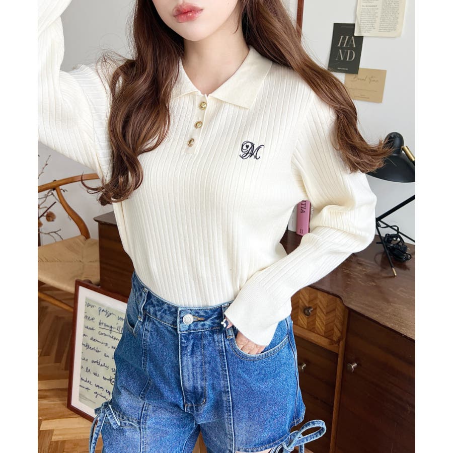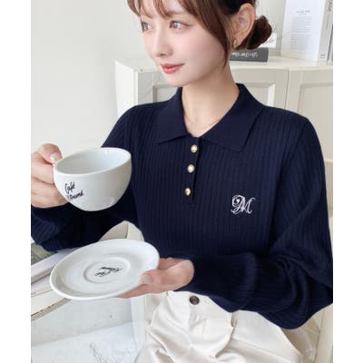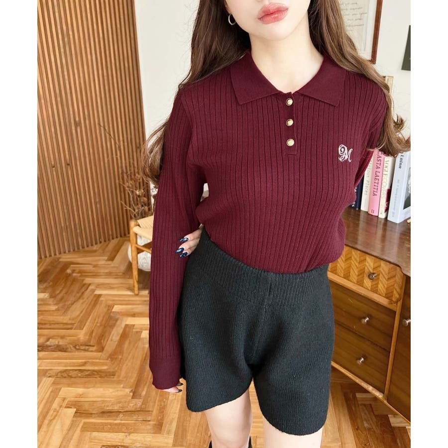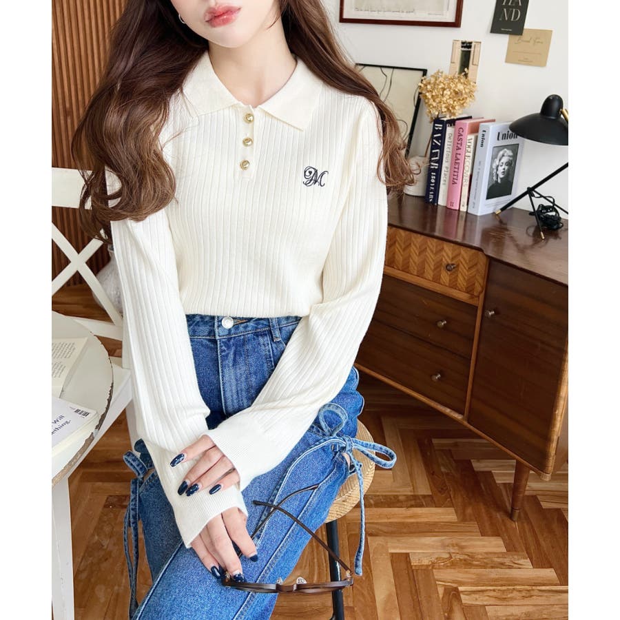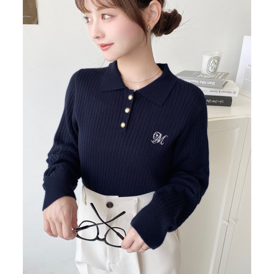 ・胸元にロゴ刺繍入りの襟付きポロデザインで、シンプルながらも目を引く華やかさをプラスした長袖リブニットです♪