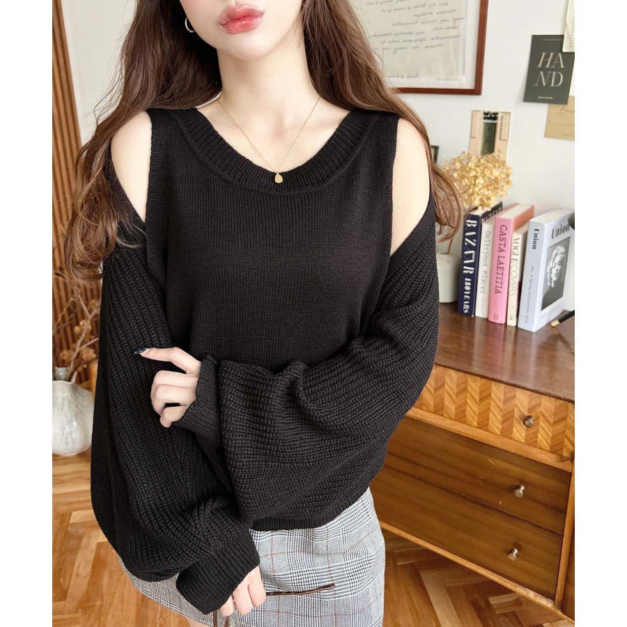 【さりげない肌見せで大人っぽく華やぐ ショルダースリットニットプルオーバー】