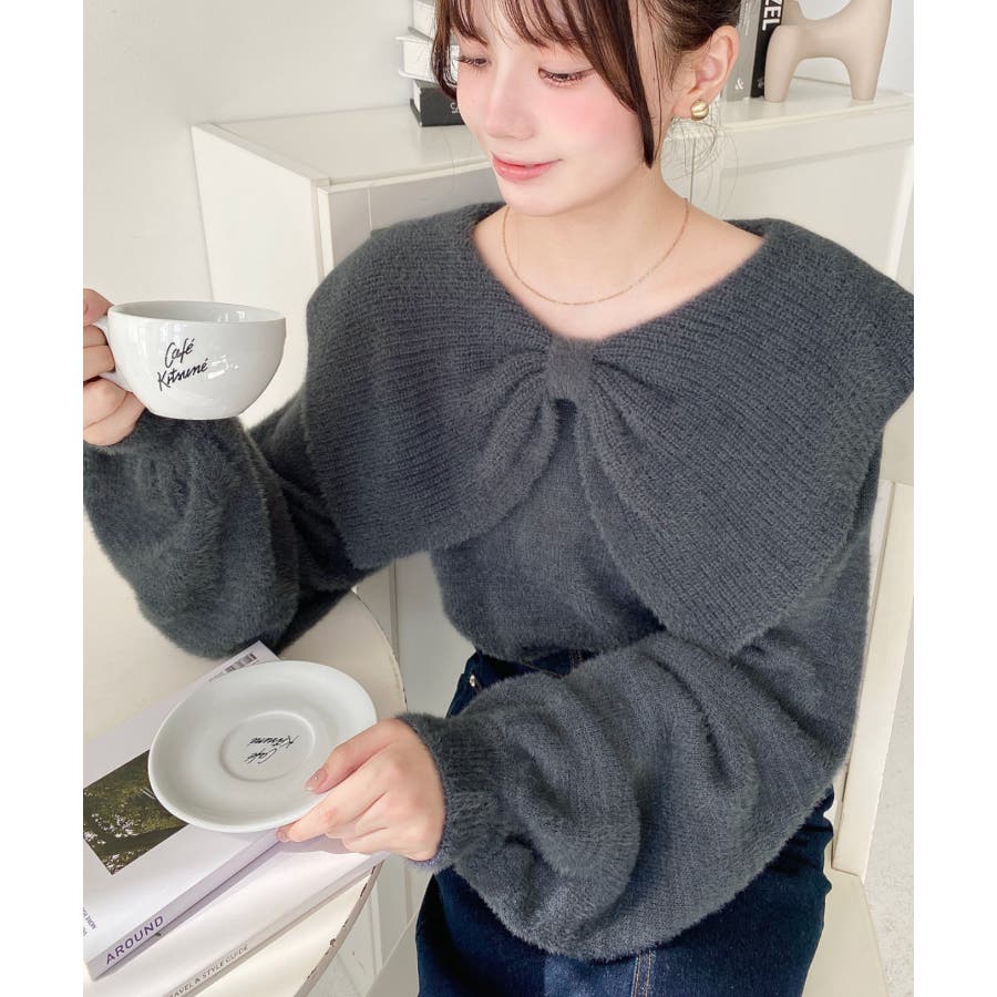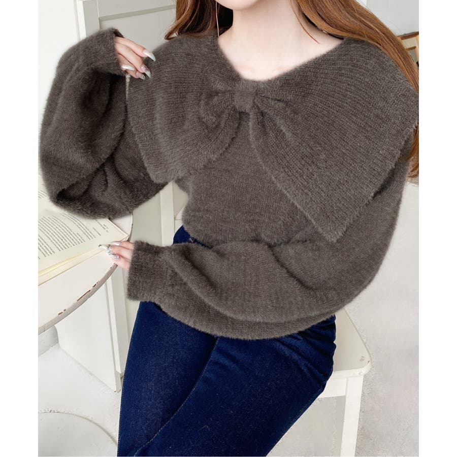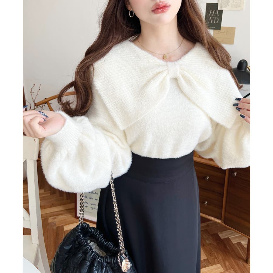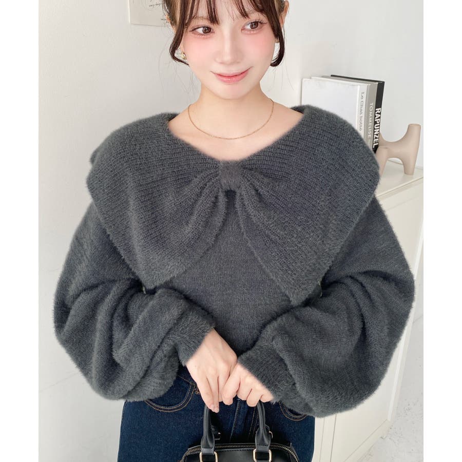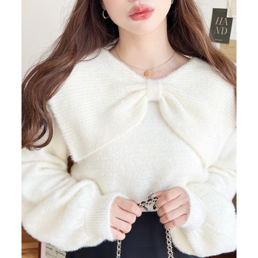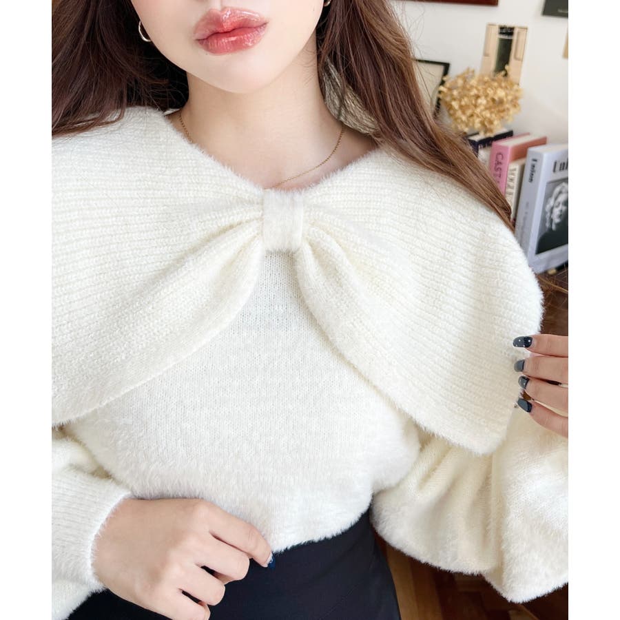 ・ふんわり軽やかなシャギーニットにケープリボンをあしらい、1枚で華やかさと上品さを演出。