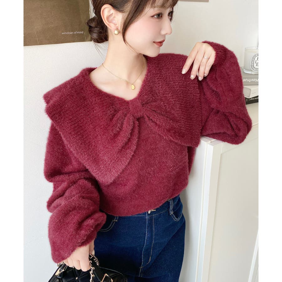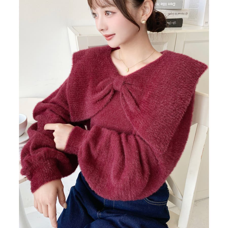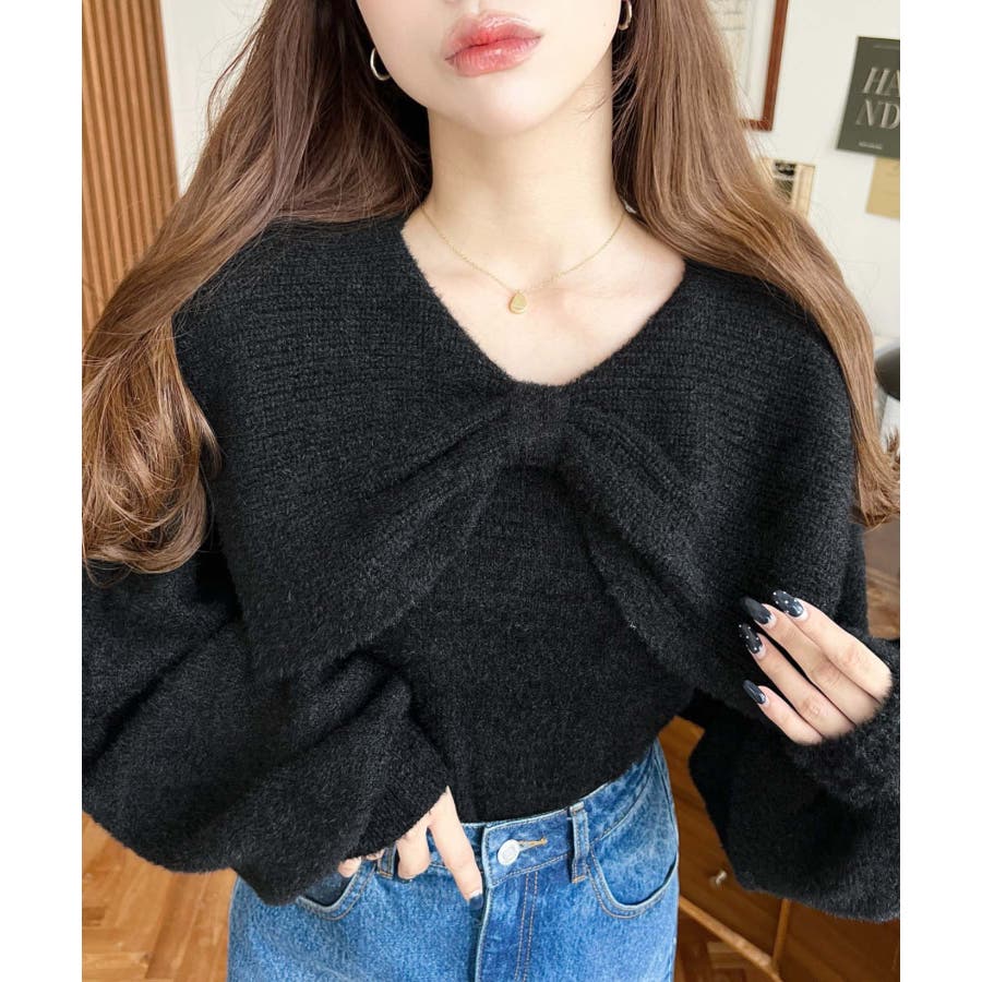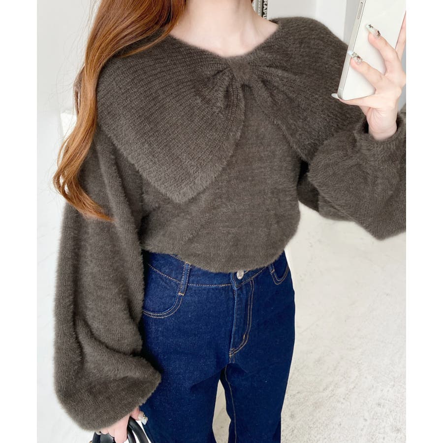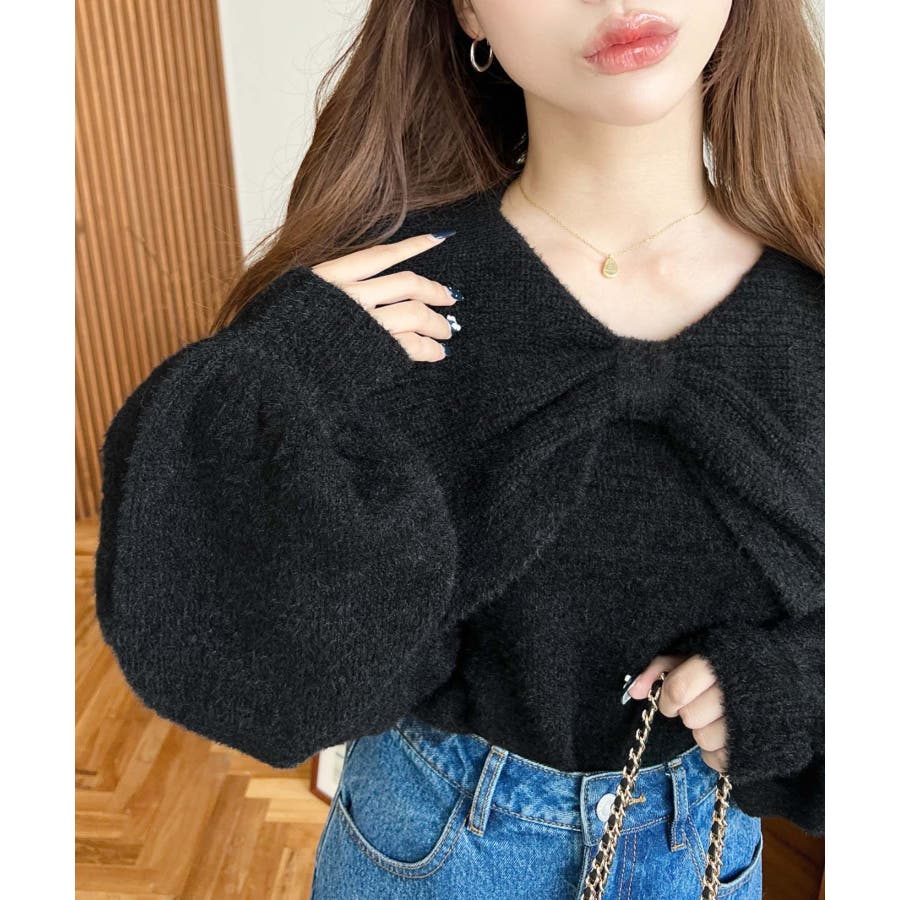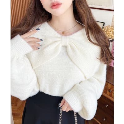 ・ふんわり軽やかなシャギーニットにケープリボンをあしらい、1枚で華やかさと上品さを演出。