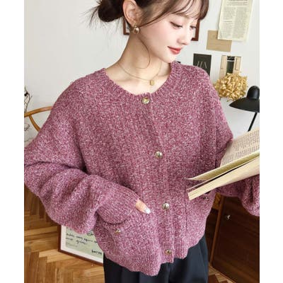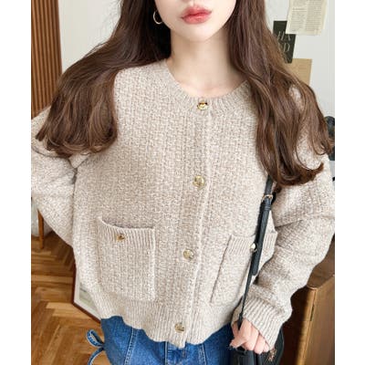 ・上品なツイードライク編みときらりと輝く金ボタンが、華やかさを添えるニットカーディガン◎