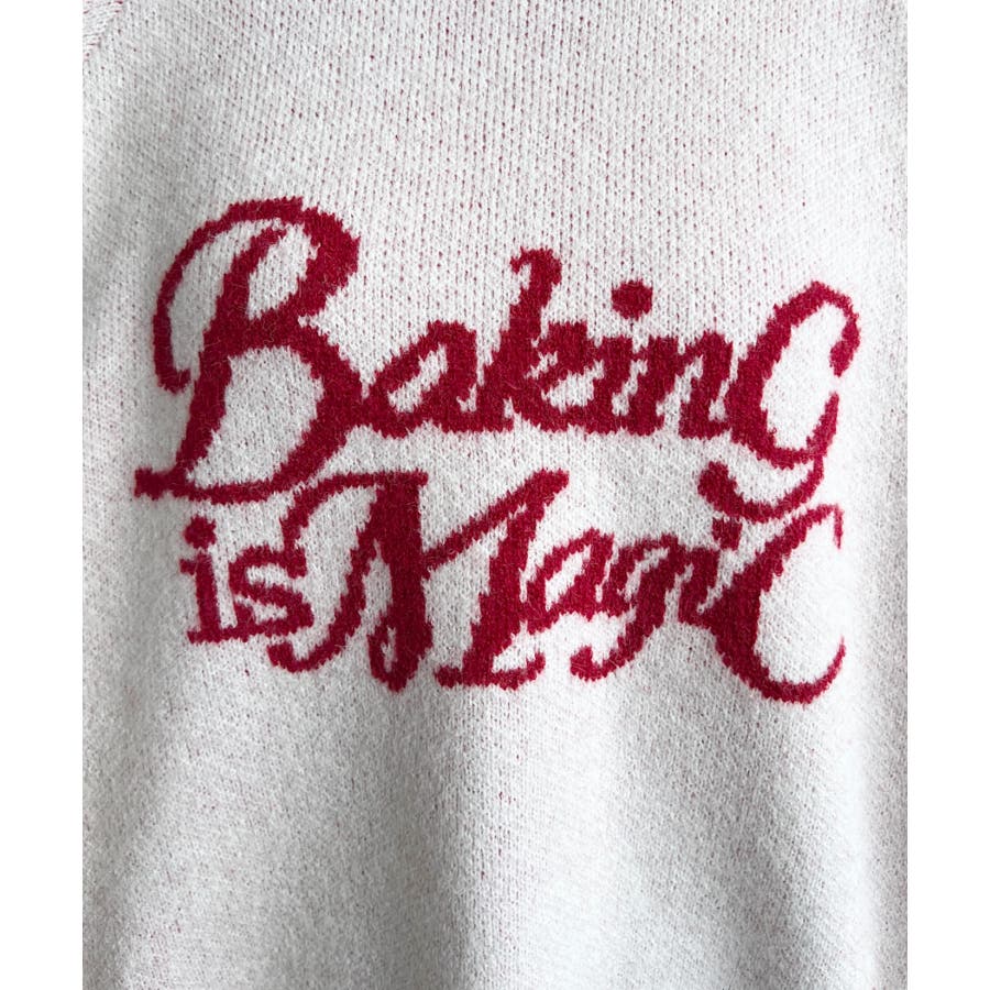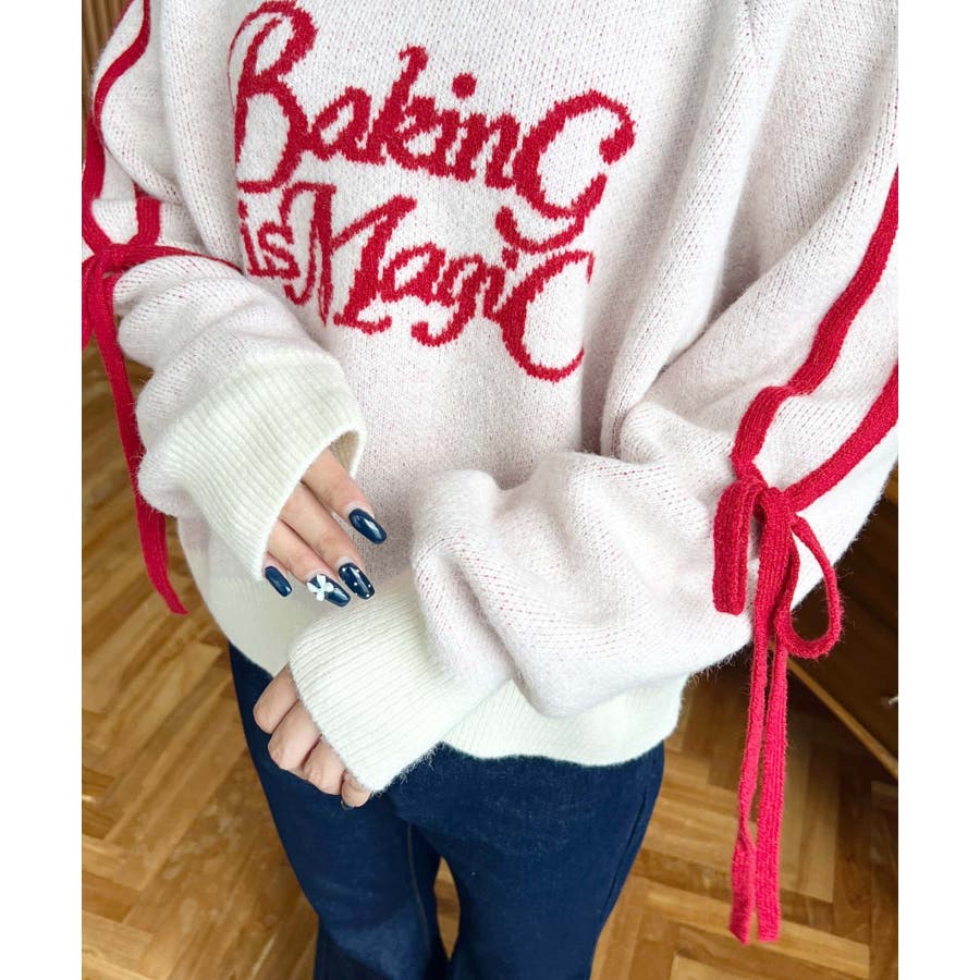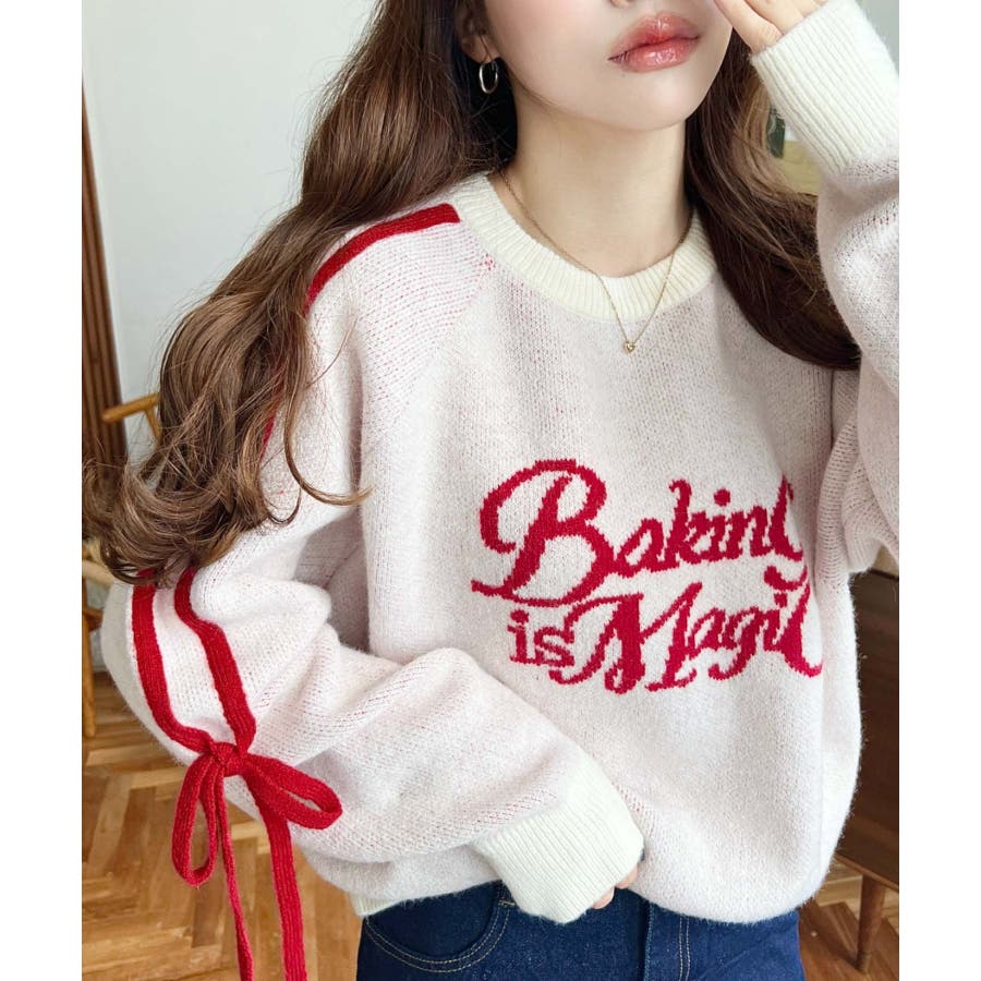 ・袖のダブルジャガードラインとリボンがポイントのロゴジャガードニットプルオーバー。