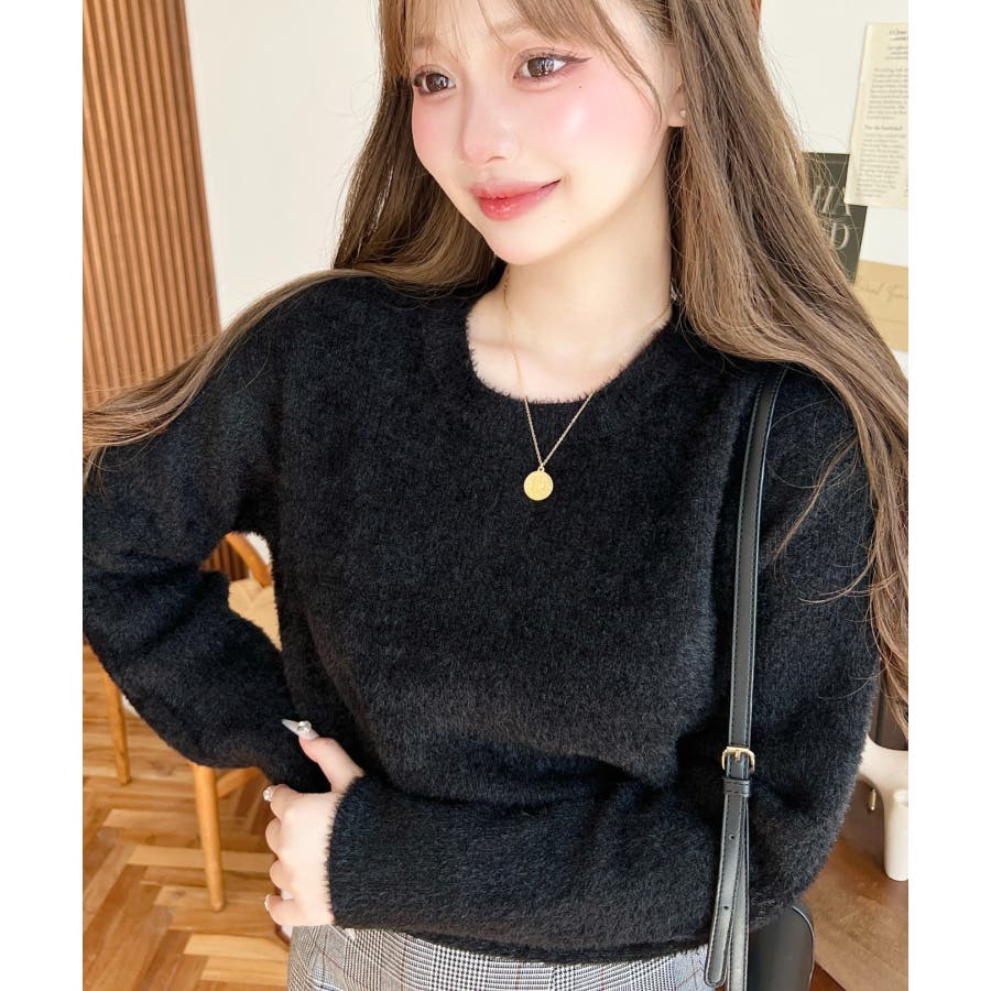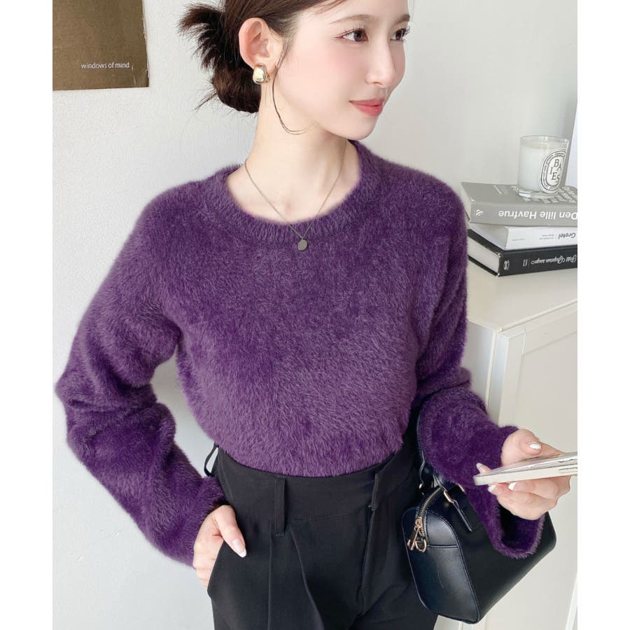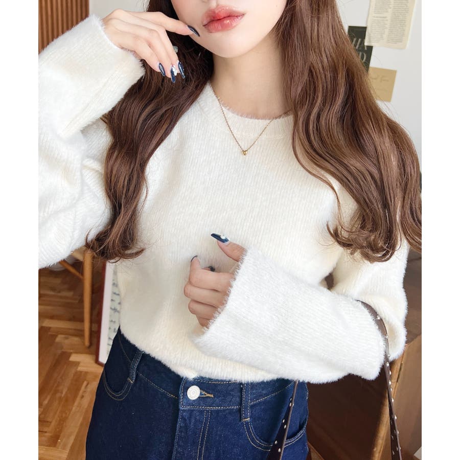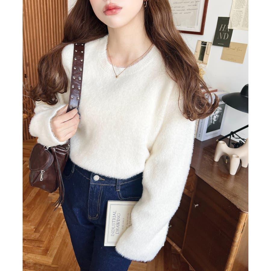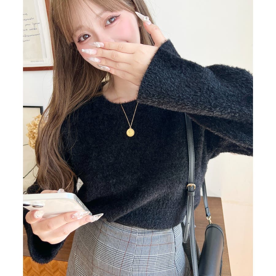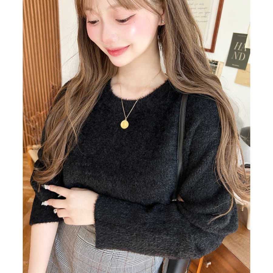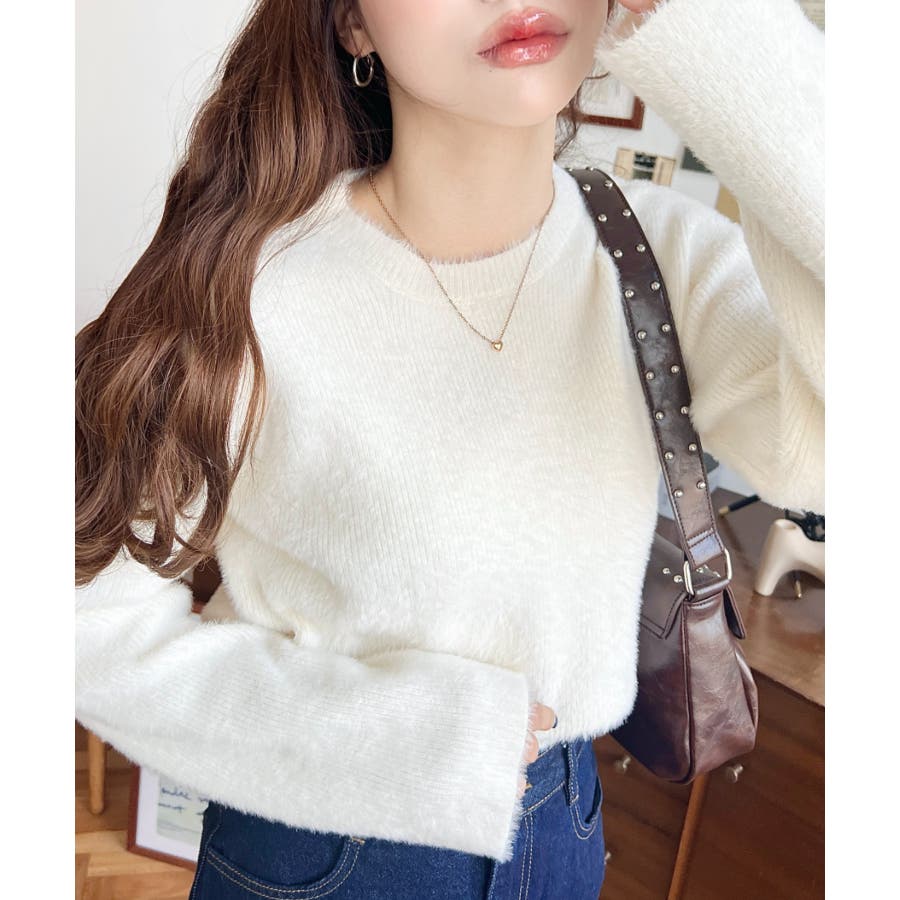 ・コモコのシャギーが柔らかく包み込むような着心地。クールネックとショート丈の組み合わせで軽やかに見え、ラフに着たときも自然に形がキープされます◎