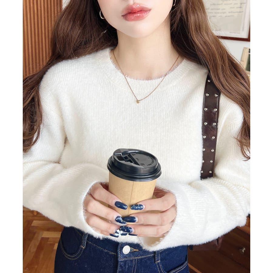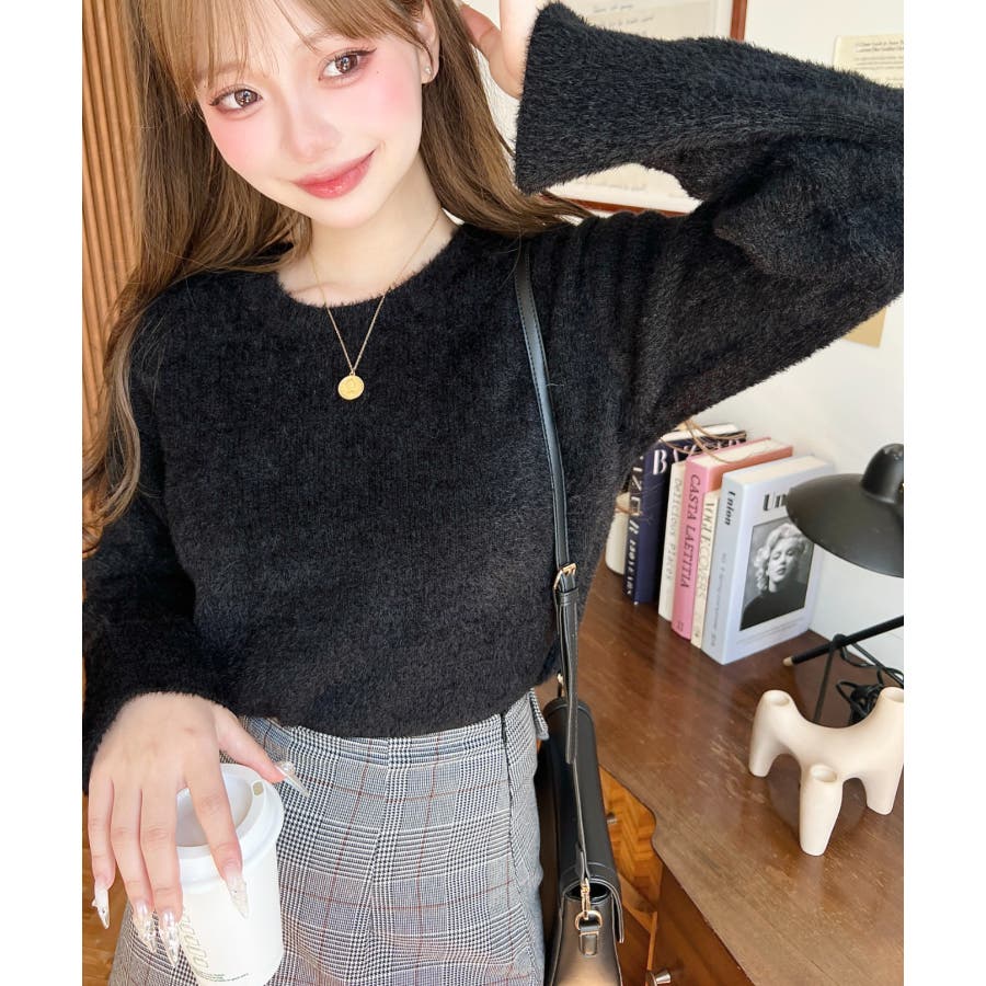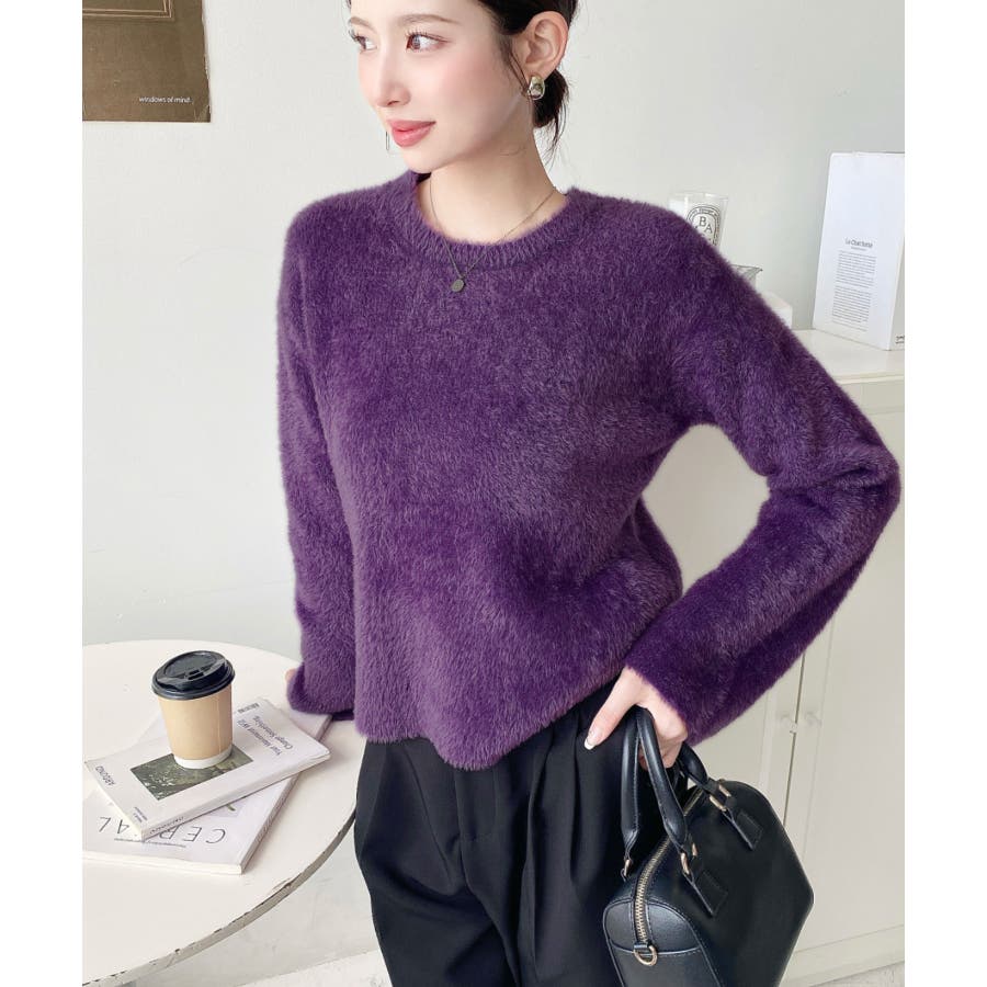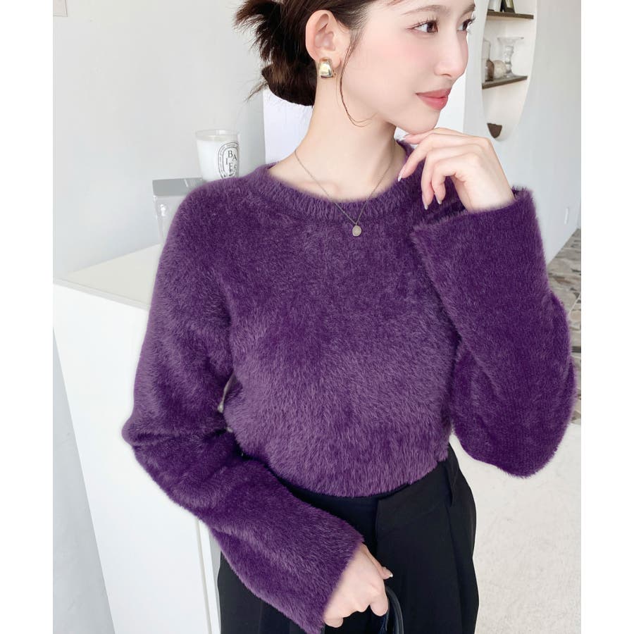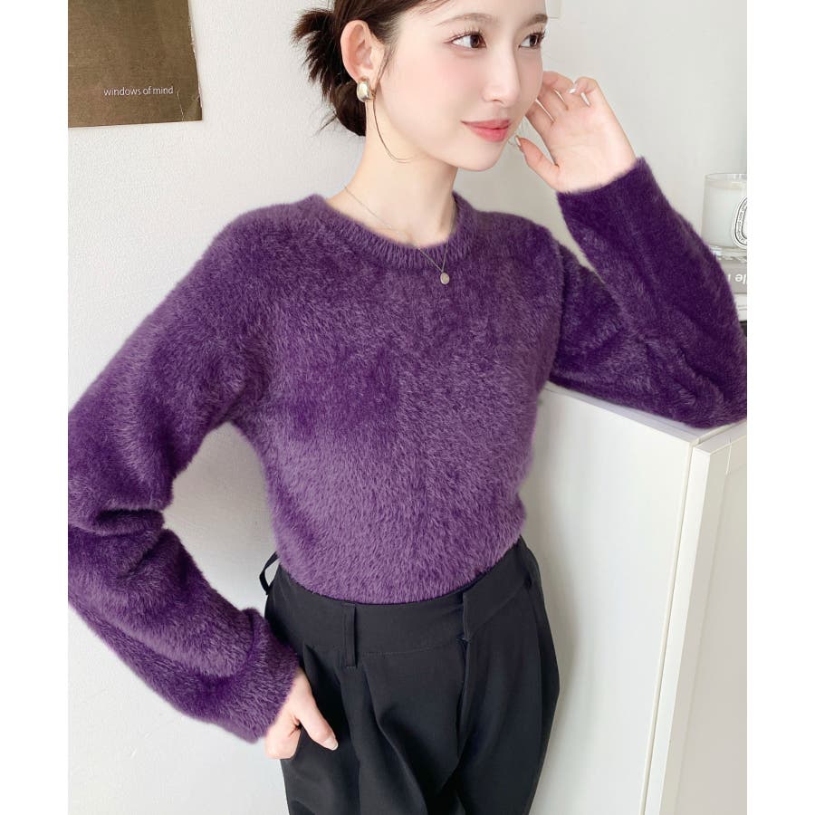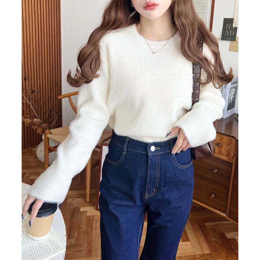 ・コモコのシャギーが柔らかく包み込むような着心地。クールネックとショート丈の組み合わせで軽やかに見え、ラフに着たときも自然に形がキープされます◎
