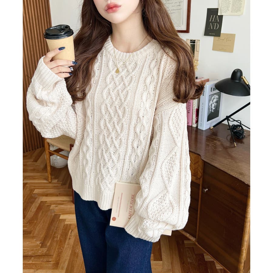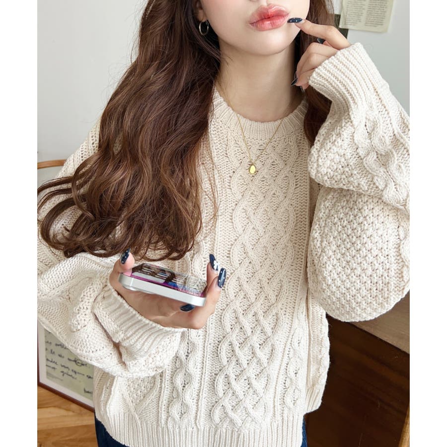 袖や身頃のケーブル編みが立体的で、1枚でもさりげなく華やかに見えるのが嬉しいポイント。