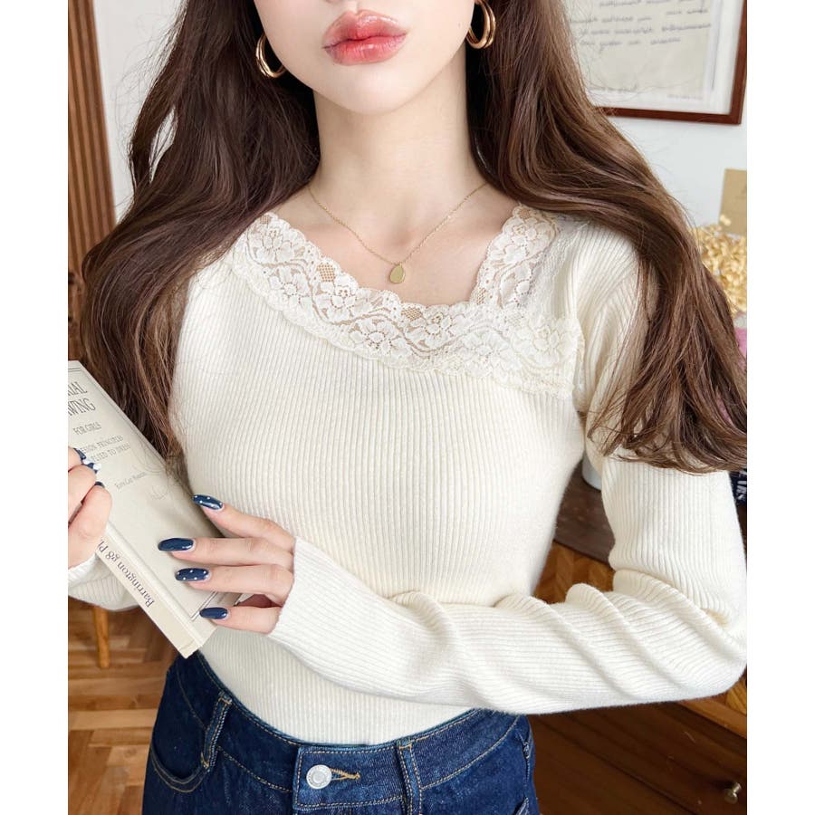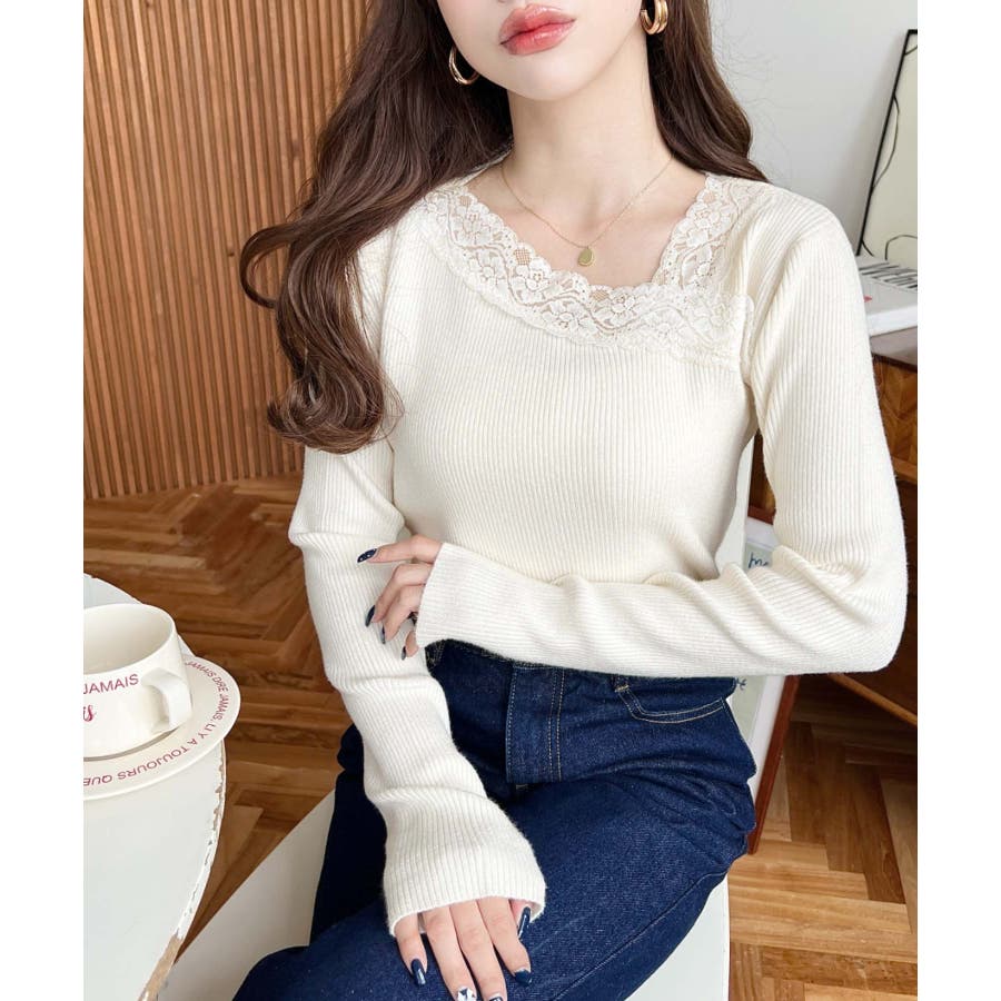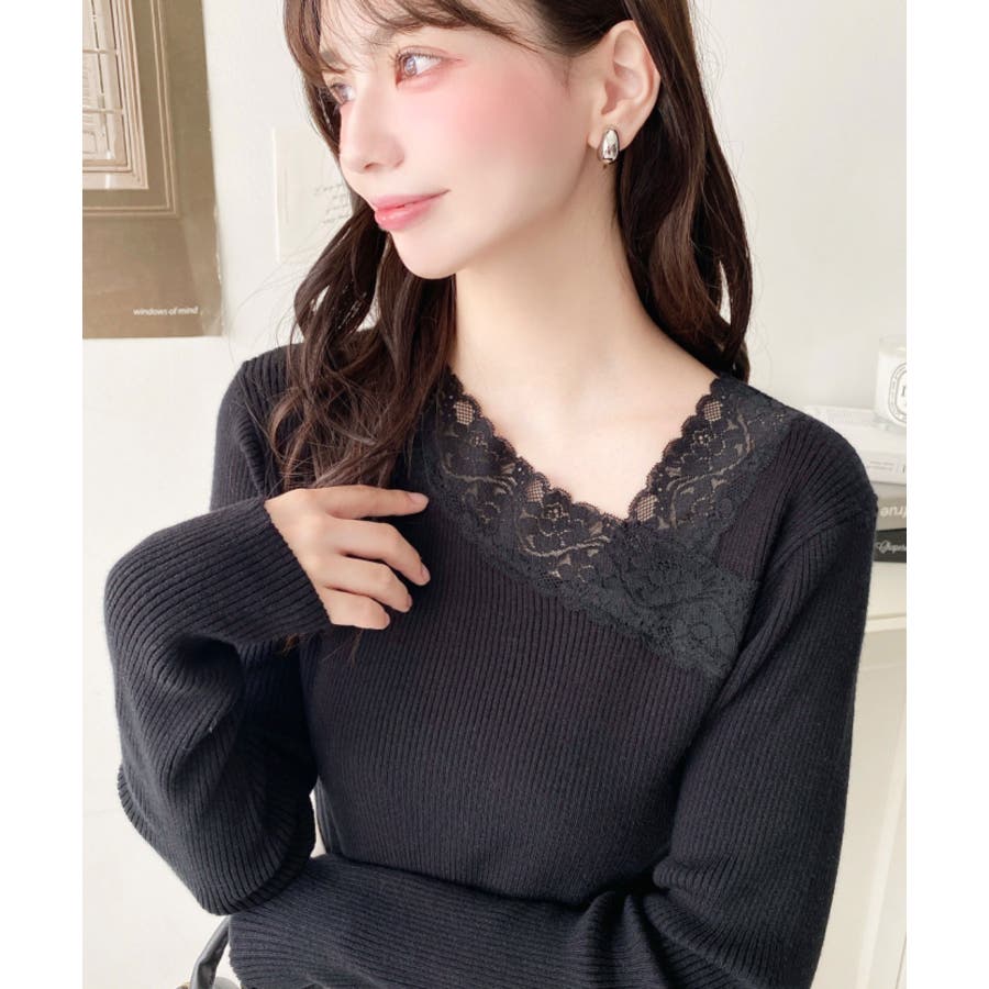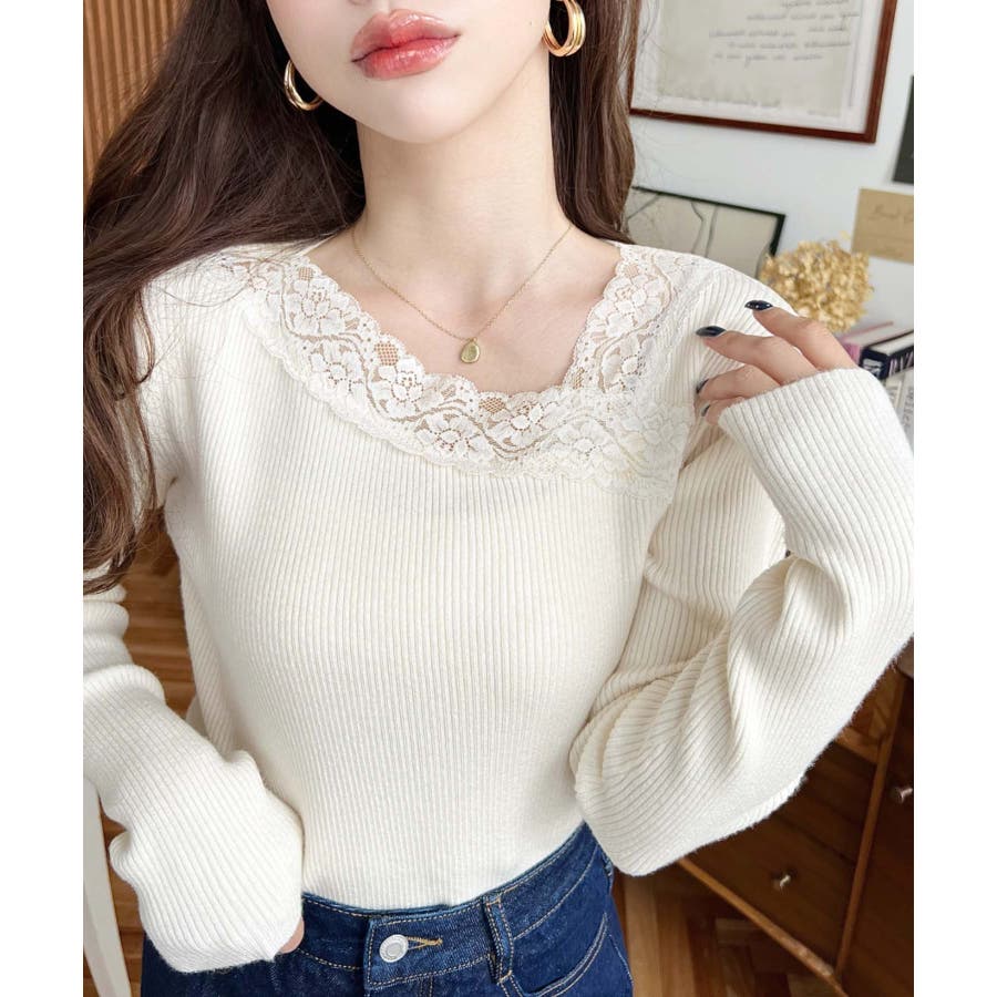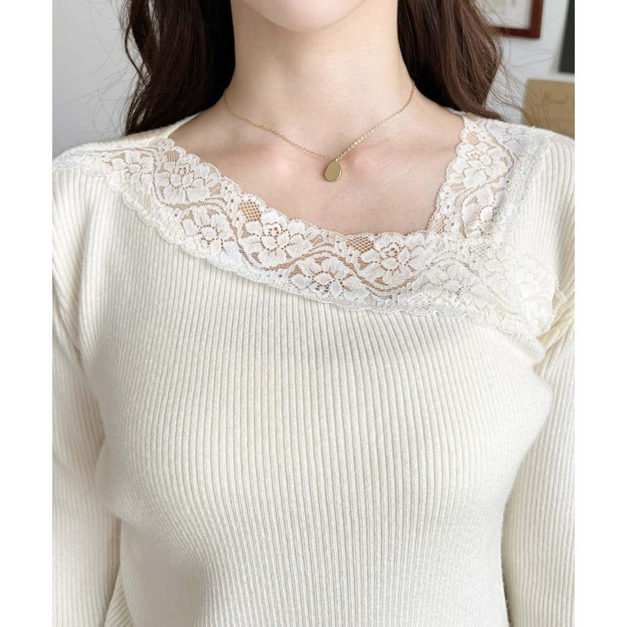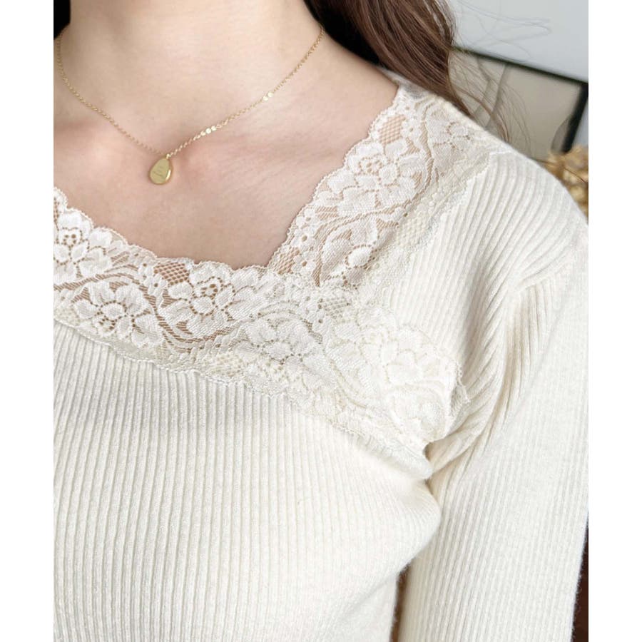 ・デコルテ部分にあしらわれた繊細なレースが、女性らしい上品さをプラスしてくれるリブニットです♪