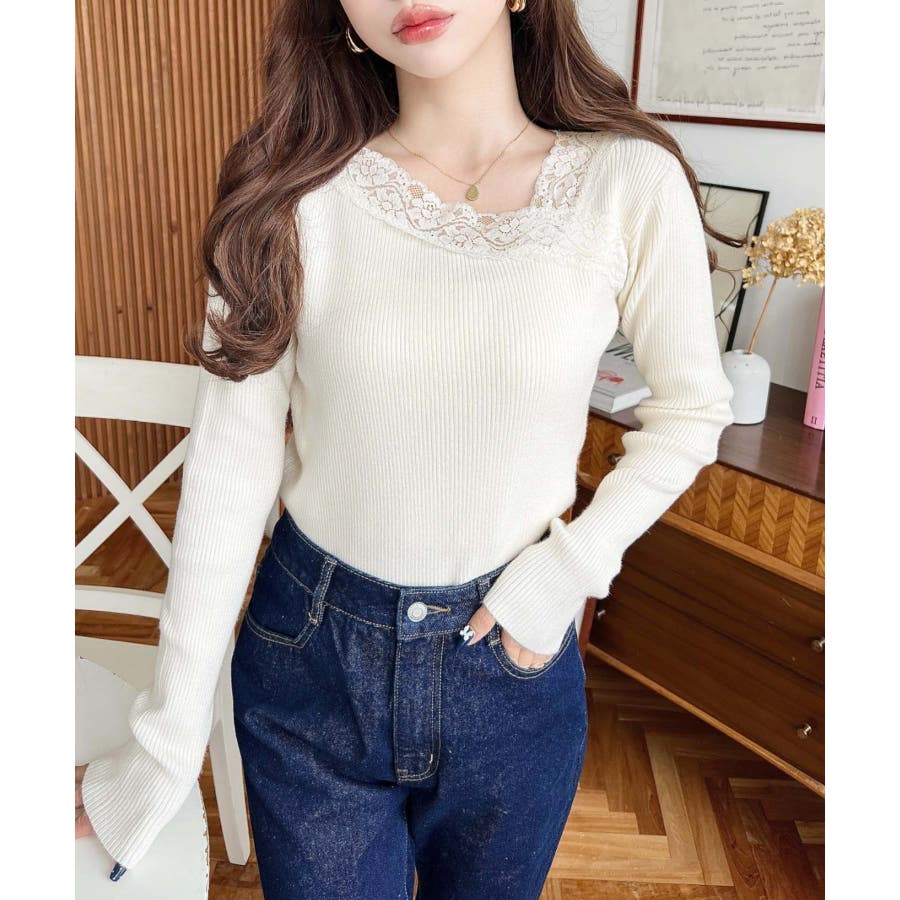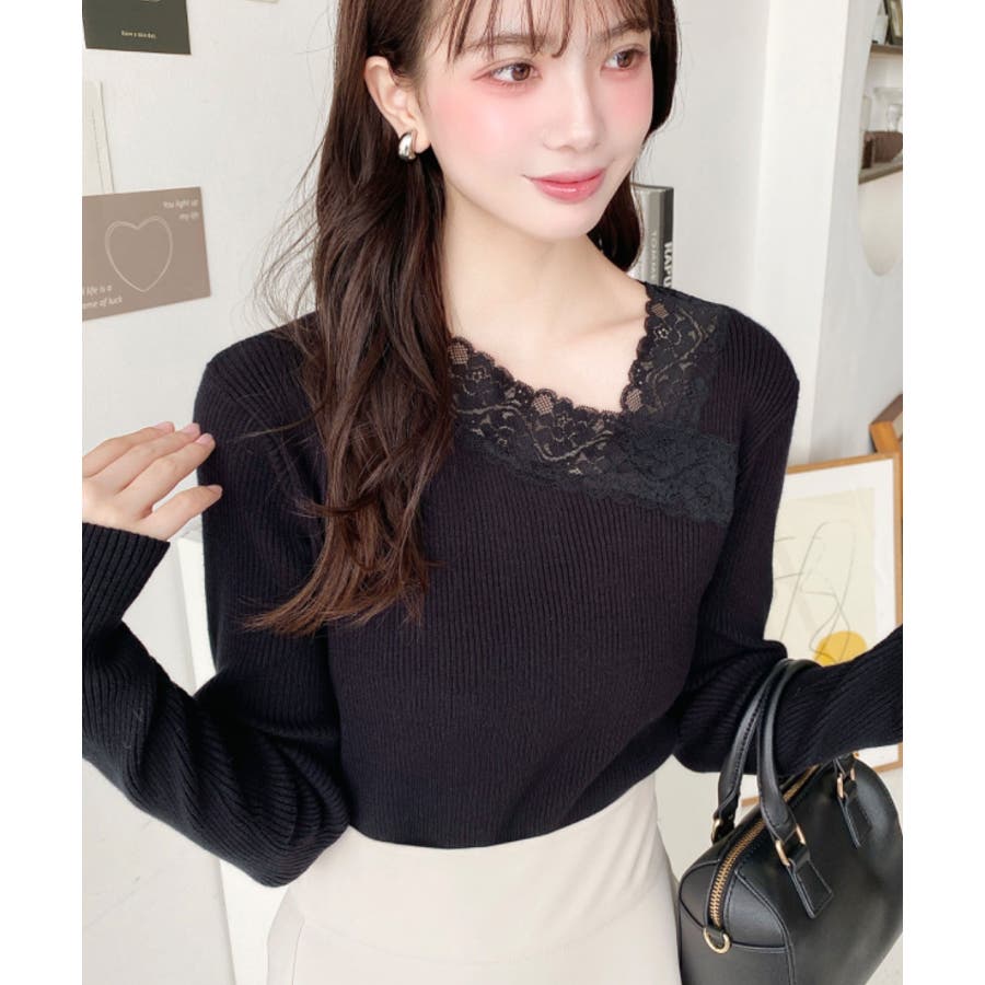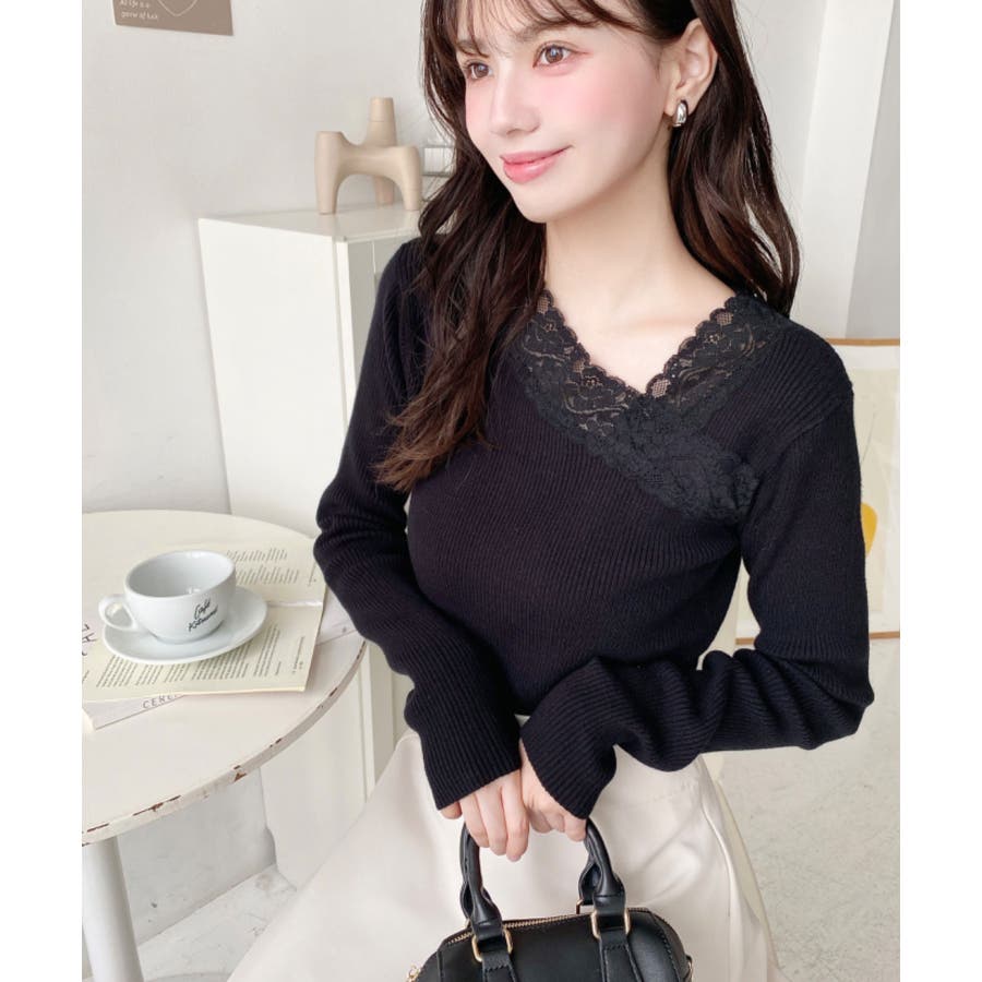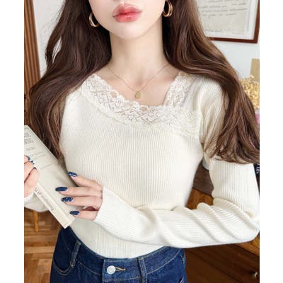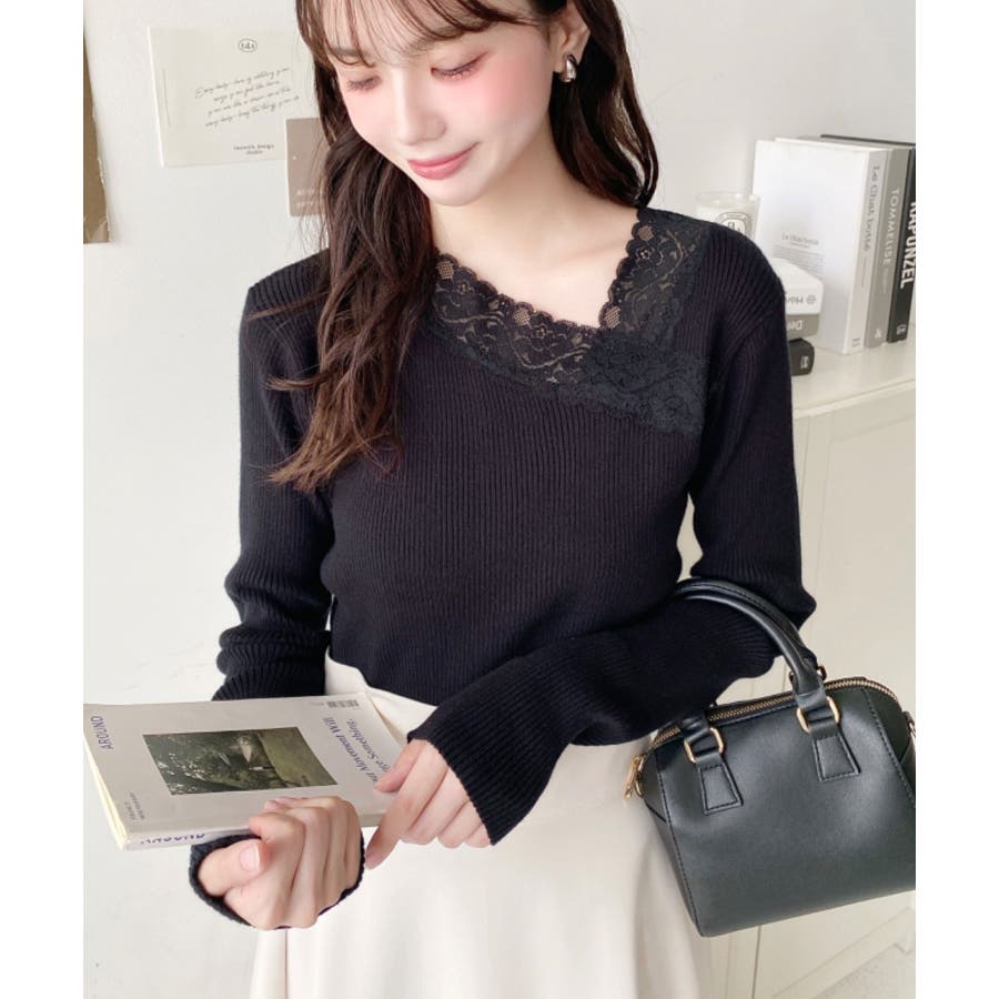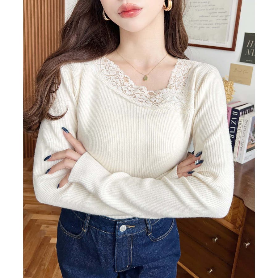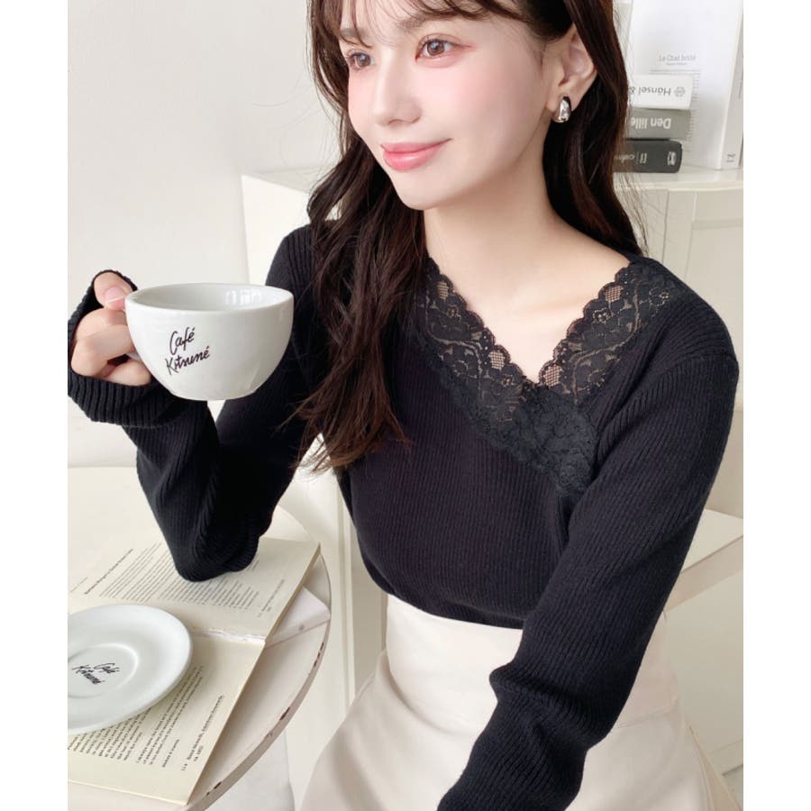・デコルテ部分にあしらわれた繊細なレースが、女性らしい上品さをプラスしてくれるリブニットです♪