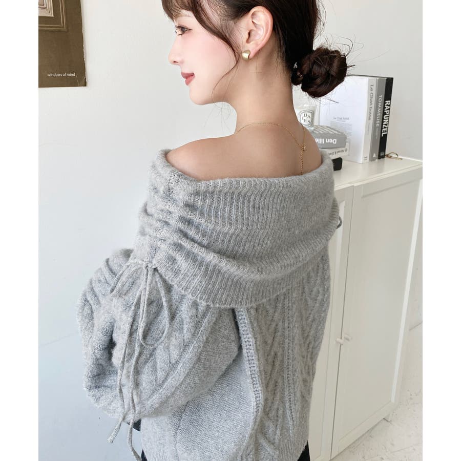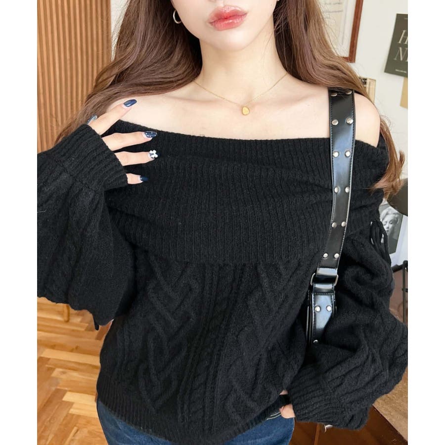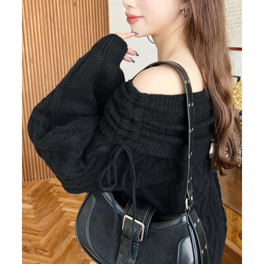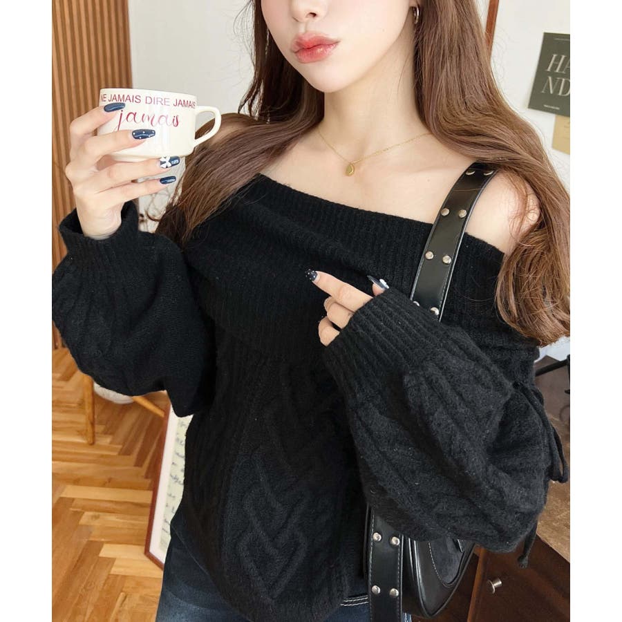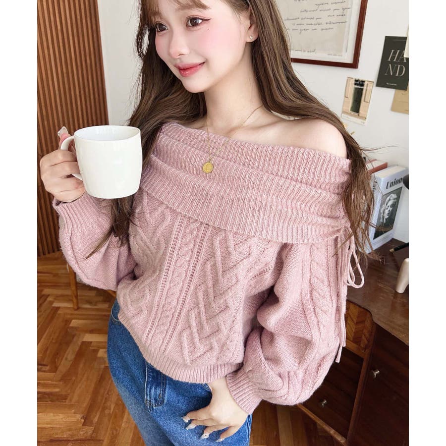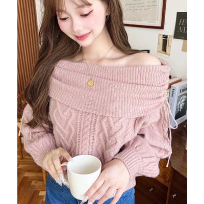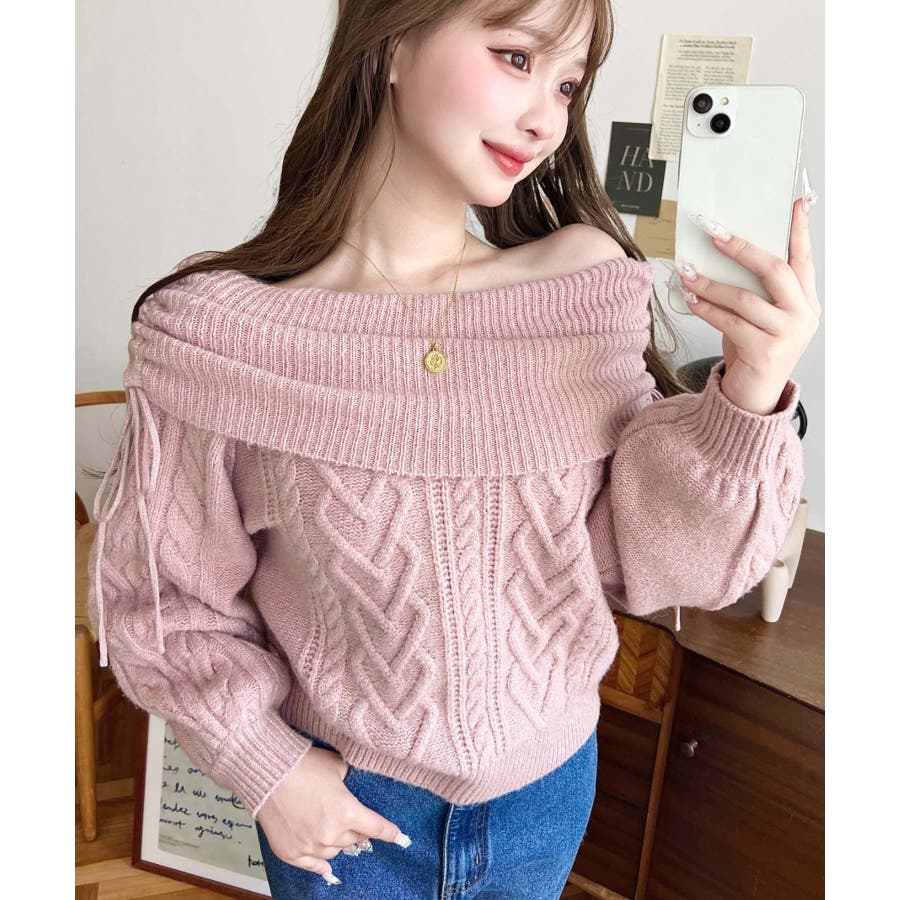 ハートケーブルドロストリボンオフショルニット長袖プルオーバー