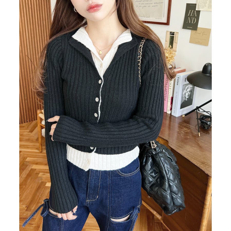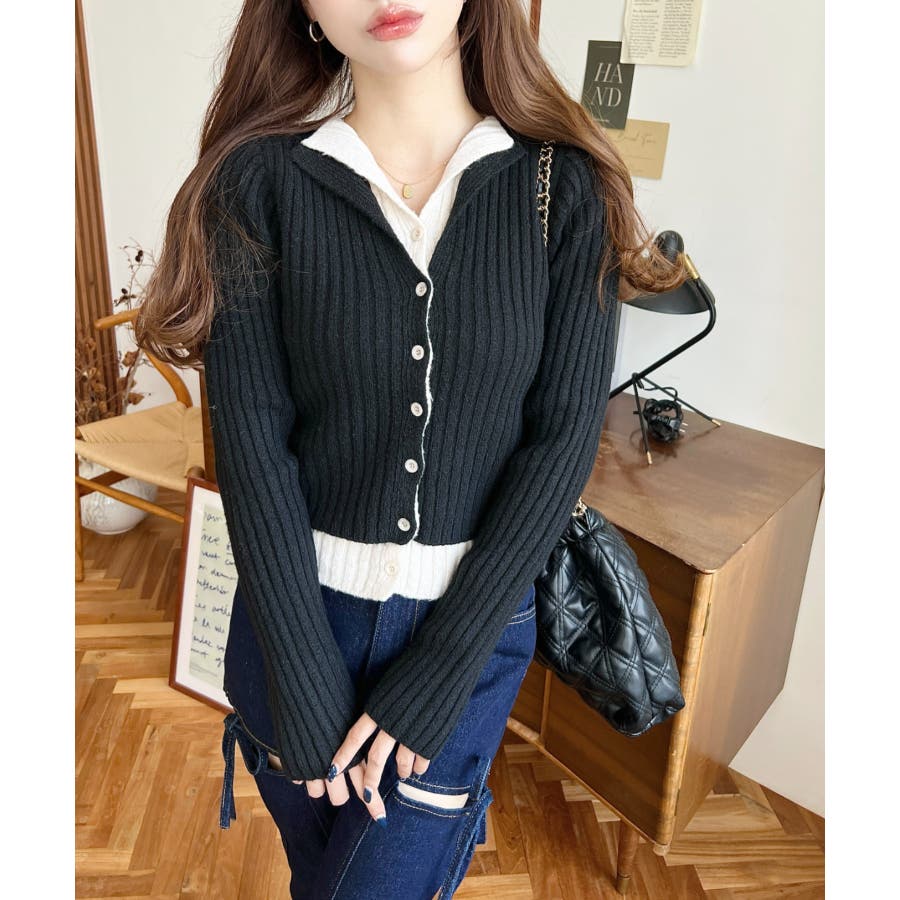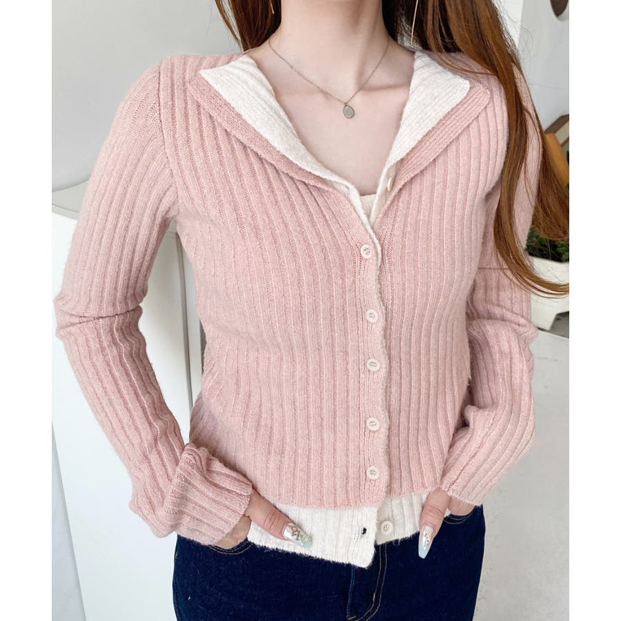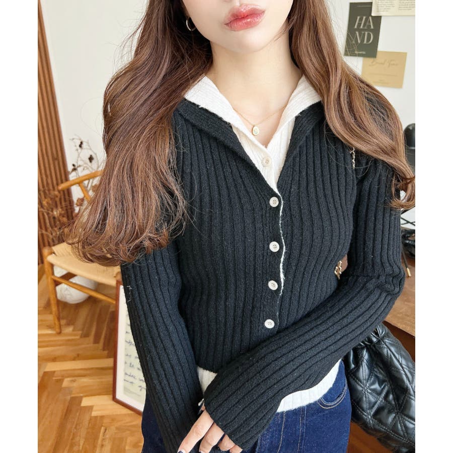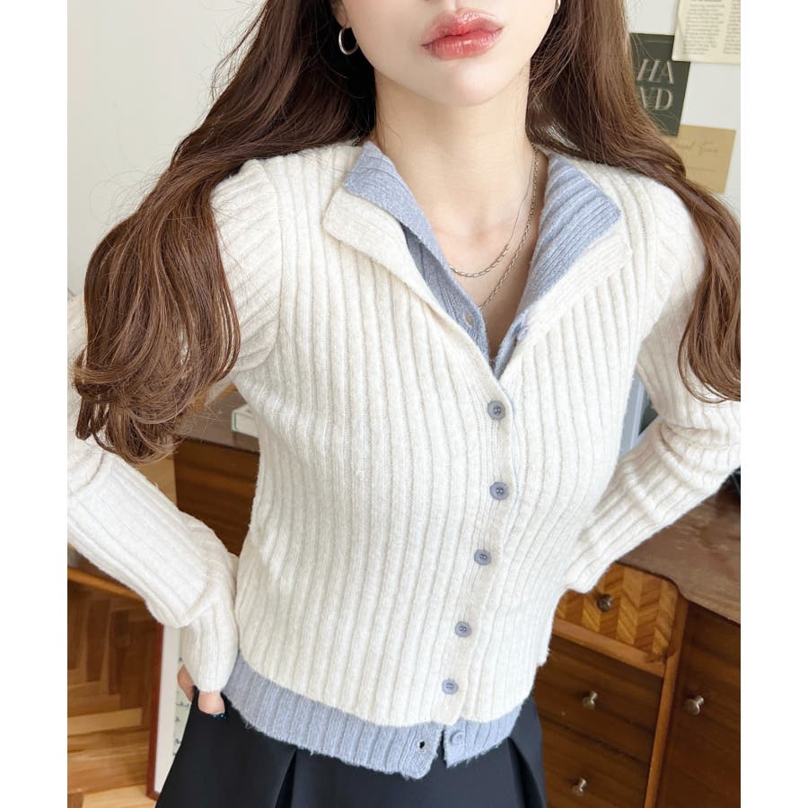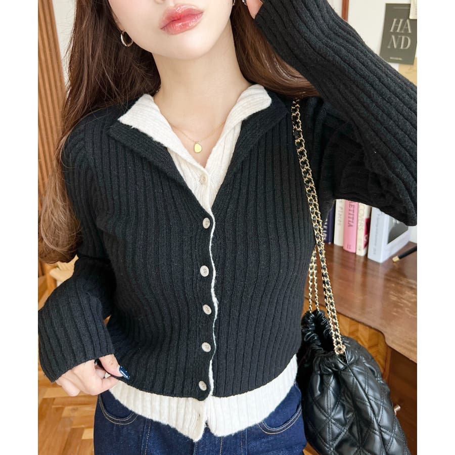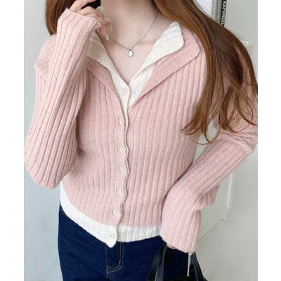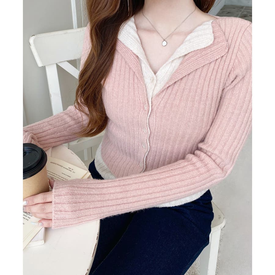 レイヤードカーディガン風リブニットトップス