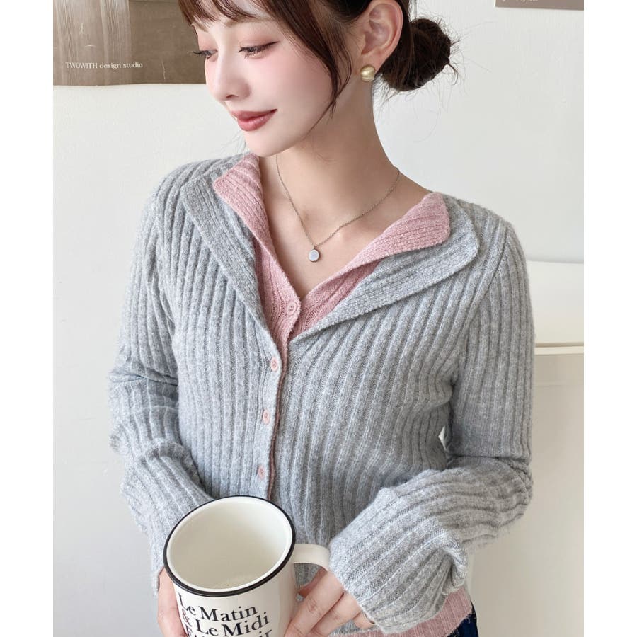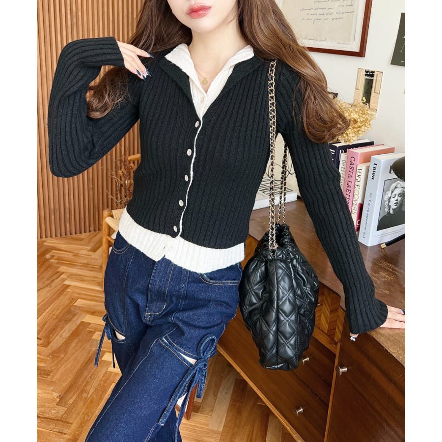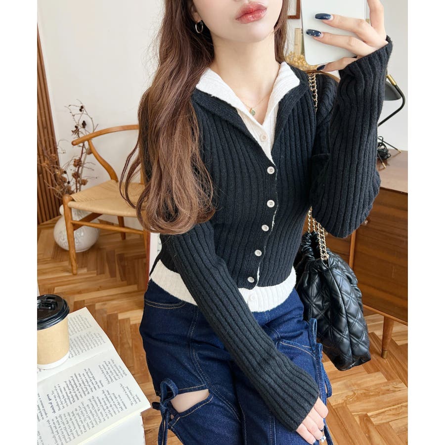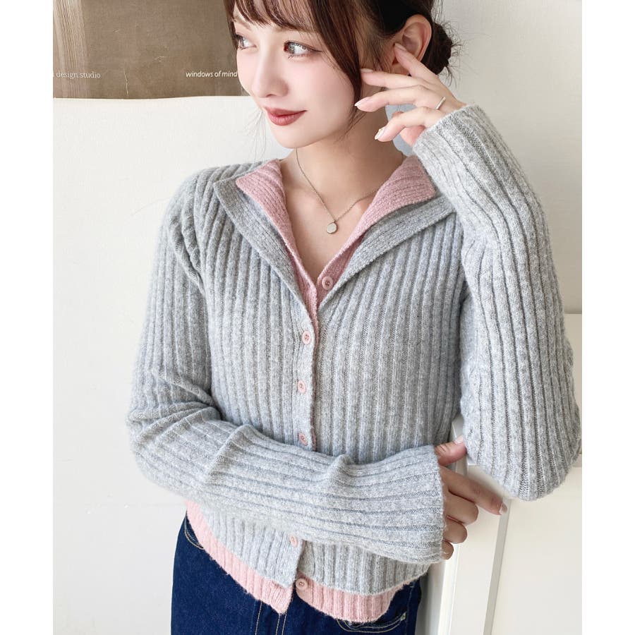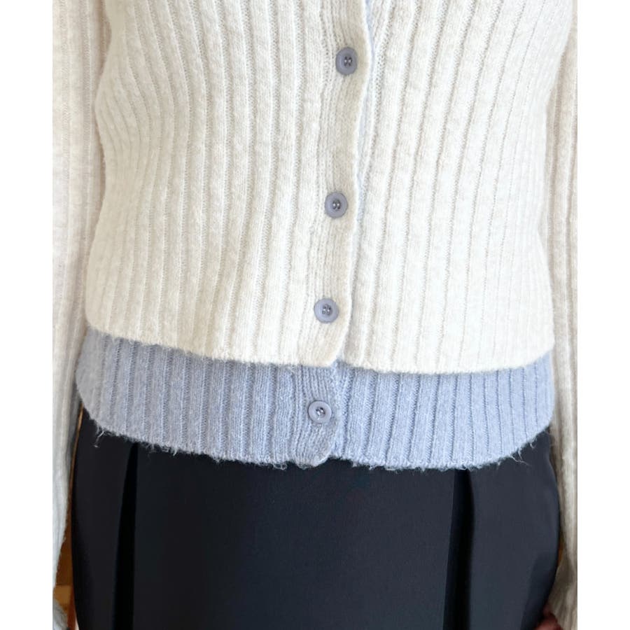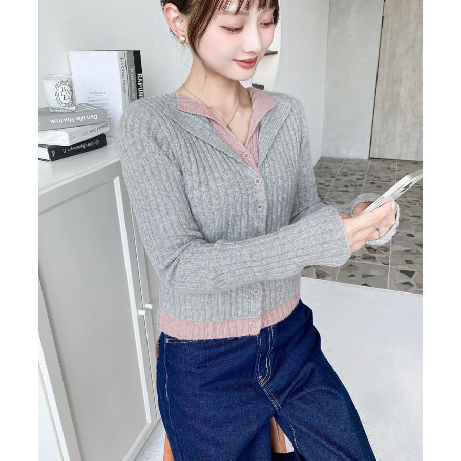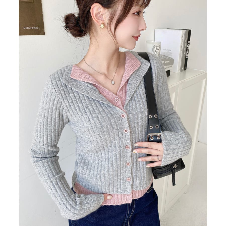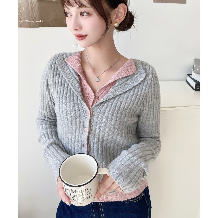 レイヤードカーディガン風リブニットトップス